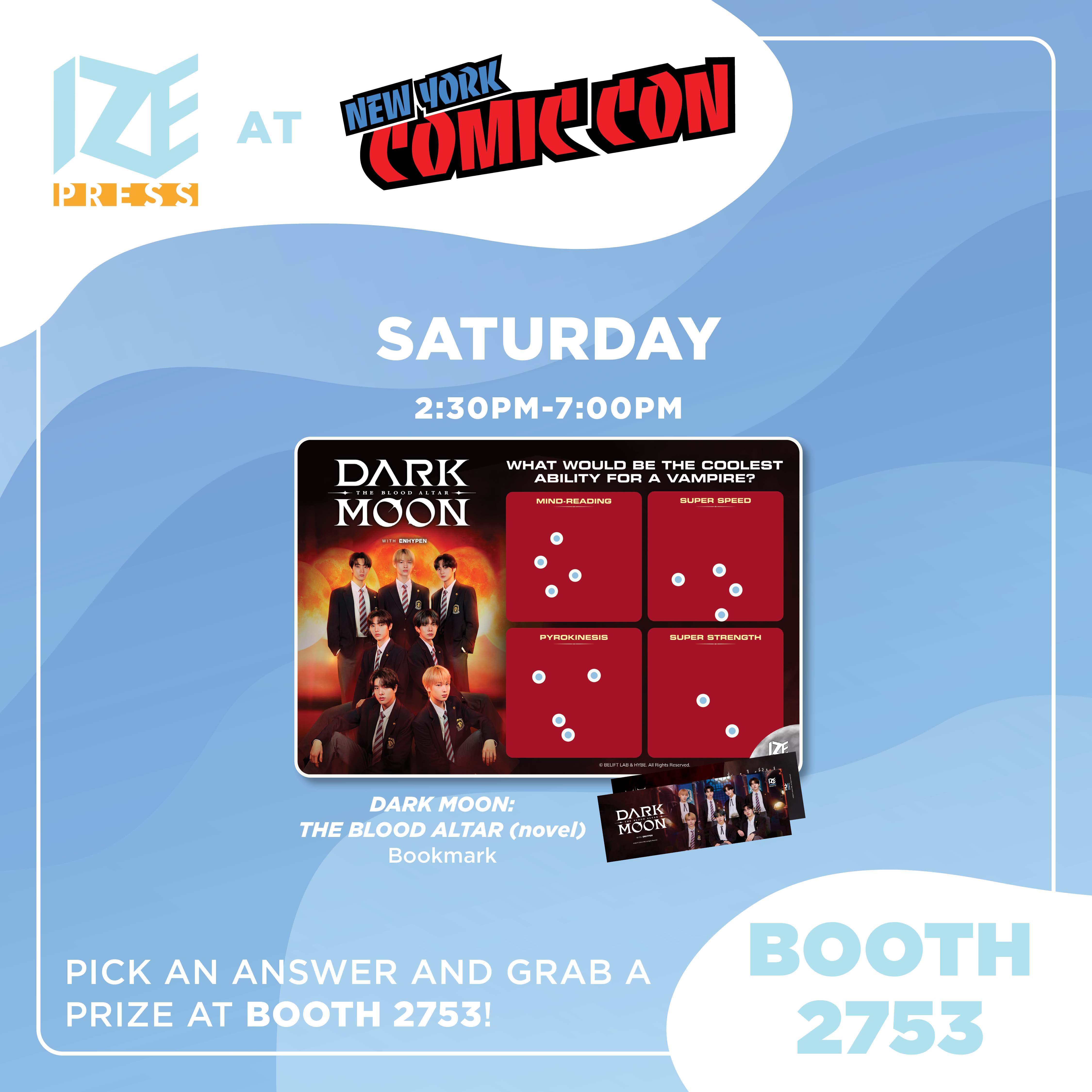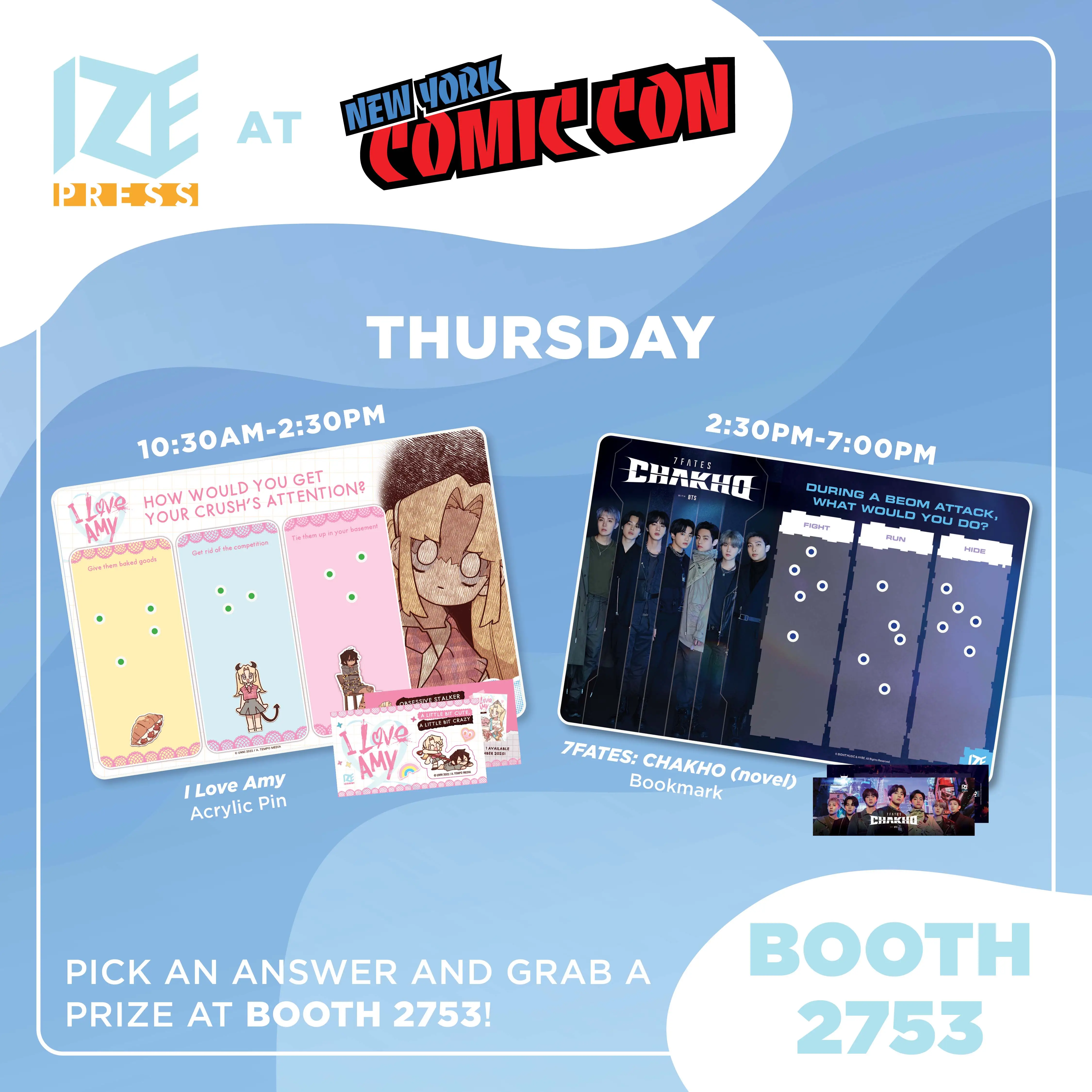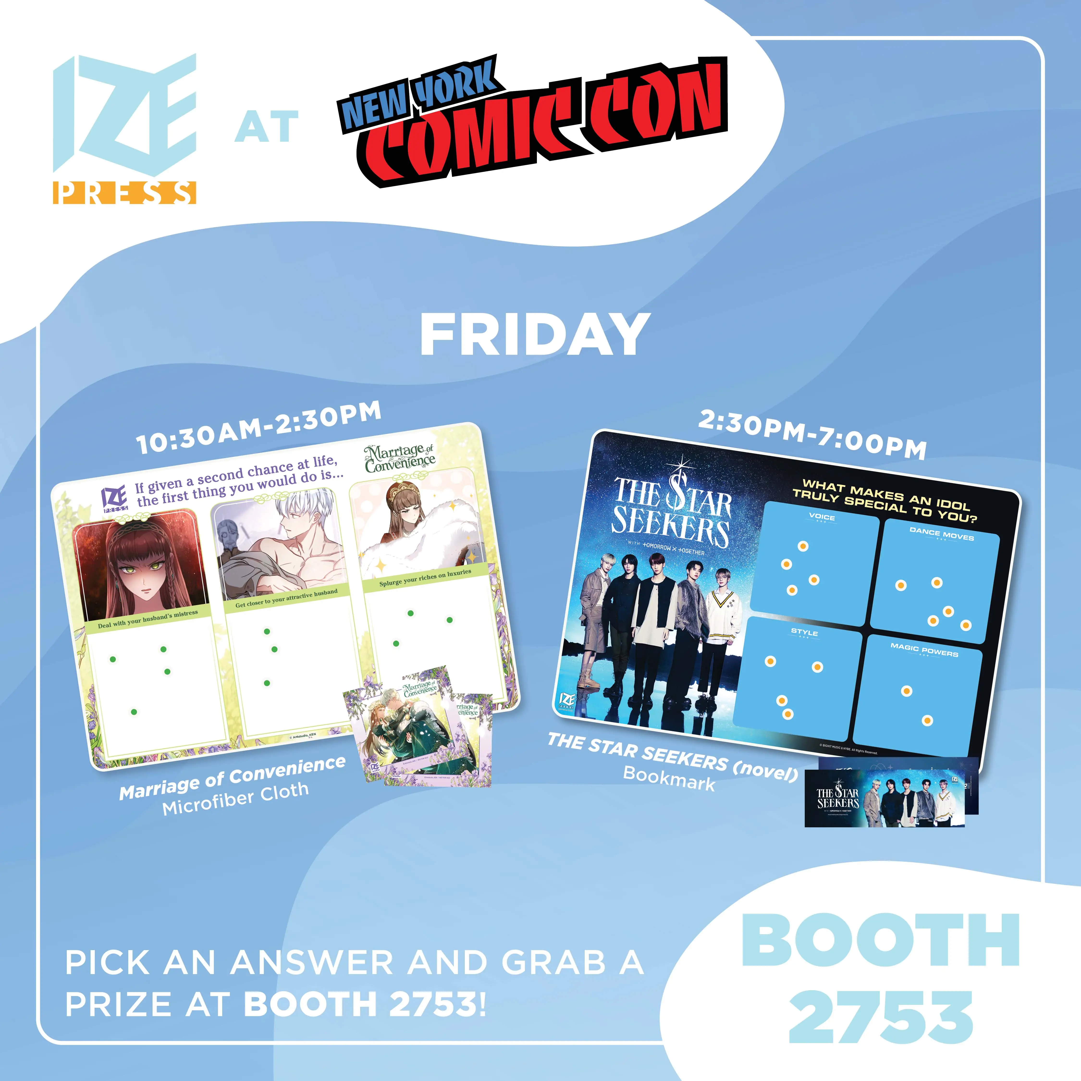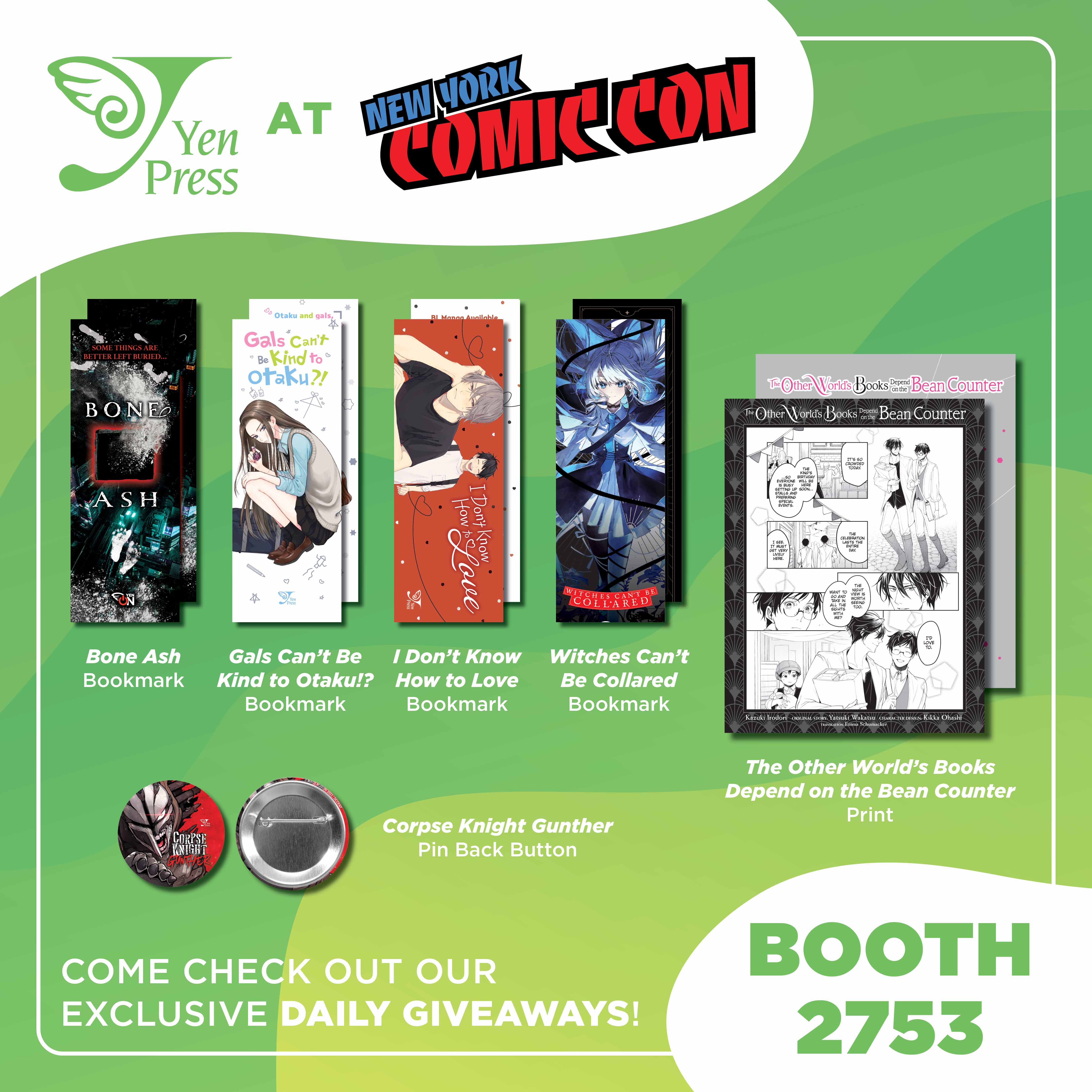 Along with early releases and fan-favorite books, you can stop by our booth for promotional freebies! Some are exclusive to one day, so check out the schedule below to plan out when to stop by:
