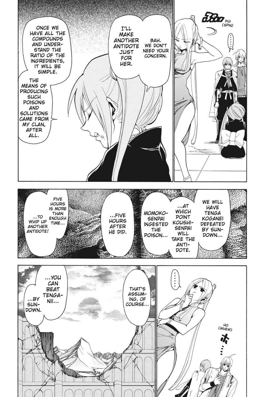 With three of the four antidote compounds in hand, Momoko and Koushi move on to face their most fearsome opponent yet - Tenga Koganei! As the poison creeps ever closer to her heart, Momoko falls to the fierce leader of the Tiger Clan. Recognizing that there is little glory in defeating a weakened warrior, Tenga willingly hands over the final ingredient of the concoction that will save Koushi and Momoko. But there's a catch: There is only enough antidote to save one of them!