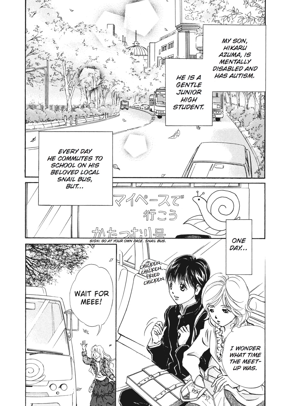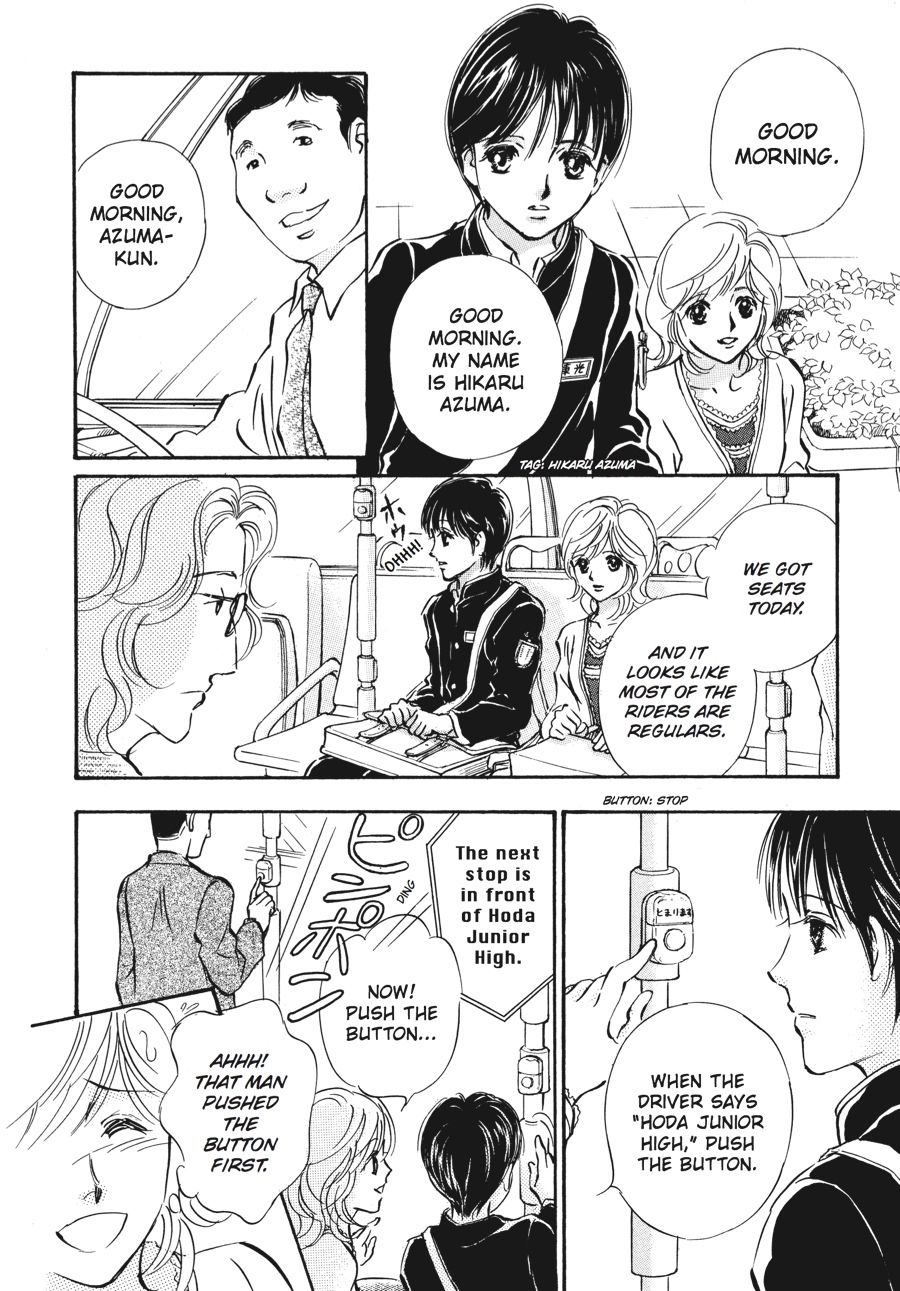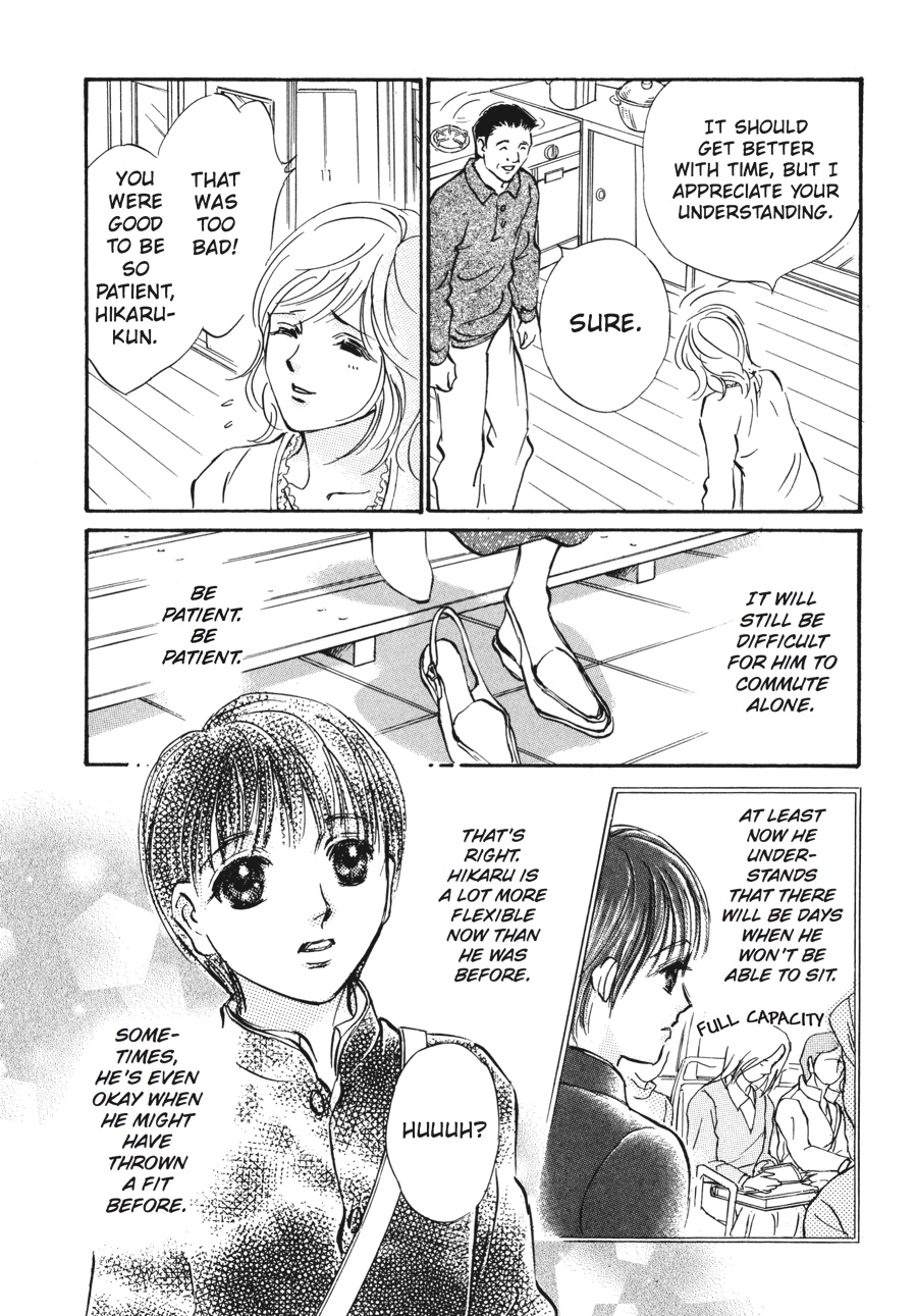 Hikaru is in Junior High School now, and he takes the community bus to get to school. For now, Sachiko needs to go with him everyday... Even though Hikaru is pretty much capable to ride the bus, there are still problems to deal with. Sometimes Hikaru gets upset because someone pushed the buzzer to stop first. Or there are days when he finds out that he can't sit down. But these problems are nothing compared to what he did to a lady sitting next to him...he sniffed her hair and touched it, causing her to freak out and treat Hikaru like a pervert!Something that wasn't a problem when Hikaru was younger becomes a major problem as he grows taller than Sachiko. How will Sachiko deal with this problem? A little hint from the Sunshine House gives her a creative idea to resolve it.