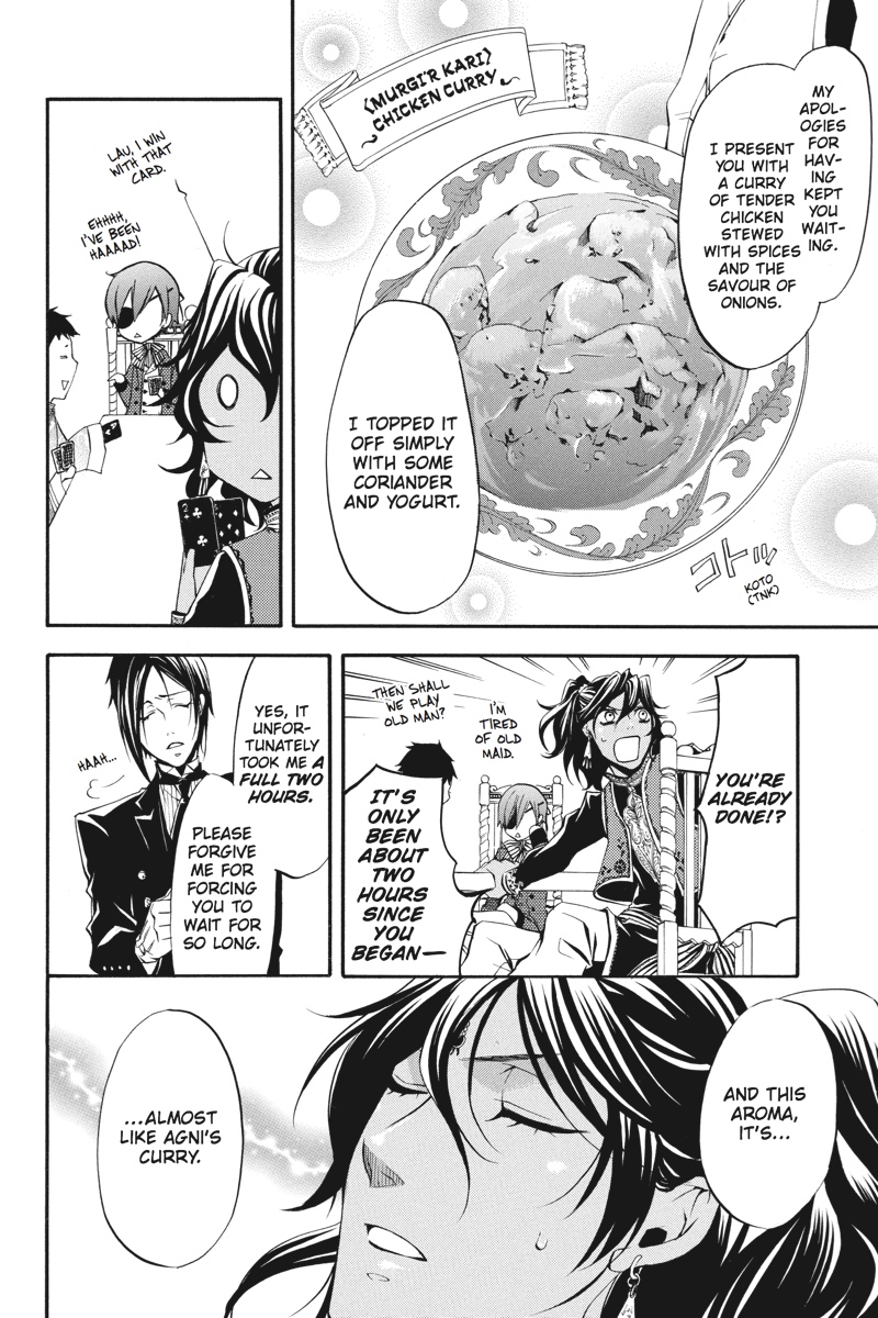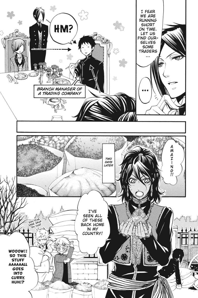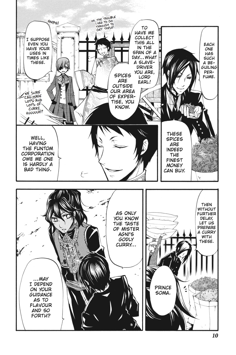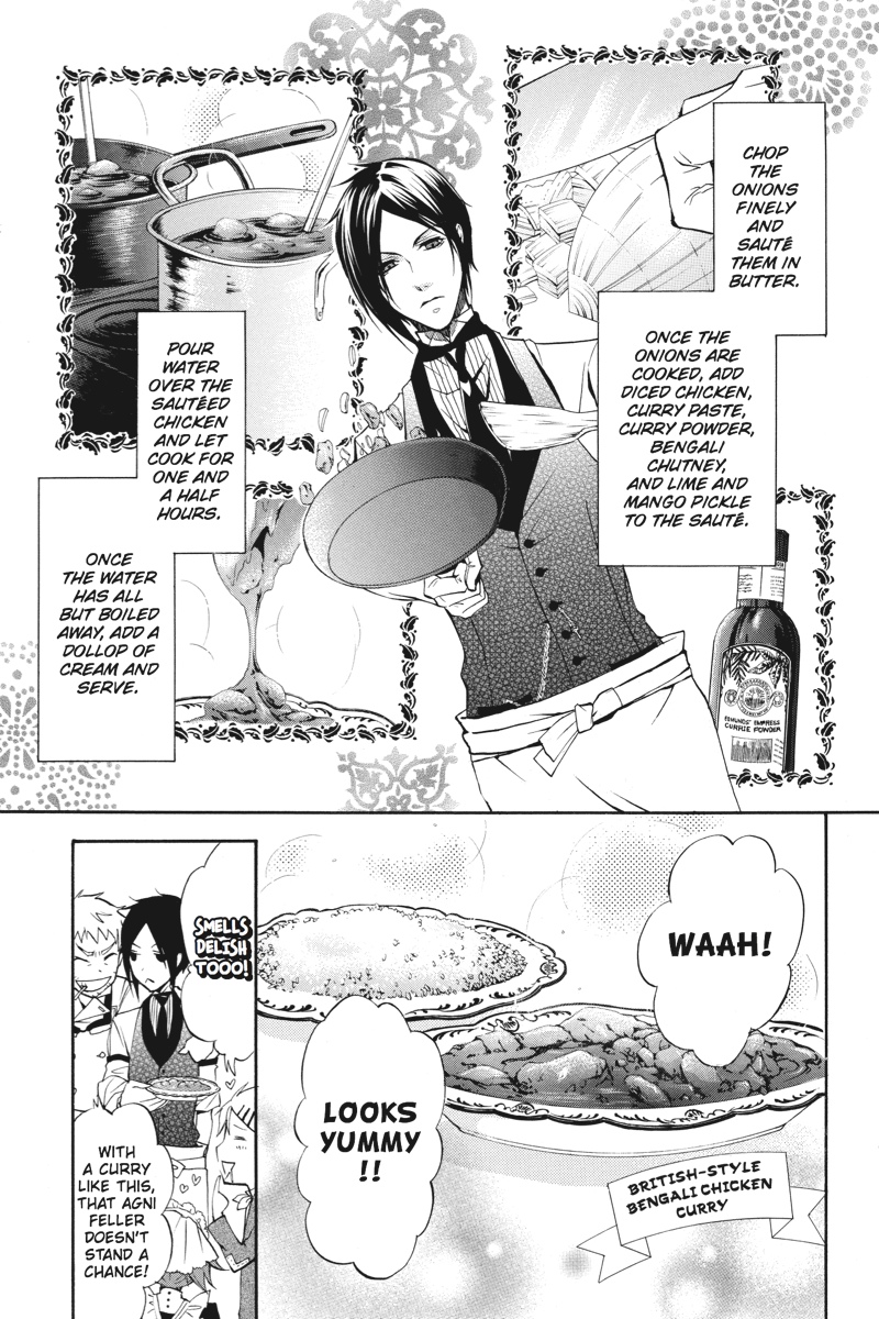 For an impeccable gentleman's butler like Sebastian Michaelis, the word "impossible" is just not in his vocabulary. Everything demanded of him under the English sun is well within his grasp. But do his talents extend to things under the scalding Indian sun?! As Harold West-Jeb's plan to use Agni, Prince Soma's superhuman butler, in a curry battle to win himself a Royal Warrant is exposed, Earl Ciel Phantomhive sets Sebastian to the task of creating an incomparable curry to defeat the despicable West-Jeb. But how can Ciel's devil of a butler possibly best Agni, the man with the Right Hand of God?!