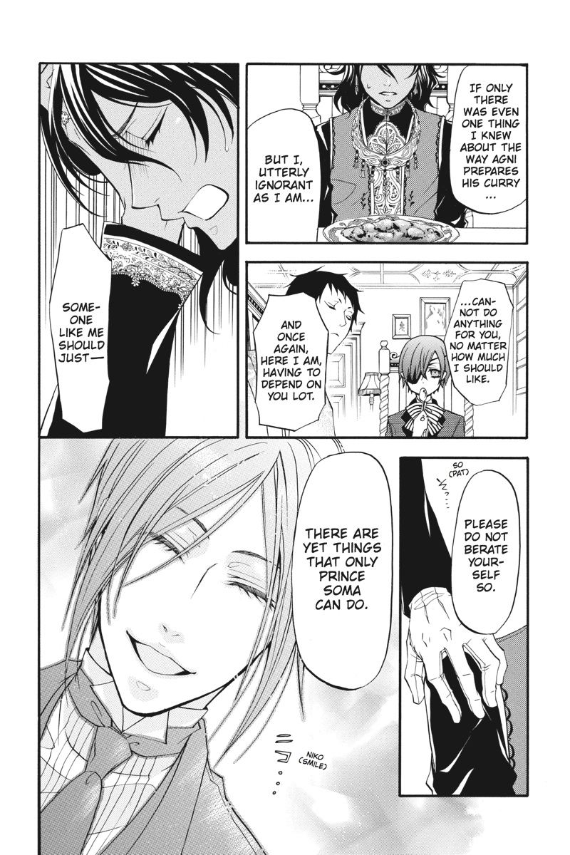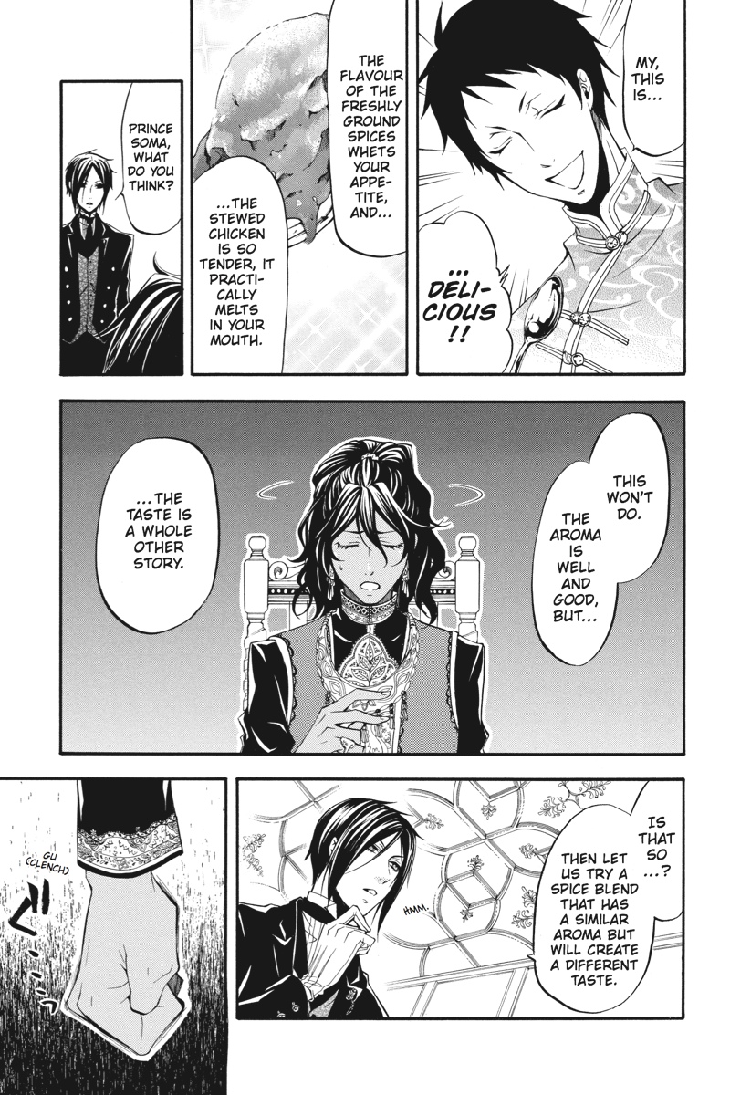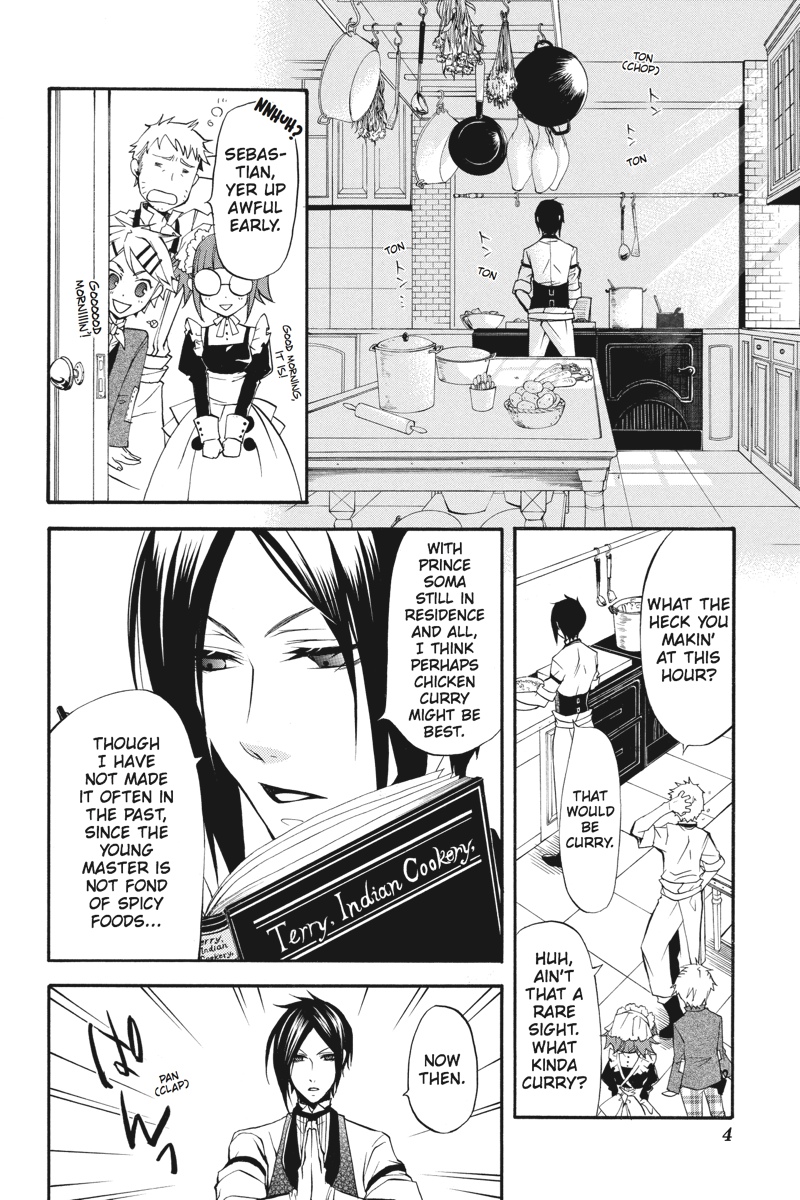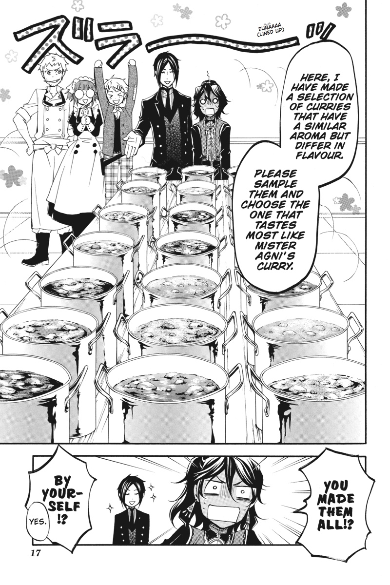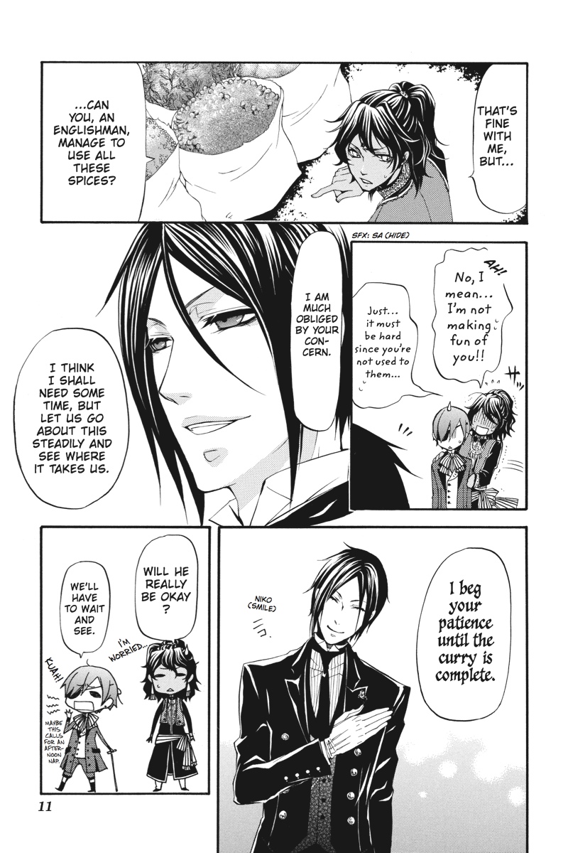 For an impeccable gentleman's butler like Sebastian Michaelis, the word "impossible" is just not in his vocabulary. Everything demanded of him under the English sun is well within his grasp. But do his talents extend to things under the scalding Indian sun?! As Harold West-Jeb's plan to use Agni, Prince Soma's superhuman butler, in a curry battle to win himself a Royal Warrant is exposed, Earl Ciel Phantomhive sets Sebastian to the task of creating an incomparable curry to defeat the despicable West-Jeb. But how can Ciel's devil of a butler possibly best Agni, the man with the Right Hand of God?!