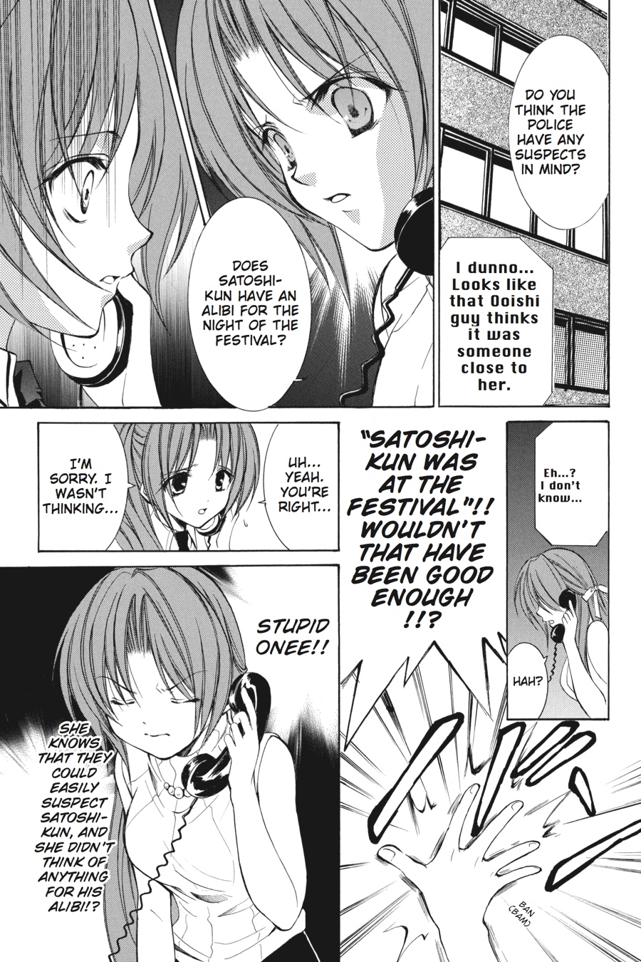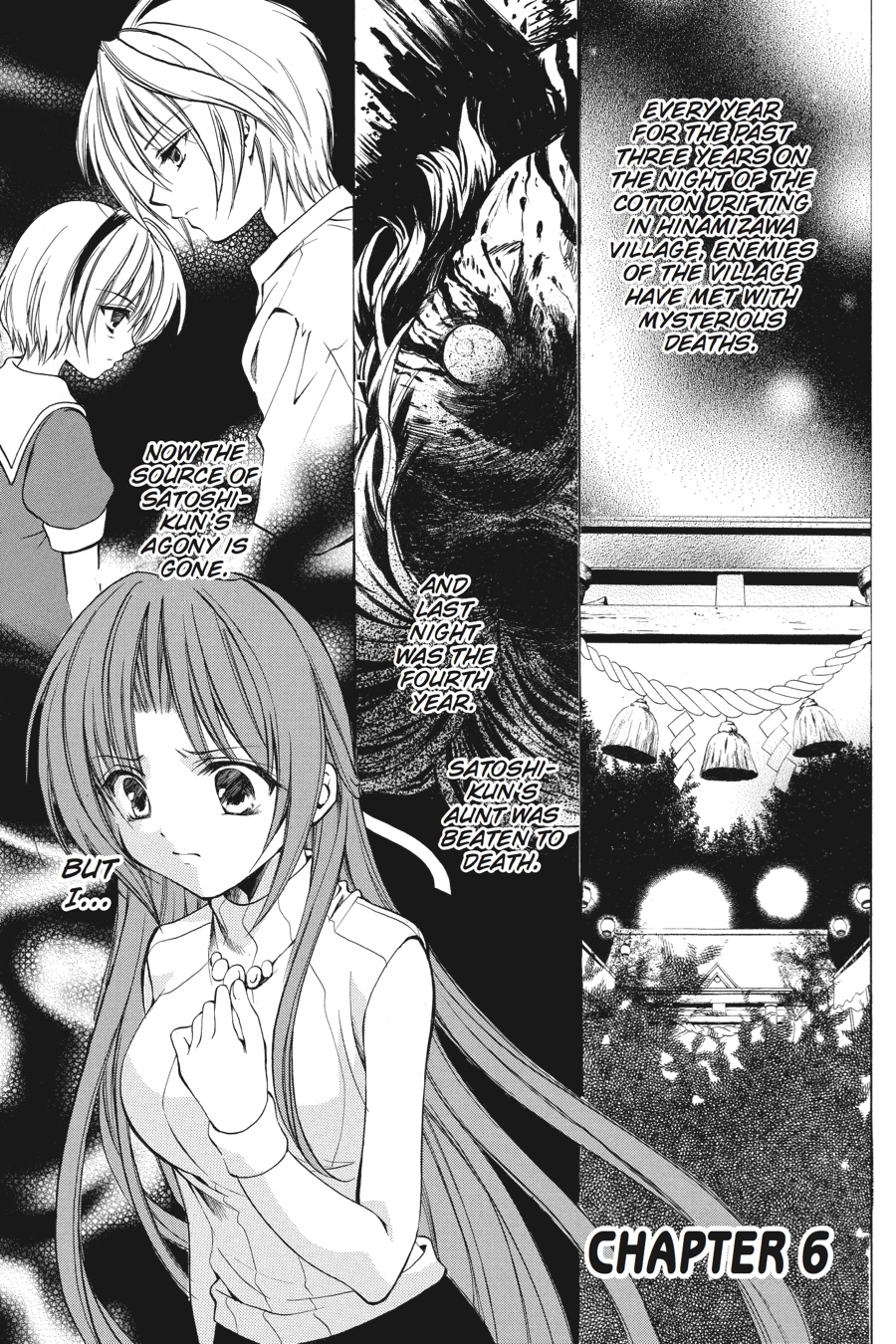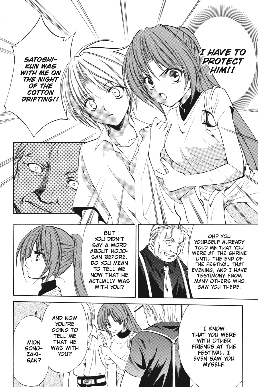 The long-awaited "answer arc" to the Higurashi WHEN THEY CRY Cotton Drifting Arc: Unable to provide an alibi for the night of the Cotton Drifting, Satoshi becomes the prime suspect for the murder of his aunt! As her friend is hauled away by the police, Shion steps forward as a witness to Satoshi's whereabouts that night, exposing her true identity in the process. Shion may have saved Satoshi this time, but her actions have put her in serious danger. What will the Sonozaki family do to Shion when they learn of her association with Satoshi Hojo? And what will they do to Satoshi?
