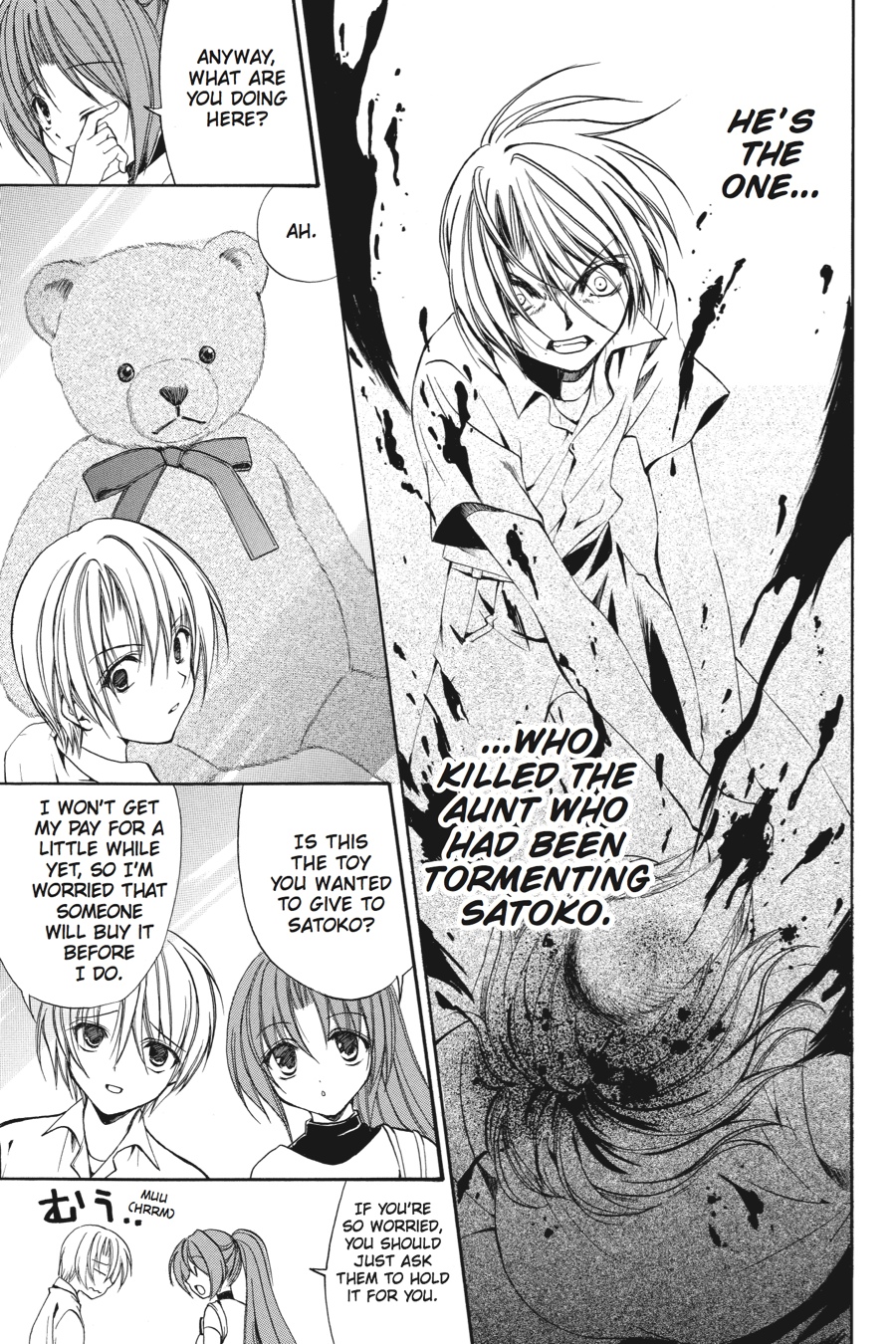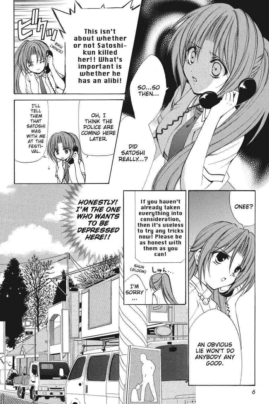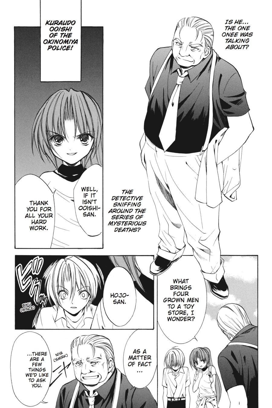 The long-awaited "answer arc" to the Higurashi WHEN THEY CRY Cotton Drifting Arc: Unable to provide an alibi for the night of the Cotton Drifting, Satoshi becomes the prime suspect for the murder of his aunt! As her friend is hauled away by the police, Shion steps forward as a witness to Satoshi's whereabouts that night, exposing her true identity in the process. Shion may have saved Satoshi this time, but her actions have put her in serious danger. What will the Sonozaki family do to Shion when they learn of her association with Satoshi Hojo? And what will they do to Satoshi?