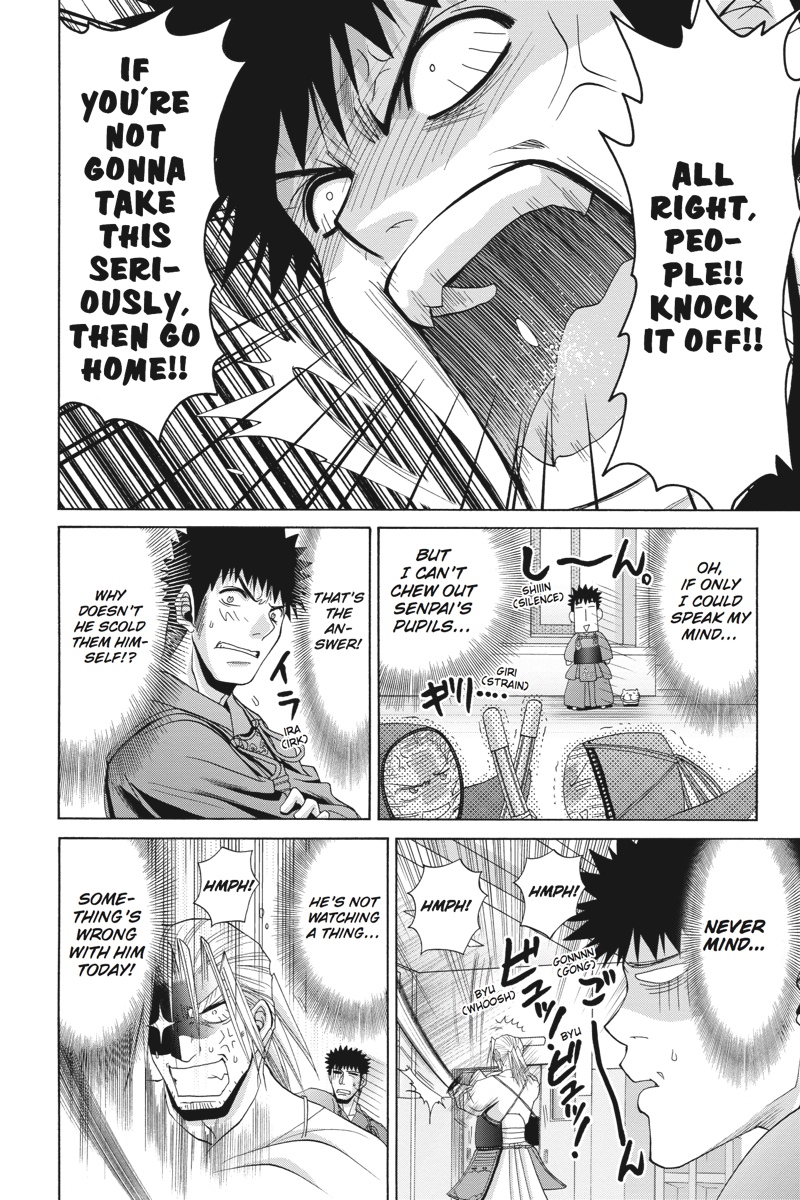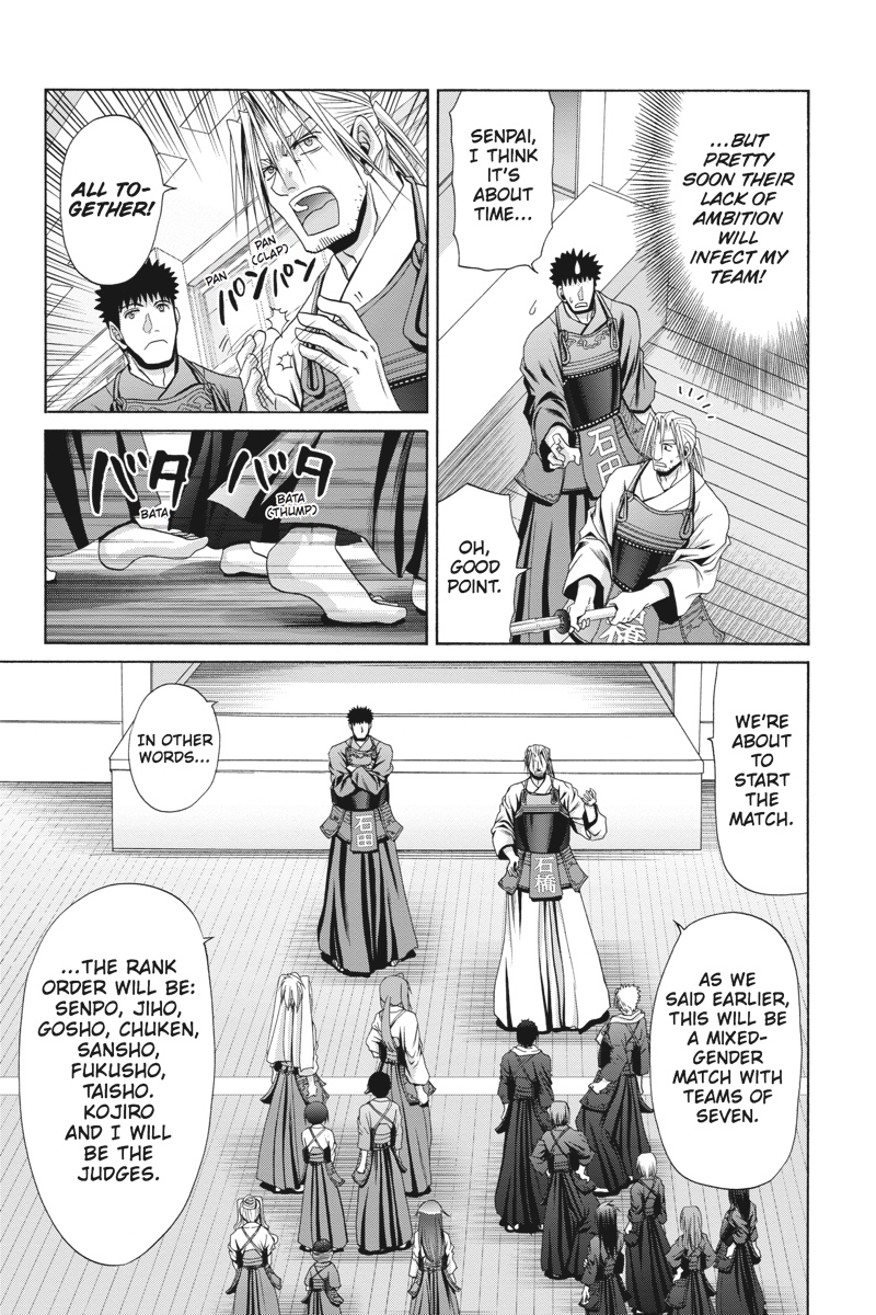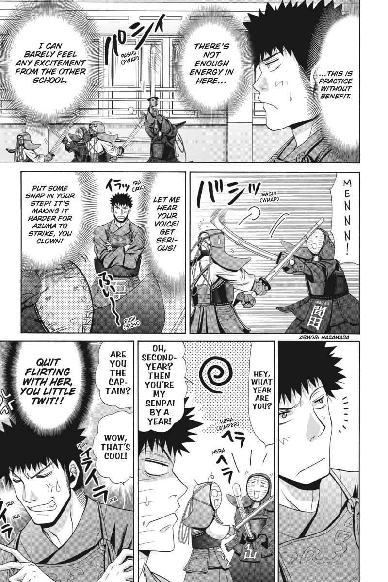 After their disciplined training, the Muroe High kendo team is ready for action on the day of the practice meet. Their opponents from Kamasaki High, however, hardly seem pumped for competition. As the matches proceed and the scores are tallied, will even Ishibaki's pupils find the passion for victory burning quietly within their neglected armor? And after all of the students have had their say, it's time for high school rivals Ishibaki and Kojiro to take the floor once again in their first battle since Kojiro's trophy-winning victory all those years ago!!!