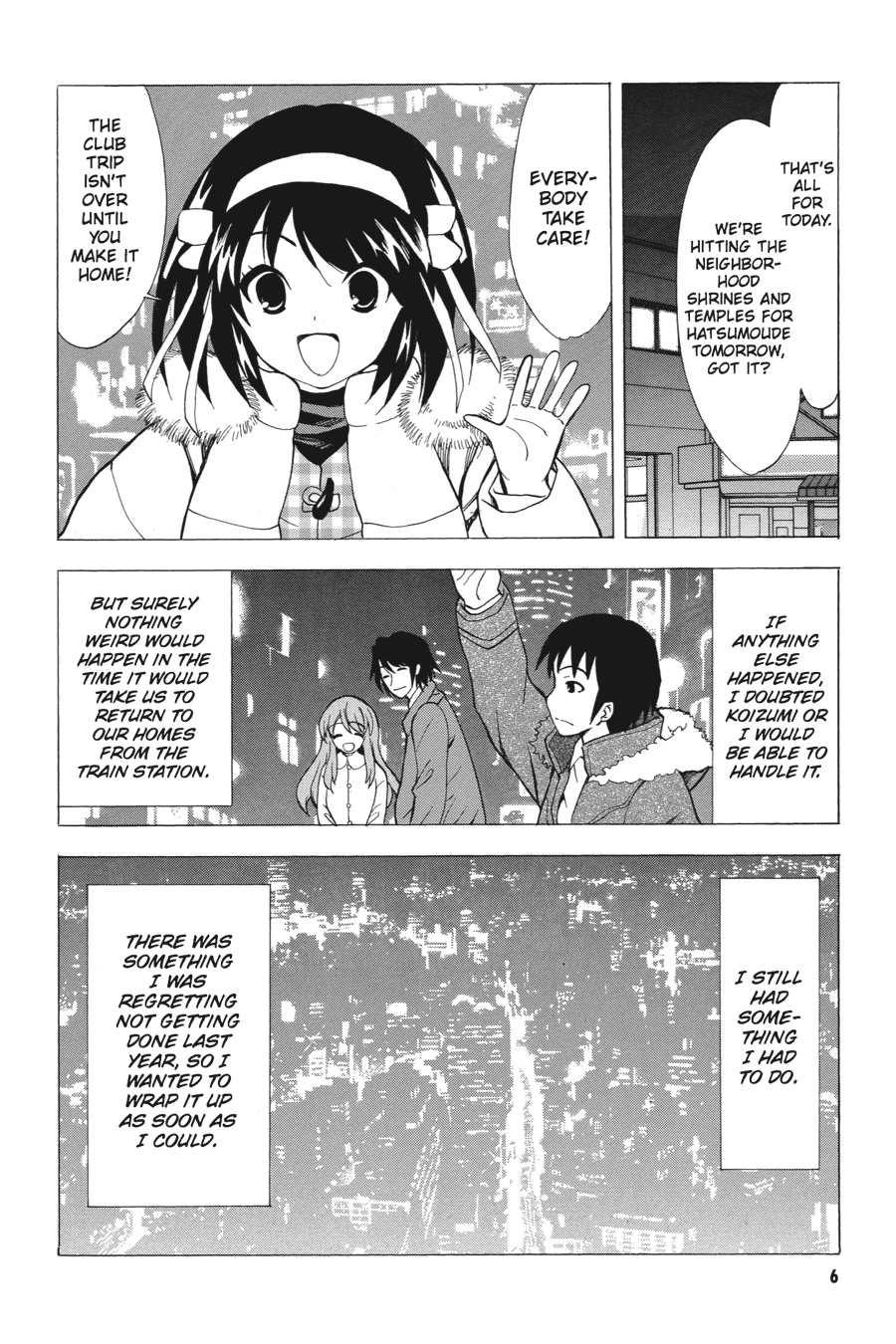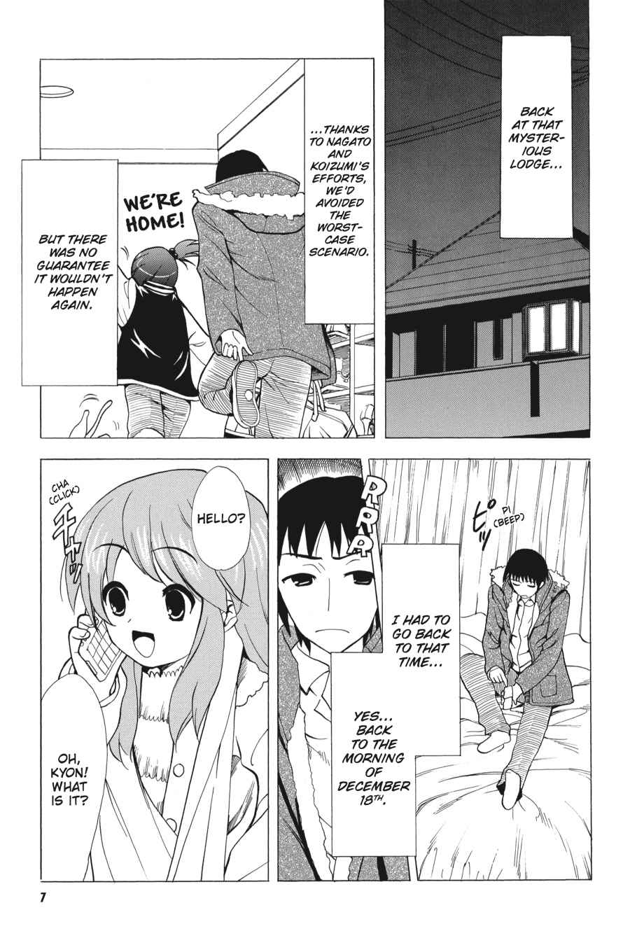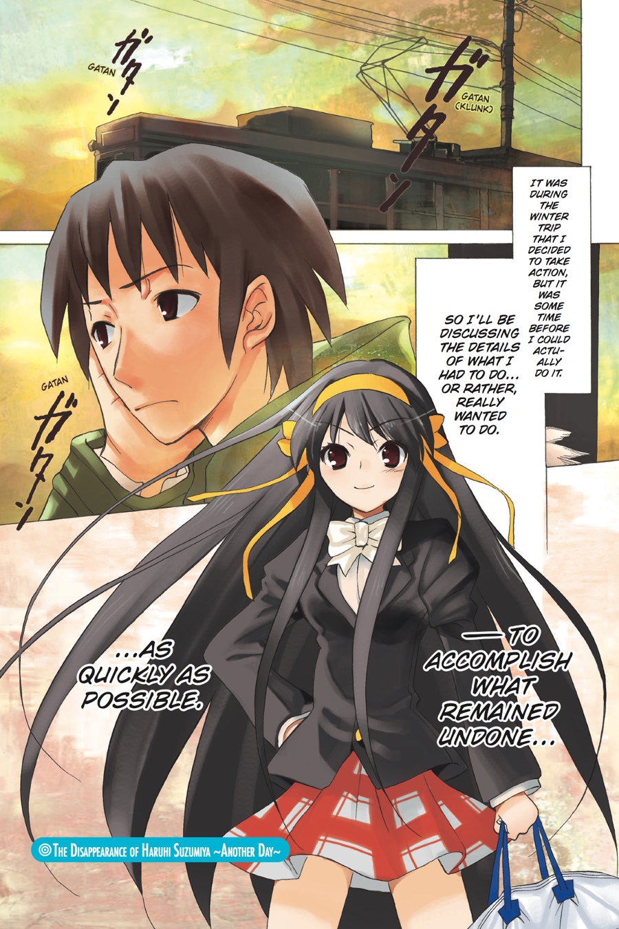 Kyon knew it was only a matter of time before he would have to return to December 18th of the previous year, to the three days when the SOS Brigade and his supernatural friends suddenly disappeared. Back then, Kyon was cruelly stabbed by alien rogue Ryouko Asakura and nearly bled out on the school roof. How will he fare this time around?