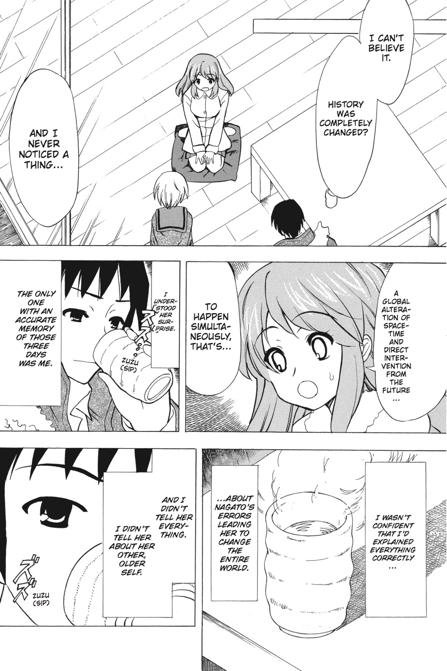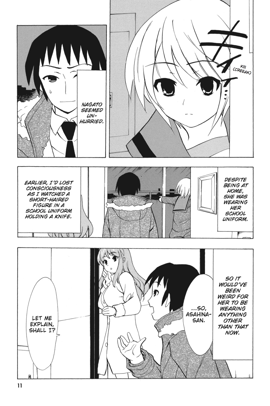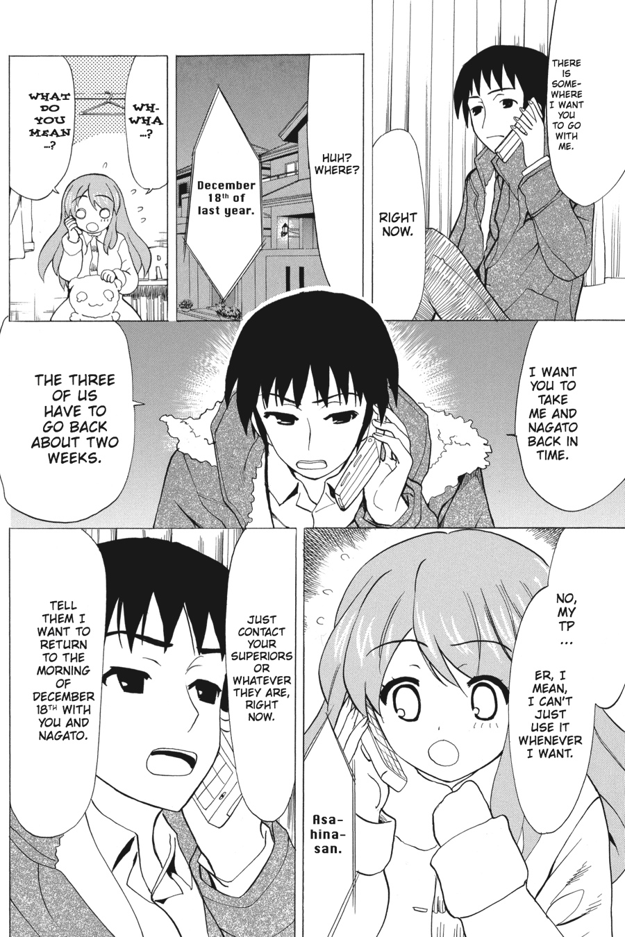 Kyon knew it was only a matter of time before he would have to return to December 18th of the previous year, to the three days when the SOS Brigade and his supernatural friends suddenly disappeared. Back then, Kyon was cruelly stabbed by alien rogue Ryouko Asakura and nearly bled out on the school roof. How will he fare this time around?