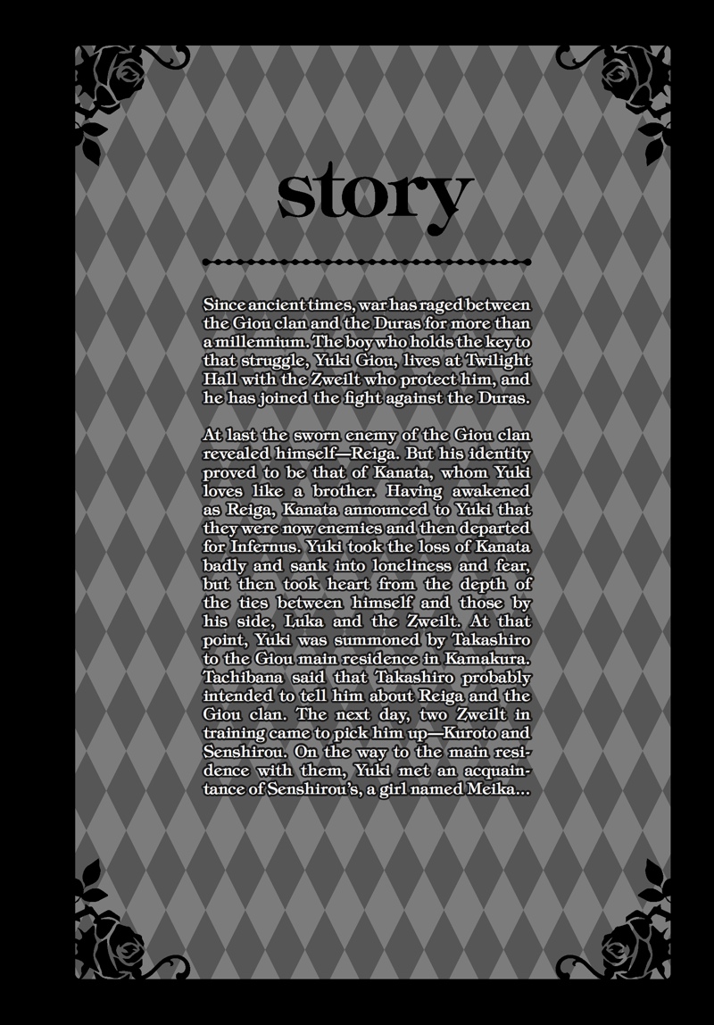 Despite finally learning more about the "Sunset of the Underworld" a thousand years past, Yuki finds his thoughts returning once more to his former friend and current enemy Kanata . . . But while Yuki may be new to picking sides in a centuries-old war, it is nothing new to the Zweilt. And Kuroto and Senshirou, the new Zweilt pair Yuki has only just encountered, harbor a profound hatred for Opasts, swearing revenge on one in particular. What happened four years ago to inspire such loathing? As Yuki bears witness to the flames of revenge that burn in the hearts of those around him, how will his own heart respond to the betrayal that he cannot forget?