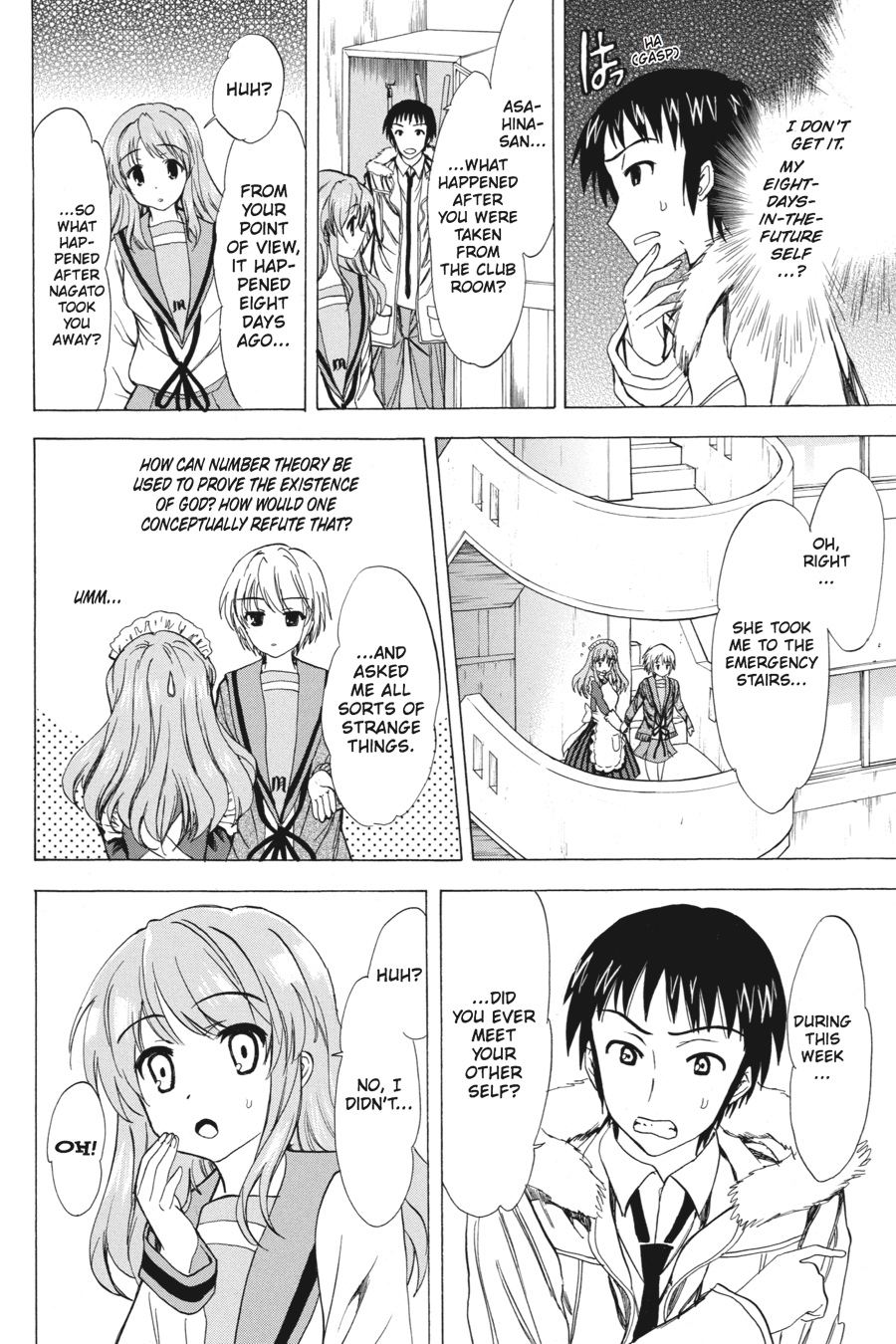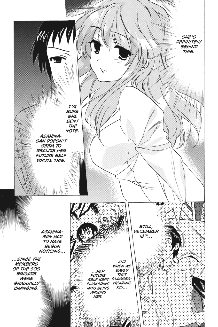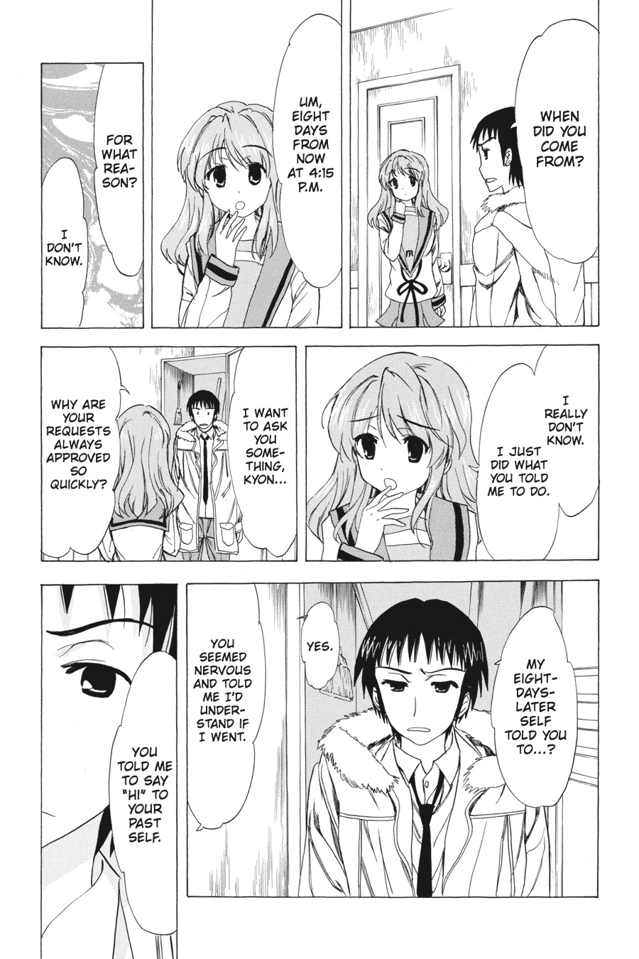 Guided only by a series of notes that direct him to do the most inexplicable things-"Buy a small turtle and throw it into the lake"?-Kyon and the Mikuru from eight days in the future complete the assigned tasks, hoping that things will become clear as the SOS Brigade's adventures for that week continue. But Kyon and Mikuru's scavenger hunt soon turns to a manhunt when Mikuru is kidnapped by a group of rogue espers, time travelers, and aliens!