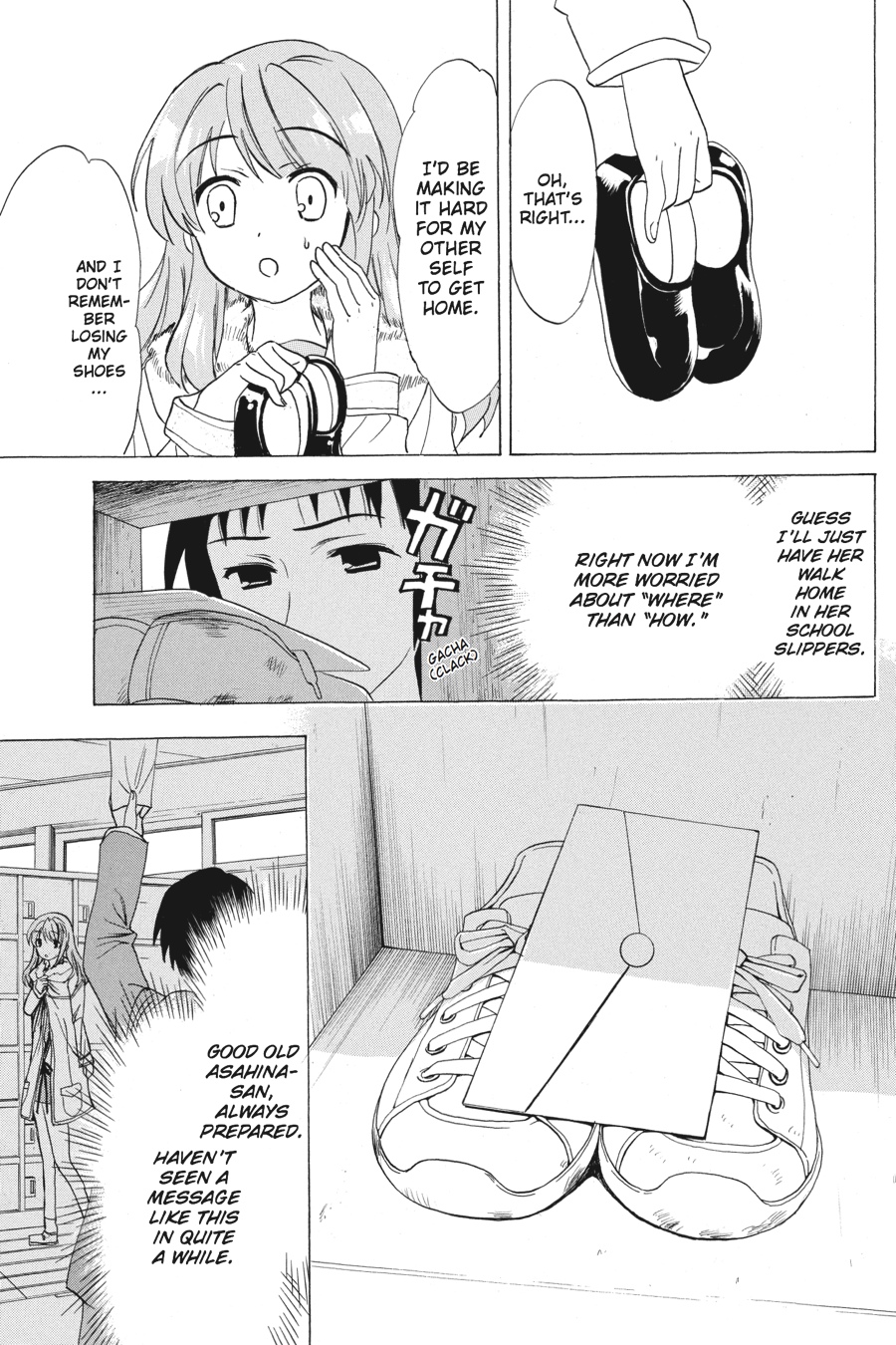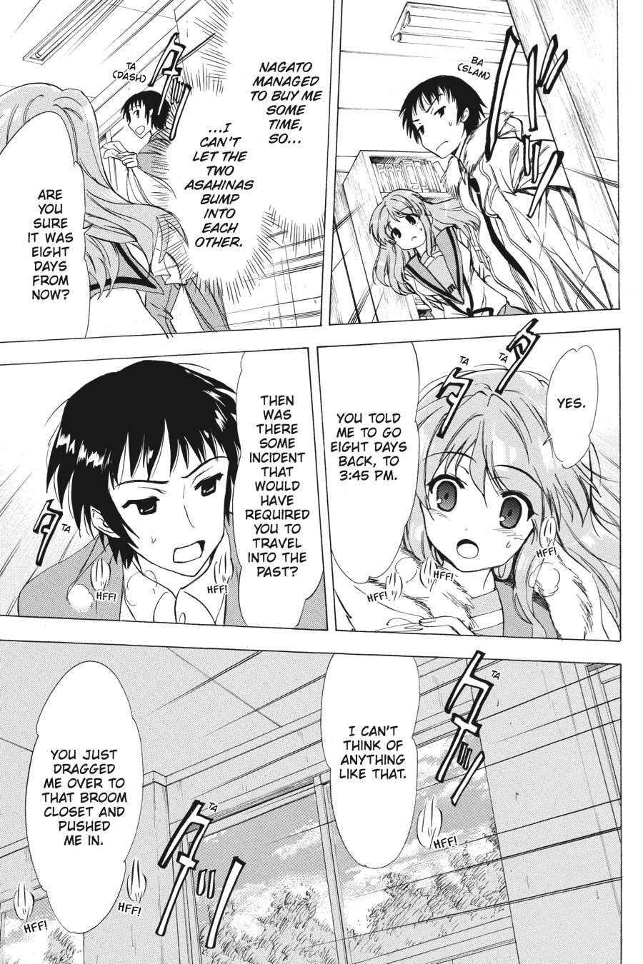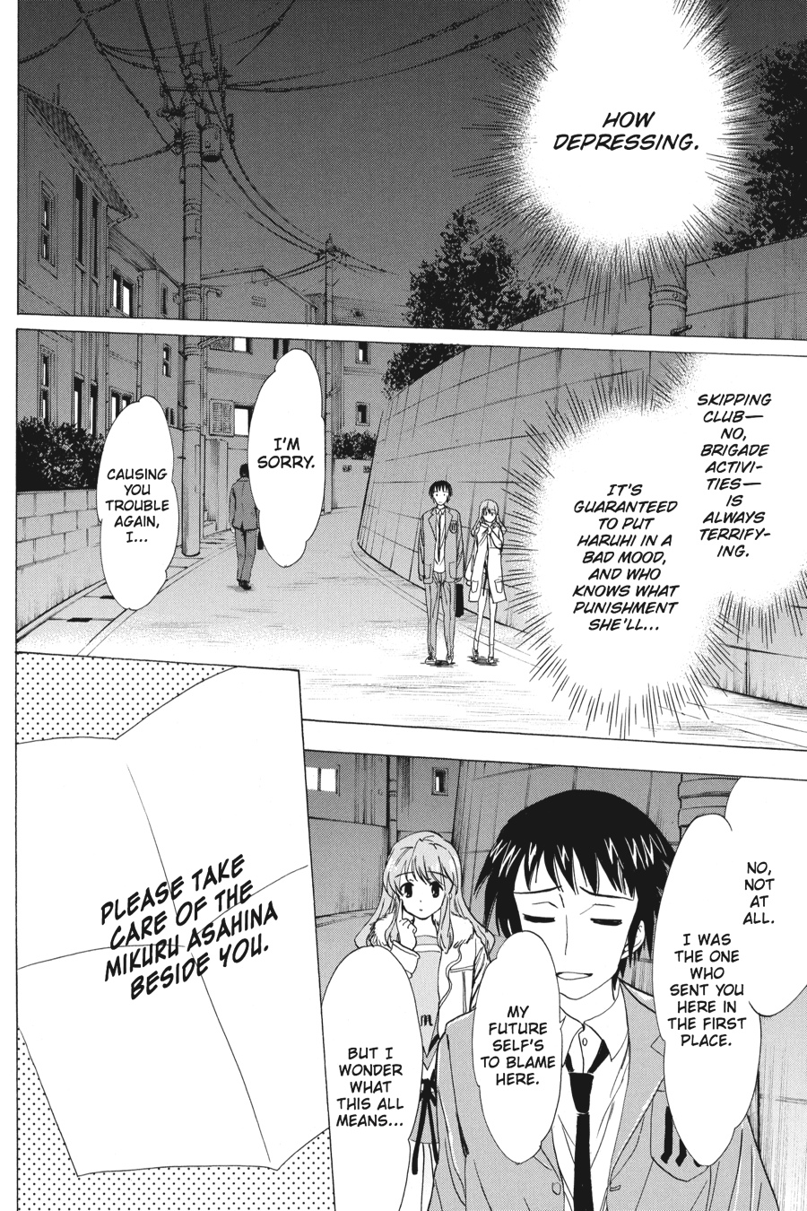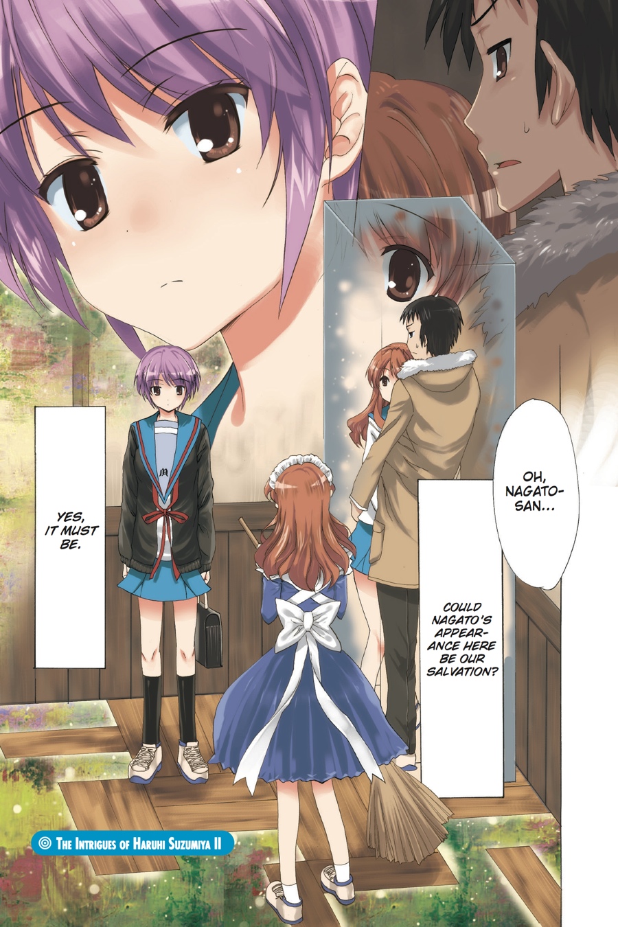 Guided only by a series of notes that direct him to do the most inexplicable things-"Buy a small turtle and throw it into the lake"?-Kyon and the Mikuru from eight days in the future complete the assigned tasks, hoping that things will become clear as the SOS Brigade's adventures for that week continue. But Kyon and Mikuru's scavenger hunt soon turns to a manhunt when Mikuru is kidnapped by a group of rogue espers, time travelers, and aliens!