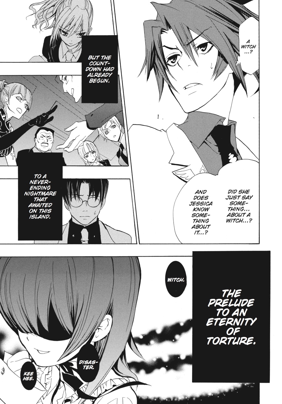 Each year, the Ushiromiya family gathers at the secluded mansion of its patriarch, the elderly Kinzo. It has been six years since Battler joined his cousins at the annual event, but their happy reunion is overshadowed by worsening weather and an eerie premonition from his youngest cousin-not to mention their parents' feud over the inheritance. Battler doesn't hold much stock in dark omens, nor does he believe the tales of the witch rumored to have given his grandfather a fortune in gold...and who walks the halls of the mansion to this day... But when the eighteen family members and servants are trapped on the island by the raging typhoon, the grisly events that follow leave Battler shaken to his core. Is one of his relatives desperate enough to kill for the family fortune? Or is this the work of the Golden Witch?