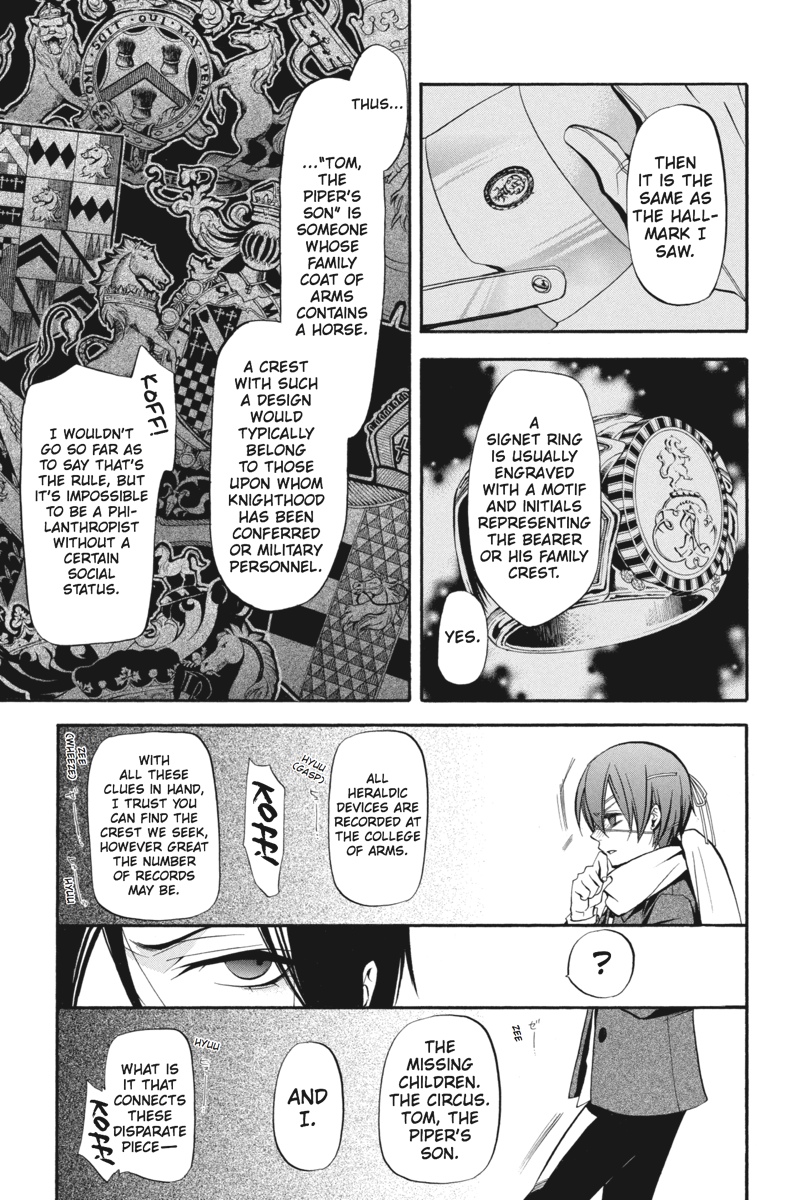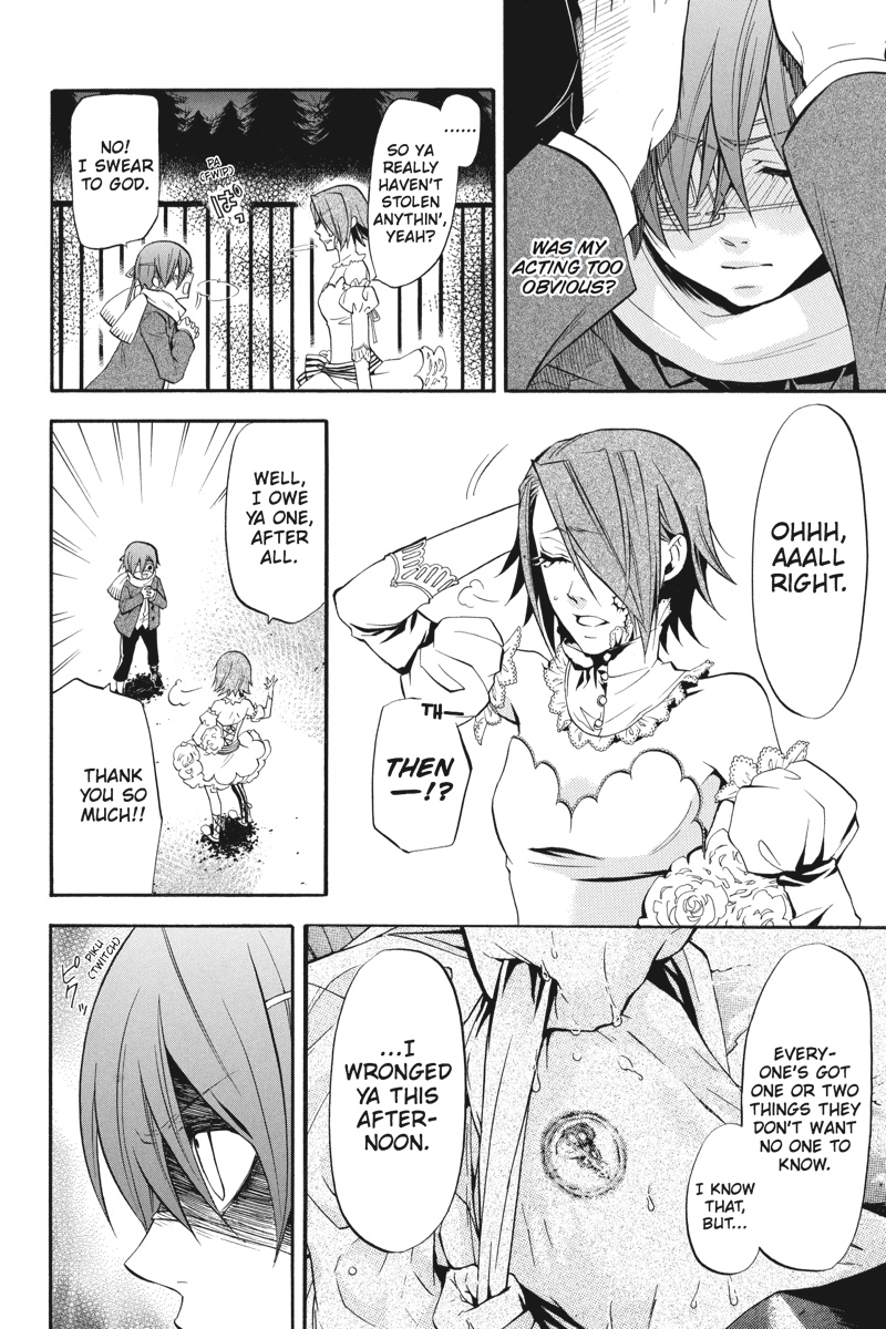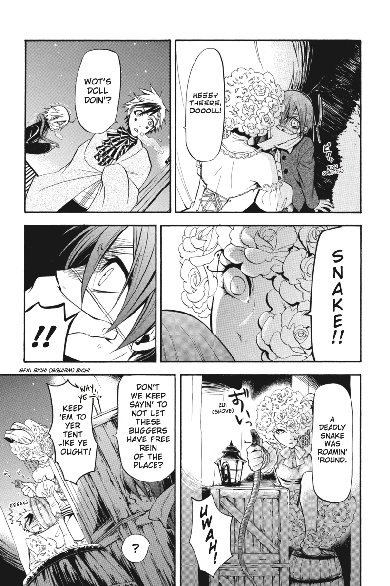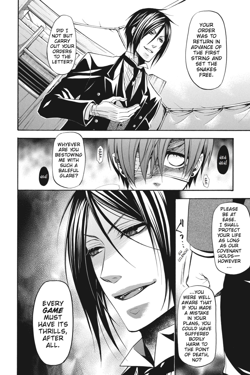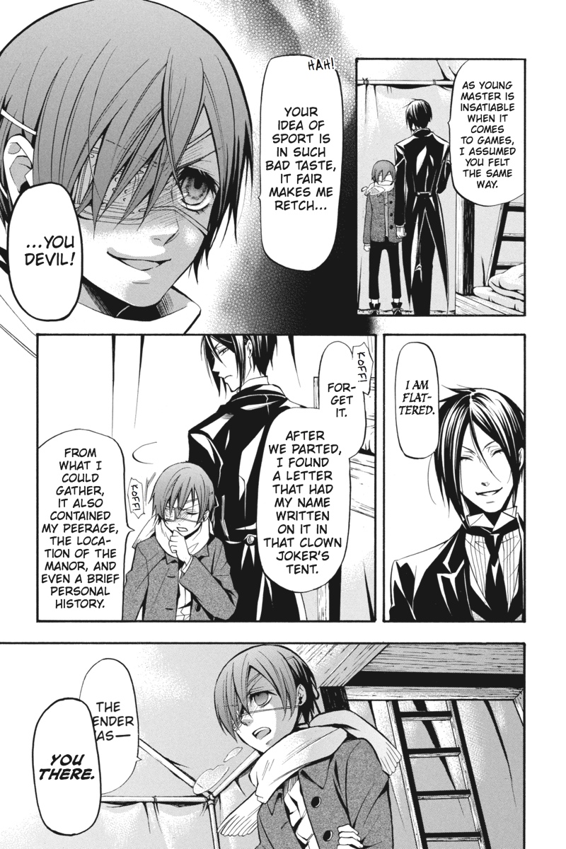 Having successfully infiltrated the Noah's Ark Circus in the guise of rookie performers, Earl Ciel Phantomhive and his butler, Sebastian, set about gathering clues backstage as to the whereabouts of the missing children. But when a turn at a snooping puts Ciel on the trail of a man whose identity is shrouded in mystery, he sets his consummate manservant to the task of investigating further. This time, however, Sebastian must call upon one of the more infamously wicked skills of his kind to solve the puzzle. As he stalks his vulnerable prey in the shadows of the fairgrounds, is his young master prepared for where the ill-gotten gains of his butler's methods will lead?