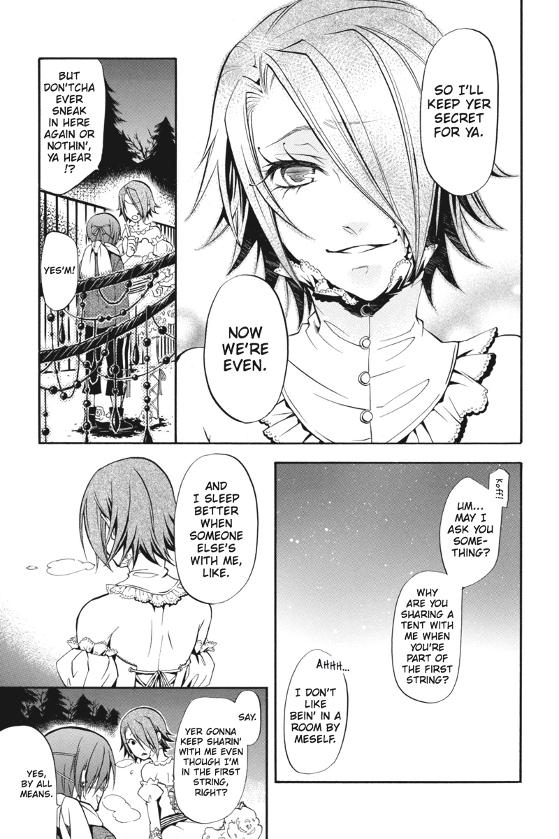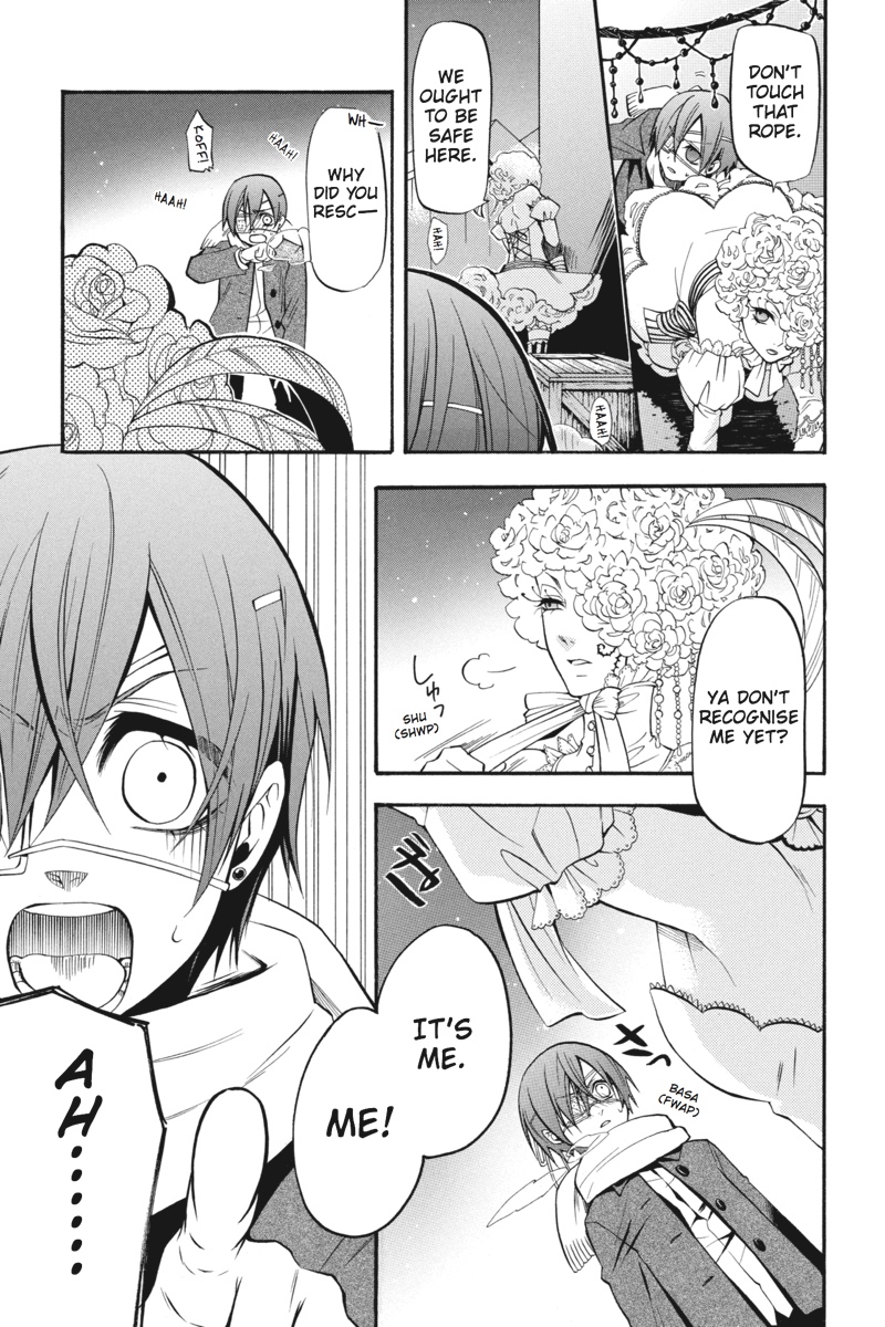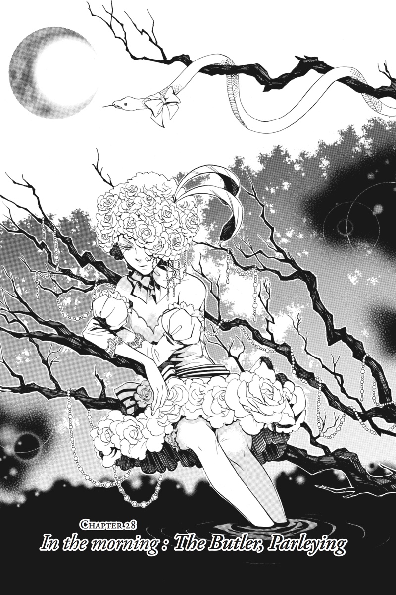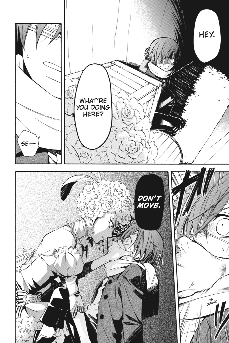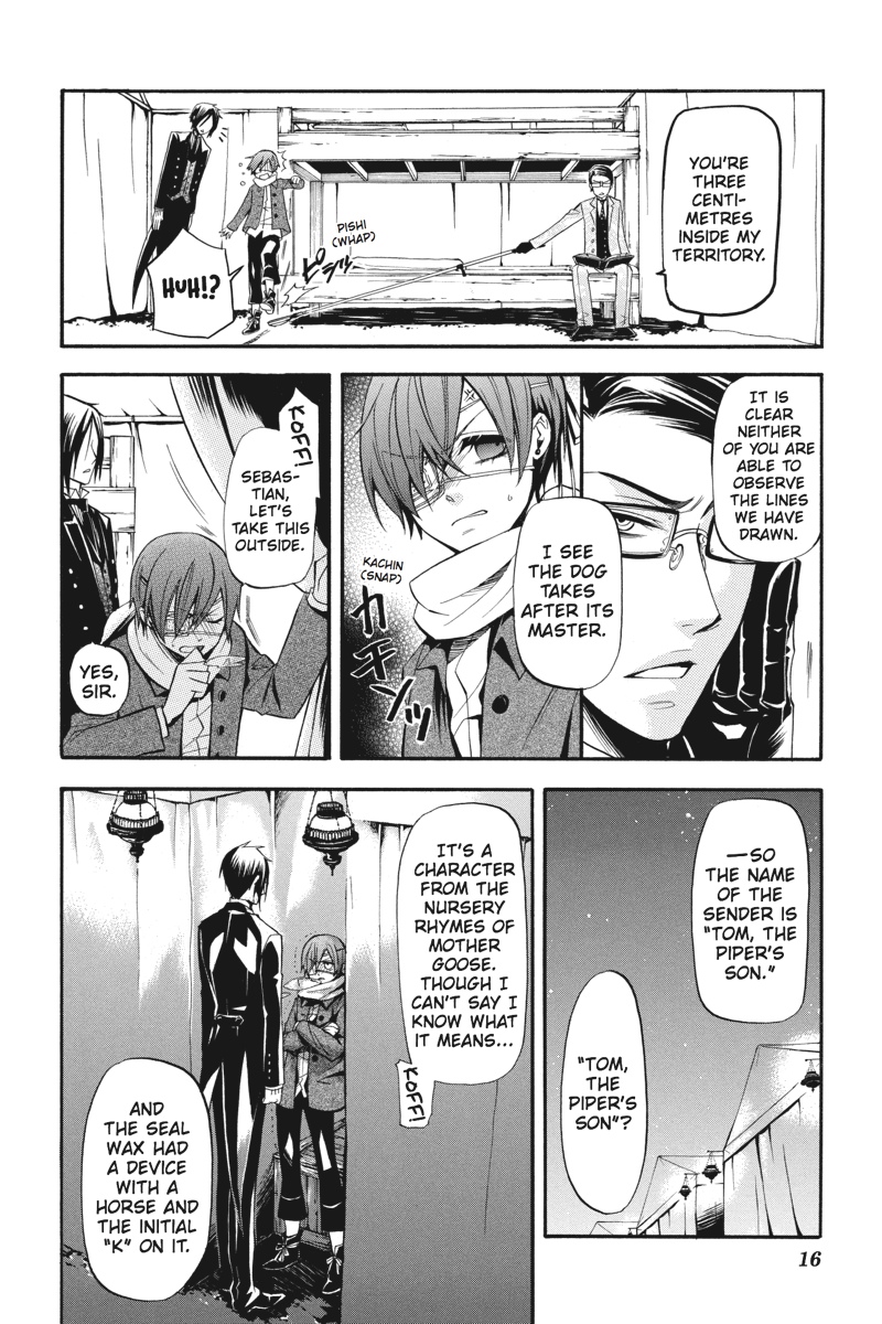 Having successfully infiltrated the Noah's Ark Circus in the guise of rookie performers, Earl Ciel Phantomhive and his butler, Sebastian, set about gathering clues backstage as to the whereabouts of the missing children. But when a turn at a snooping puts Ciel on the trail of a man whose identity is shrouded in mystery, he sets his consummate manservant to the task of investigating further. This time, however, Sebastian must call upon one of the more infamously wicked skills of his kind to solve the puzzle. As he stalks his vulnerable prey in the shadows of the fairgrounds, is his young master prepared for where the ill-gotten gains of his butler's methods will lead?