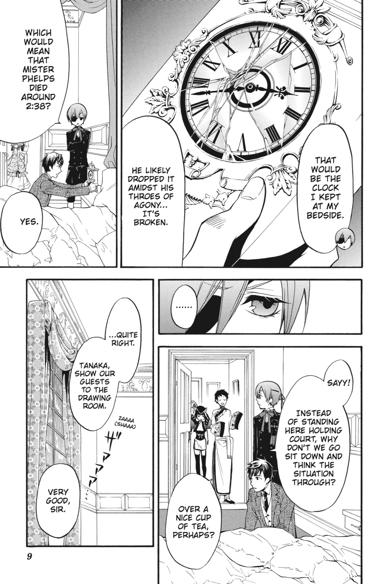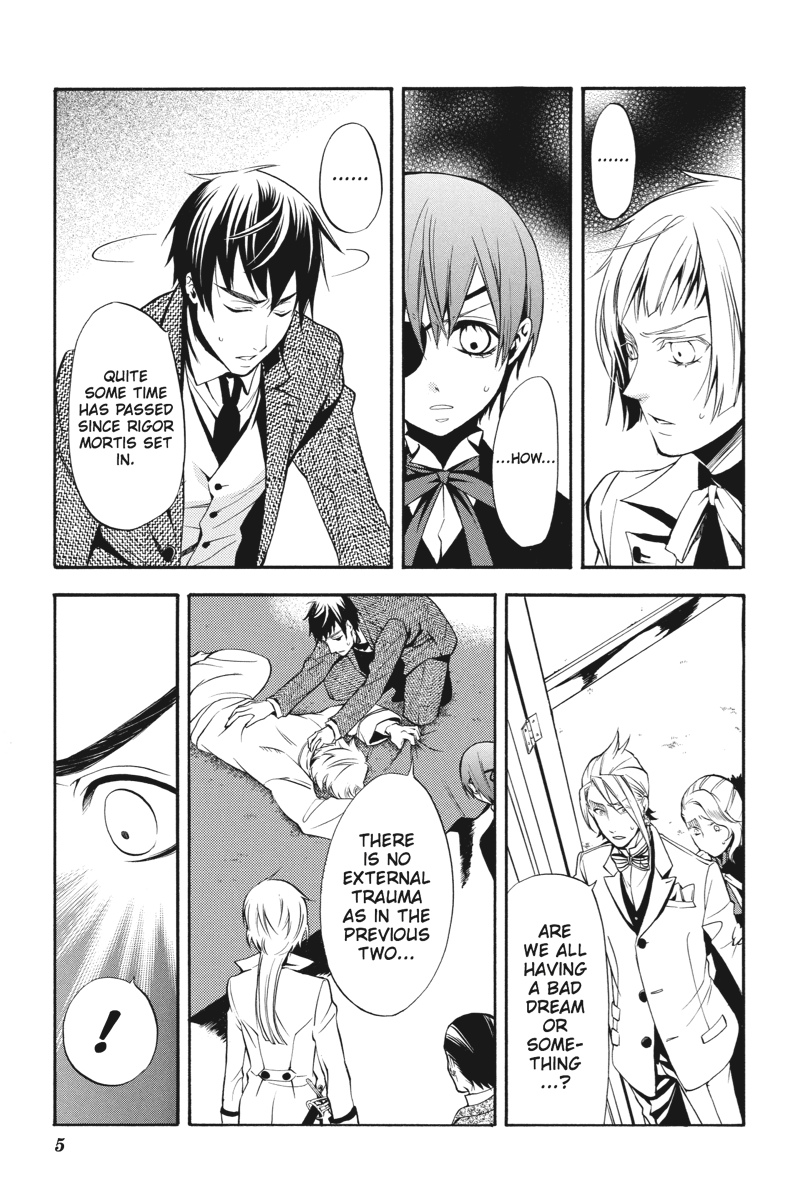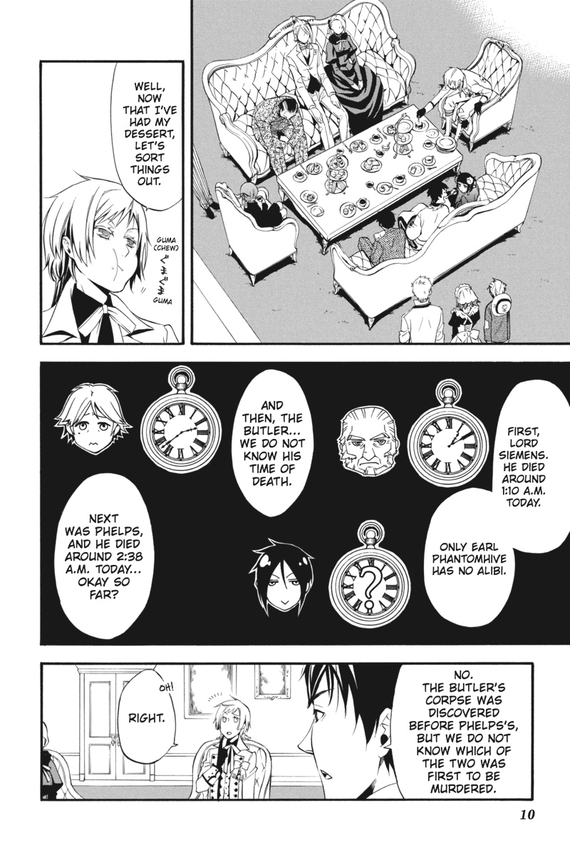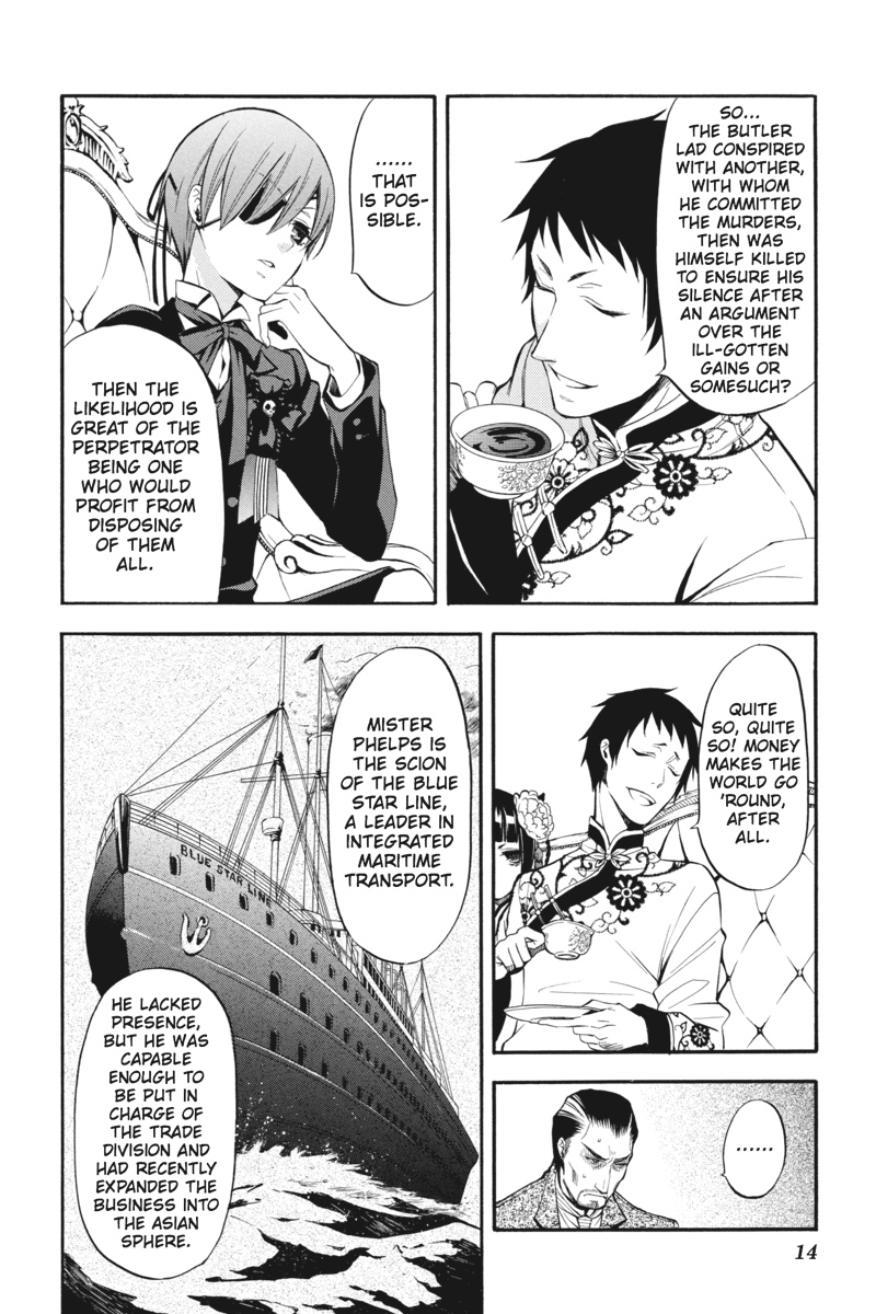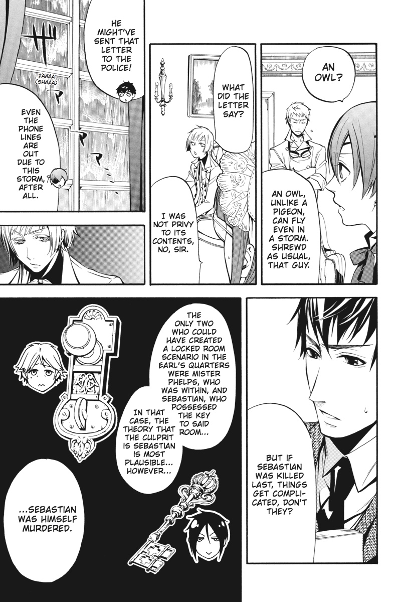 With his royally sanctioned dinner party a shambles and a murderer on the loose, Earl Ciel Phantomhive is a veritable prisoner in his own home, alongside those of his guests who still live. And in the most shocking of turns, the young earl now finds himself without his indispensible manservant, Sebastian. But as the mystery deepens, there arrives upon the young earl's doorstep an odd vicar, wearing an insolent smile and an Inverness cape that flaps and splashes behind him... Is this mysterious thirteenth guest the perpetrator of the crimes that have bloodied the halls of Phantomhive Manor?