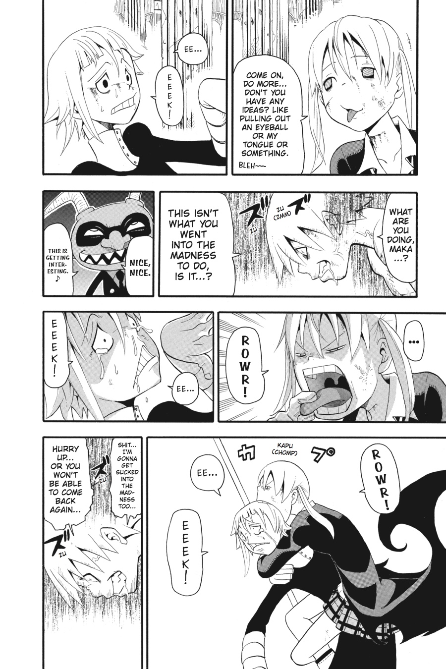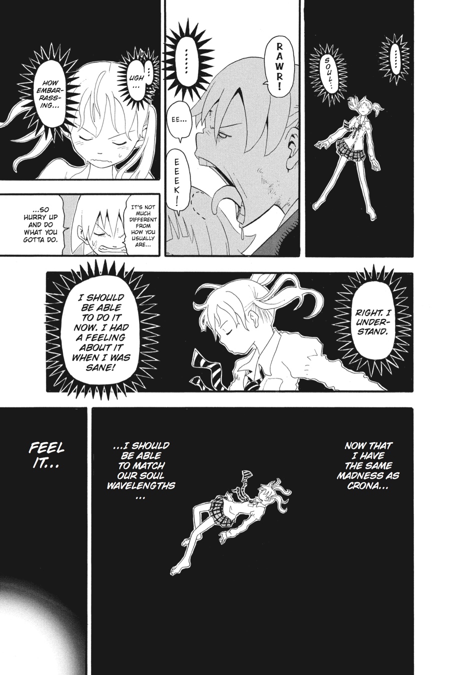 Death the Kid and Black*Star race after Free and Eruka, ready to do whatever it takes to stop the Black Blood before it is used to revive the slumbering First Kishin. Meanwhile, Maka has allowed herself to slip into madness in an effort to reach Crona's troubled soul. In addition to being horribly embarrassing, her actions carry a great risk. If Maka can't find Crona fast, she too will be consumed by madness!