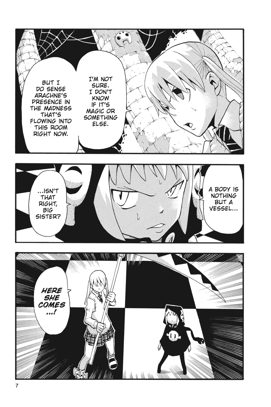 Deep in the belly of Baba Yaga Castle, Maka, Soul, and Medusa prepare to face Arachne in her own chambers. Arachne has grown even stronger since their last meeting, and even the crafty Medusa is caught in her sister's twisted web. As Arachne's intense madness threatens everyone in and around the castle, Soul must perform a string concerto that will move his audience to their very souls...or be caught in the witch's net himself!