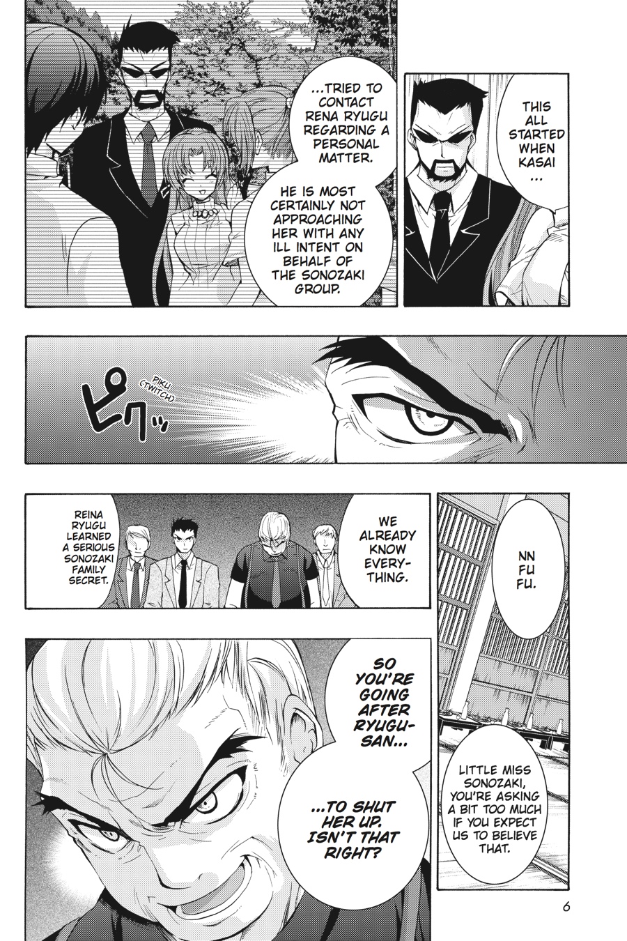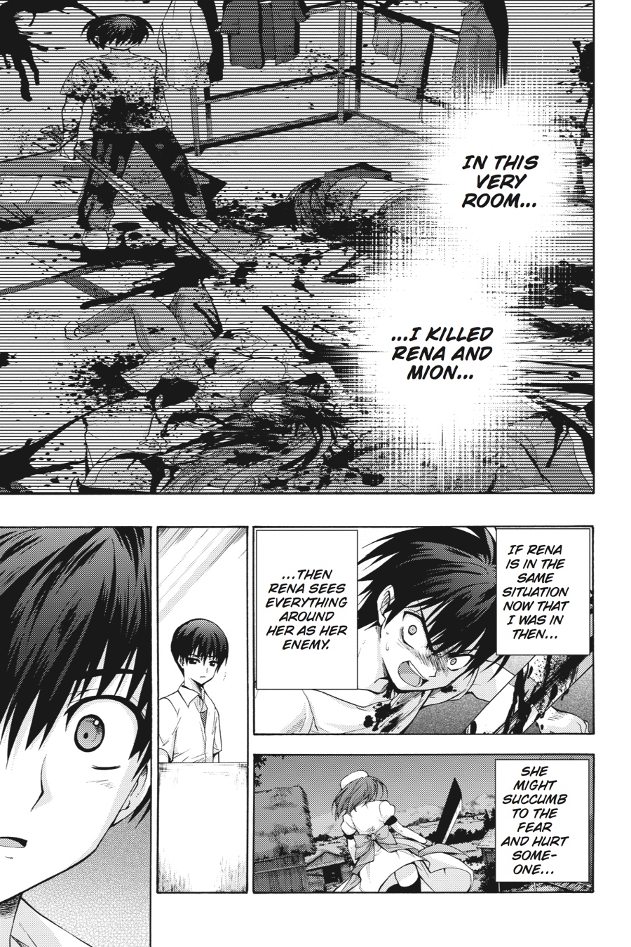 Driven out of her mind by the murderous plot exposed in Takano's scrapbook, Rena is on the run from the police and her friends. When Officer Ooishi confronts Mion about the Sonozaki family's invovement in the murder conspiracy, Mion reveals a number of other scrapbooks, detailing even more outlandish theories to explain the string of murders in the village. But will this new development be enough to calm down Rena? Or, in her panic, will her next move put all of her classmates in danger?!