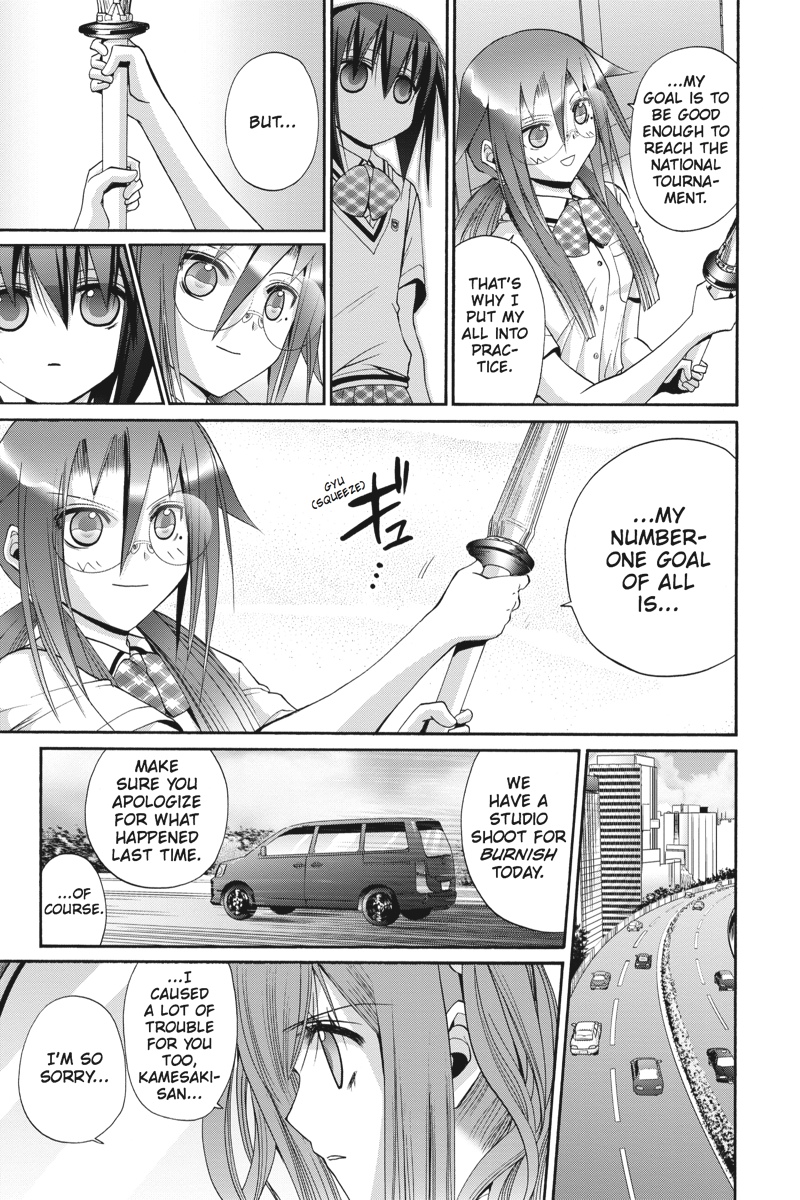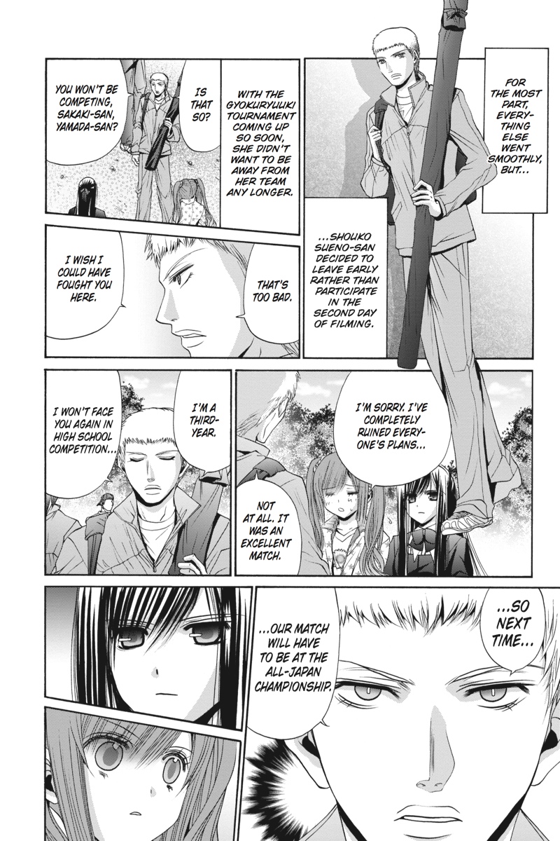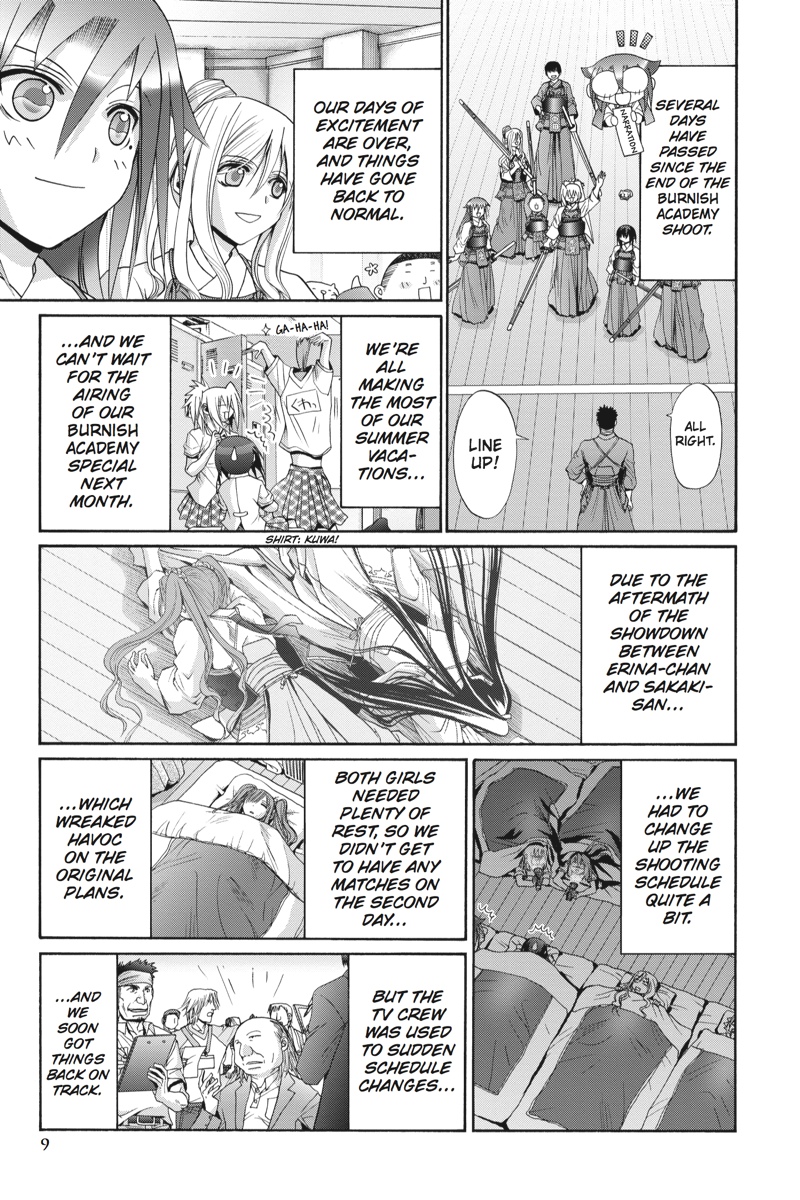 After the intense drama of the Burnish Academy TV shoot, each member of the Muroe kendo team has a new outlook on their involvement with kendo, and Tamaki is eager to learn what reasons her friends have for participating in the sport, hoping they will help her find her own motivation. Kojiro plans a trip to observe the Gokuryuki national tournament to help Tamaki on her search, and with the support of her family and friends, Tamaki takes a confident step toward the future in the final volume of Bamboo Blade!