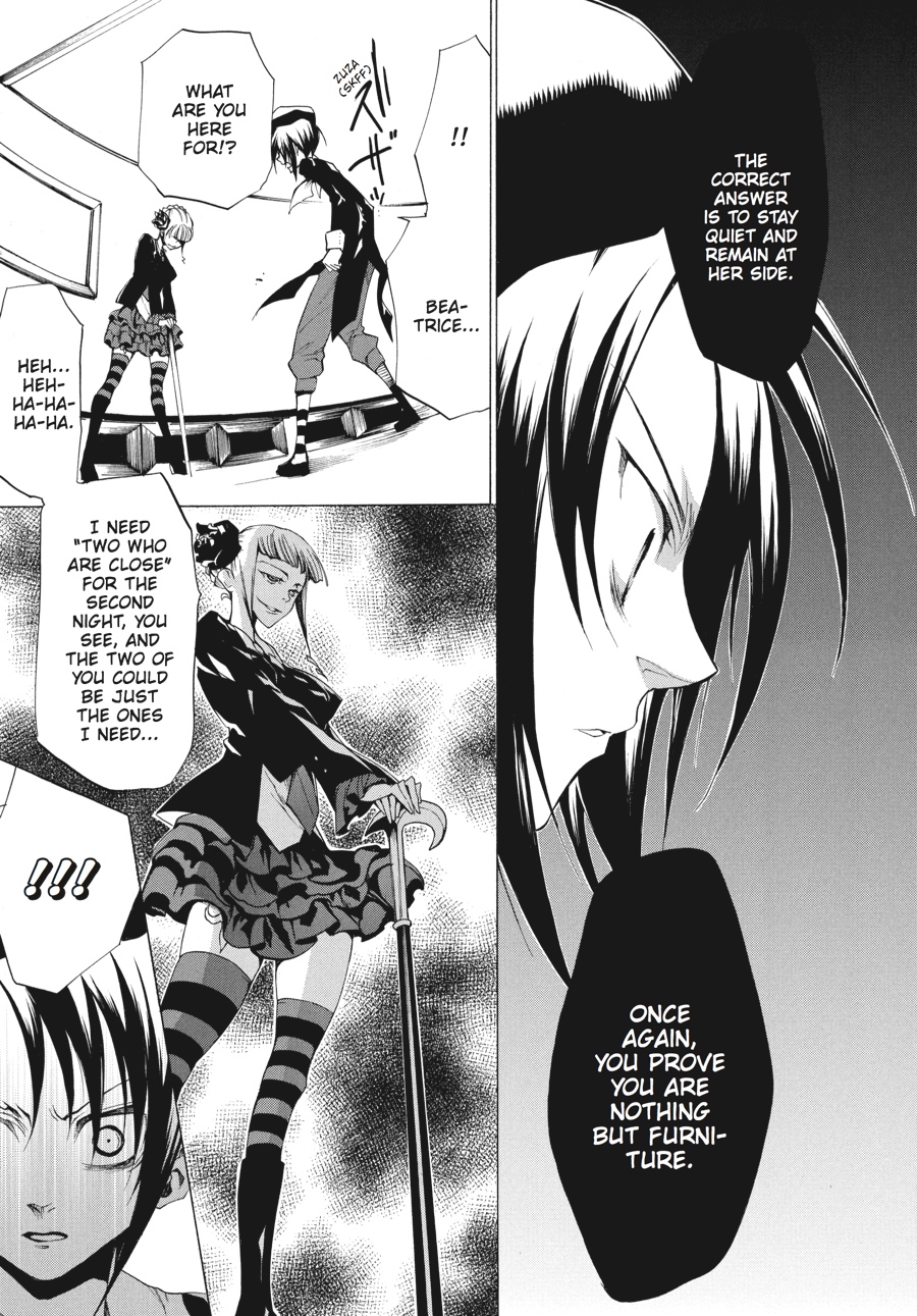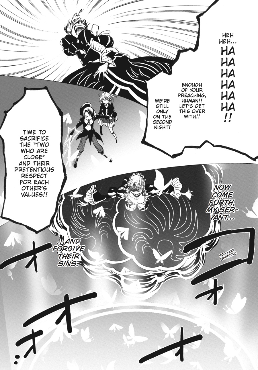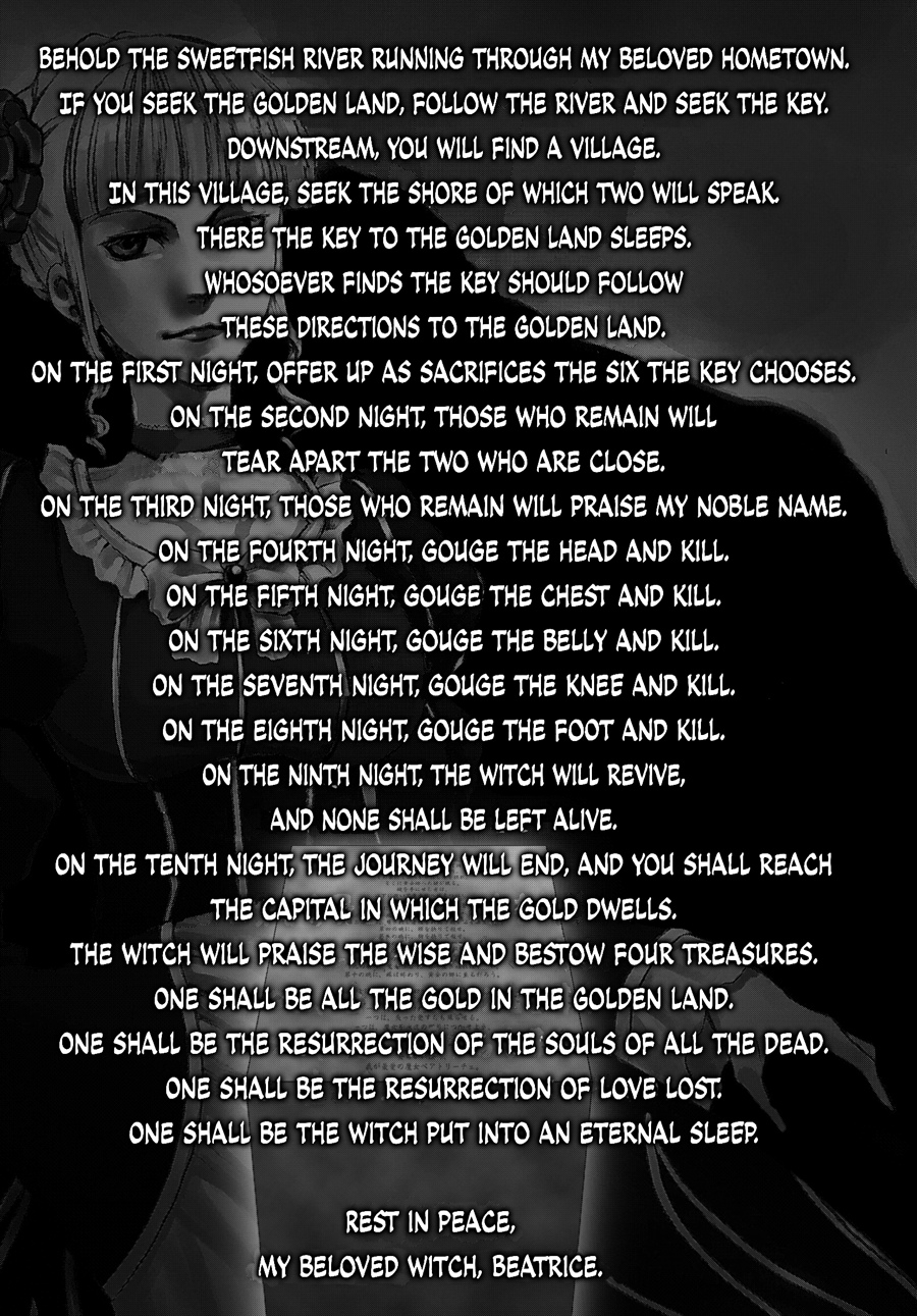 With the six sacrifices of the first night claimed, Beatrice, the Golden Witch, turns her attention to selecting the sacrifices for the second night: the "Two Who Are Close." As the corpses begin to pile up, Battler struggles to disprove that the deaths can only be explained by the existence of magic, and the crafty Beatrice is using every strategy in her playbook to trip him up. Logic and truth perform an acrobatic dance in which a single misstep could spell certain death. Can Battler defeat Beatrice in this match of wits and wills? Or will he find himself kneeling at the witch's feet?!