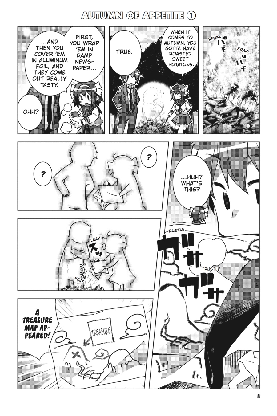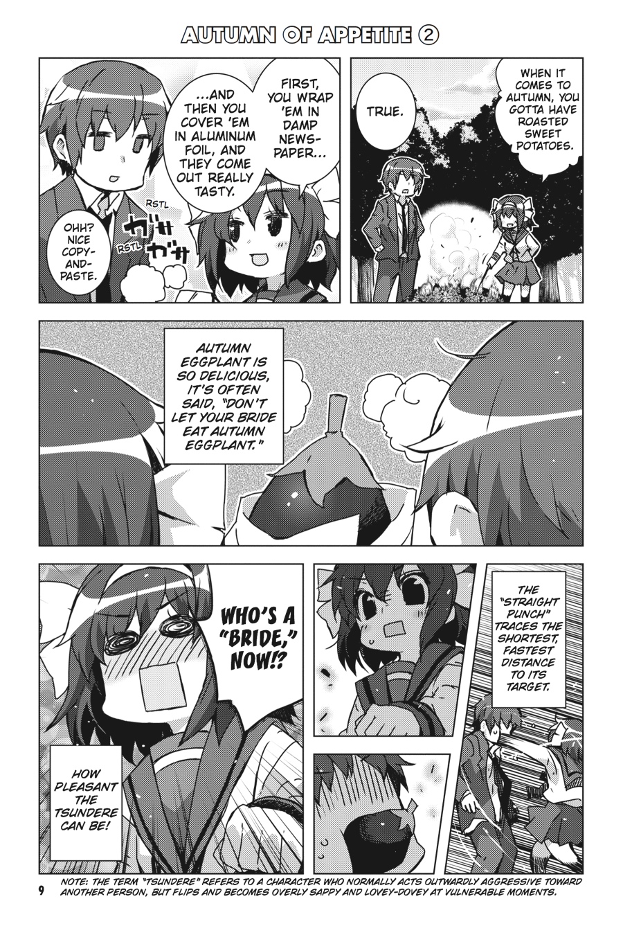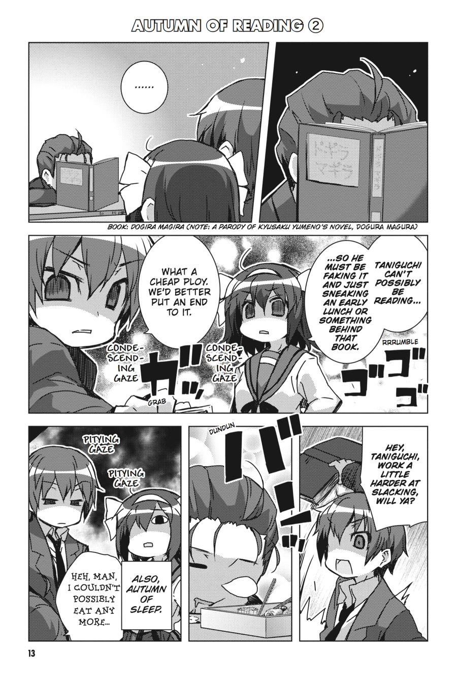 What fate does the future hold for Kyon and Haruhi?!Koizumi and his fellows from the Agency are constantly cooking up ways to gently (*ahem*) encourage romantic feelings between Kyon and Haruhi, but Koizumi's holiday board game tests the very limit of Haruhi and Kyon's acting abilities! Thankfully there's plenty of other holiday fun to be had, including the many fine offerings of autumn and the dawn of a new year (spent dodging Koizumi's machinations)!! You'll find plenty of gags and guffaws as Haruhi dives into the world of four-panel and short comics!!
