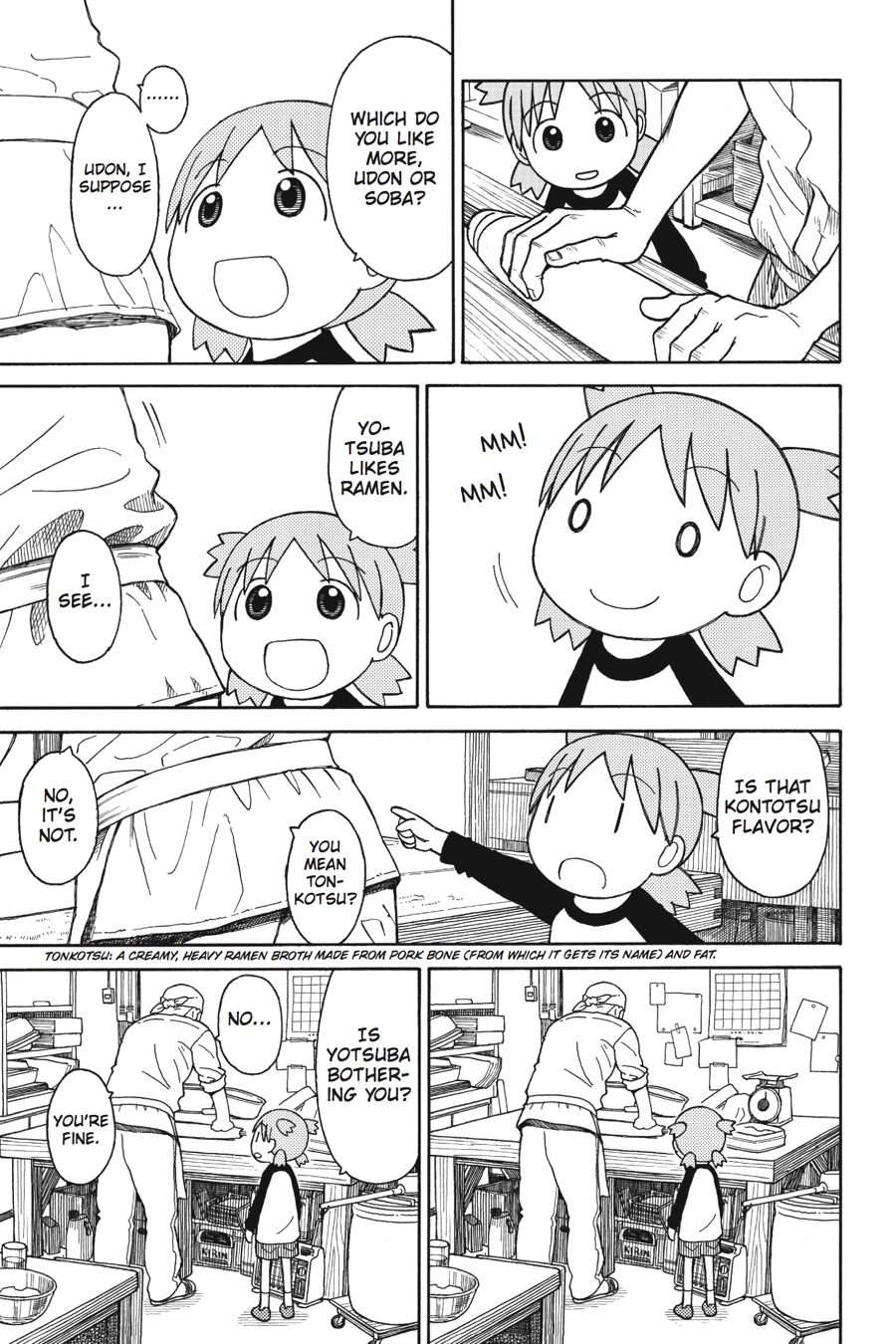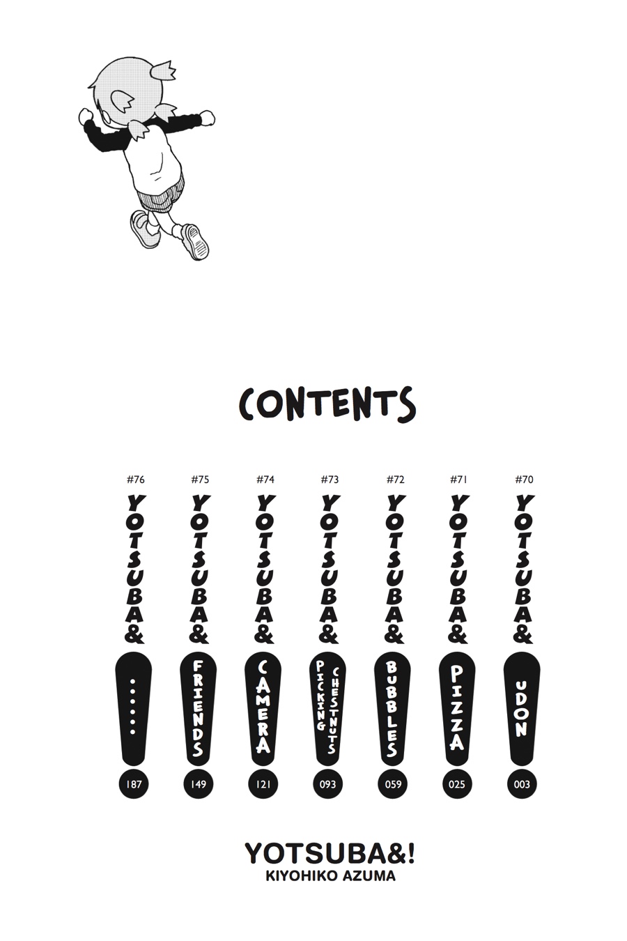 Say cheese! Say cheeeese! Yotsuba's got a shiny new camera! But this new camera is too cool for just Daddy's silly poses. What else should Yotsuba take? Maybe the nice man at the restaurant who makes udon, or Shaggy Beard at the bike shop. But definitely not that dog down the street. He's a little scary and . . . Oh no! Watch out, Juralumin!!!! WAHHHH!