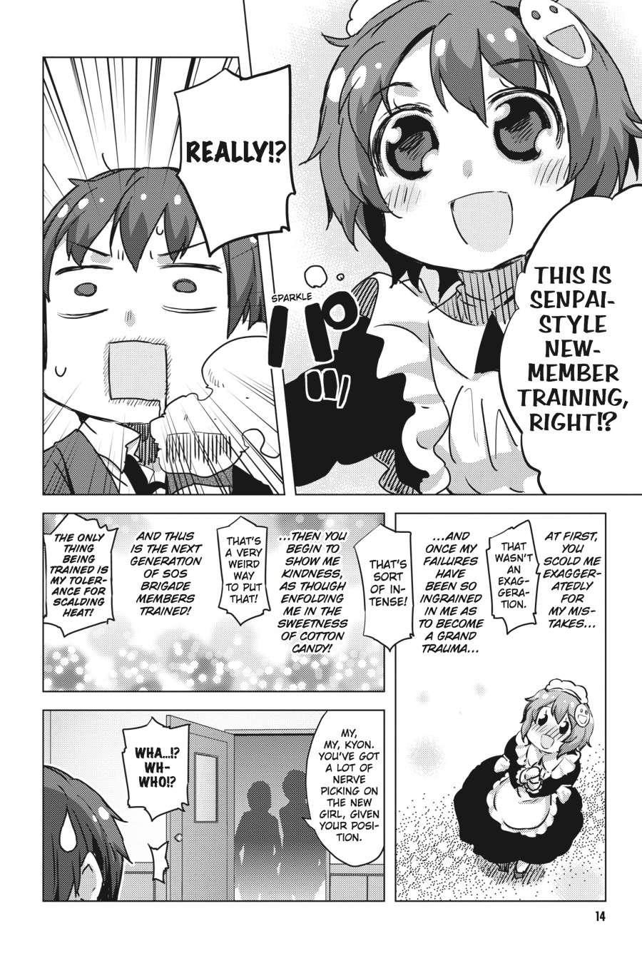 It's a shock that there's a freshman willing to take on Haruhi's Brigade Entrance Examination! But it's just as much a delight to finally have someone willing to fight against the tyranny of the straight man... Or so one would hope. With Yasumi Watahashi now on the scene, Kyon's straight man game is soaring to new heights, Asahina is going crazy, and Haruhi is acting more like a Brigade Chief than ever before! And what of the feline-ified Kuyoh at Nagato's house--when Kyon faces off with her, what could his fate possibly be!?