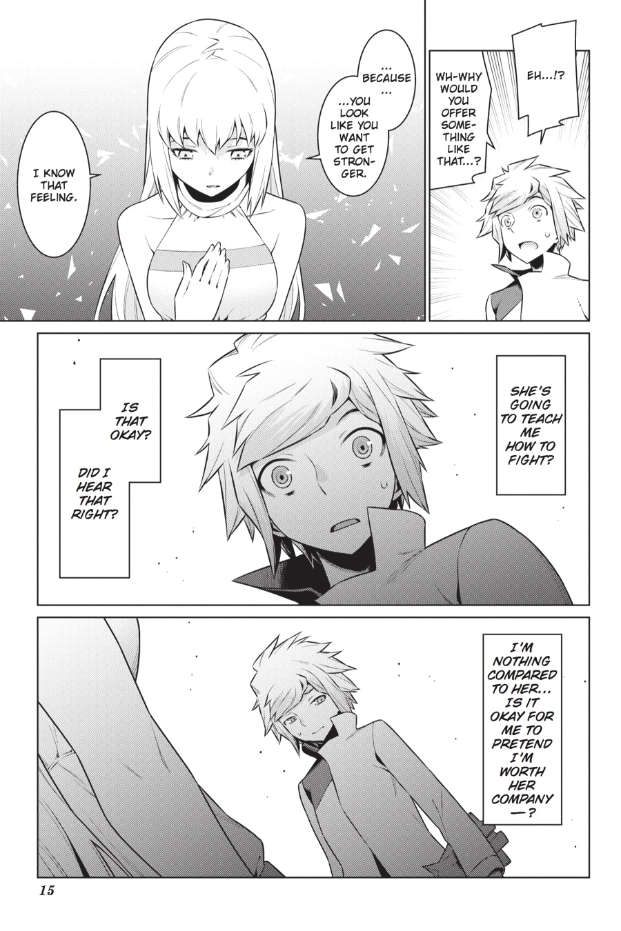In pursuit of his desire to become stronger, the adventurer Bell Cranell has become the student of the brilliant swordswoman Aiz Wallenstein. Even as he despairs at the vast gulf between his abilities and hers, he begins to improve. As he does so, though, a certain goddess's shadowy plan steadily advances, and with it, a dark shadow approaches. The familia myth--walked by the boy and written by the goddess--continues!