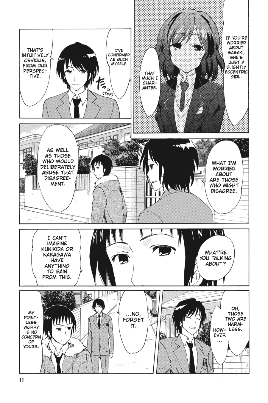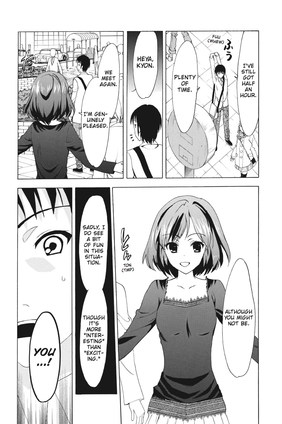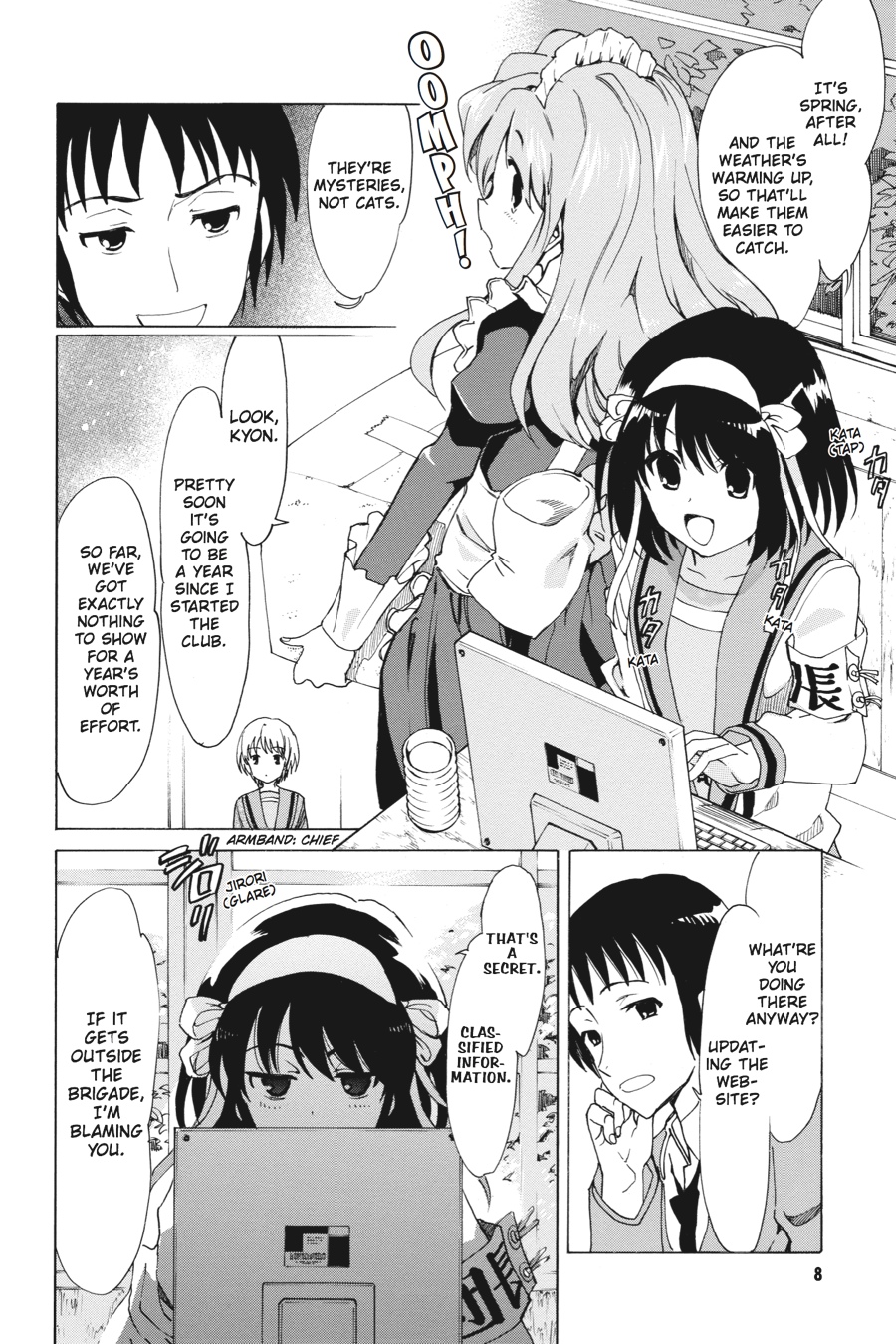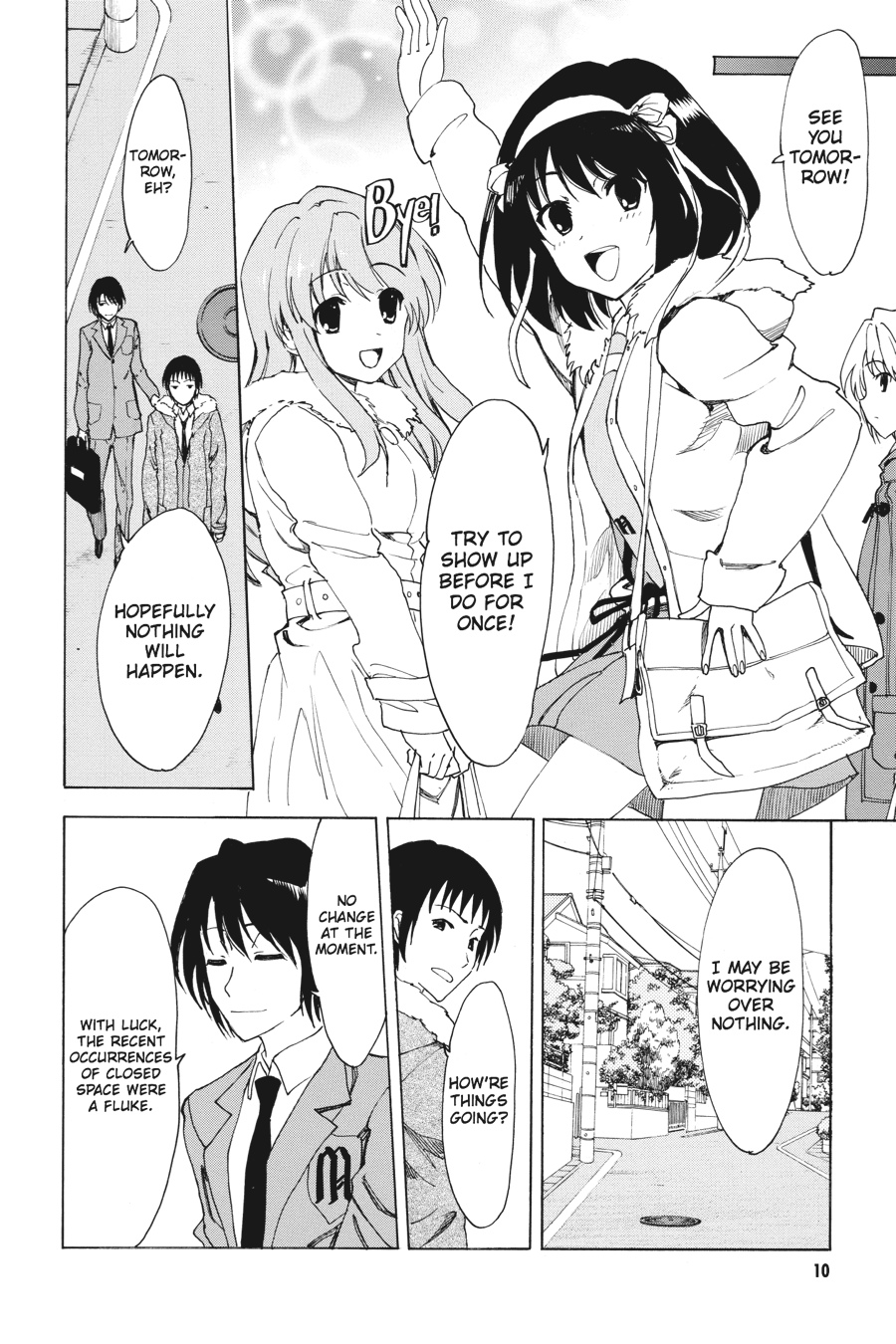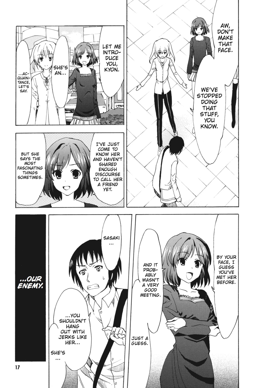One weekend, when Kyon reaches the usual SOS Brigade rendezvous spot, he is met not by his fellow club members, but instead by Sasaki, an old friend from middle school. Haruhi isn't thrilled to find Kyon already waiting when she arrives (Who's going to buy drinks?!) and is even less thrilled by his attractive female friend!