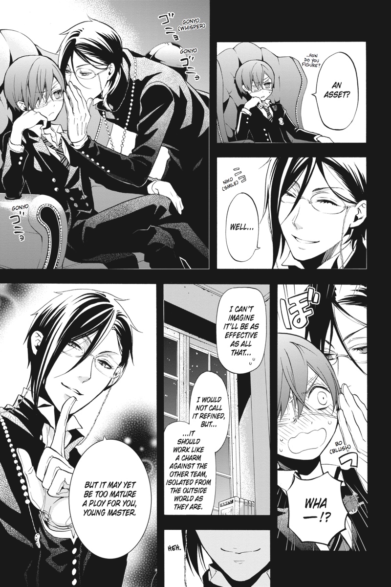 Following the outcome of the annual cricket tourney and due in no small part to Sebastian, his uncommon butler, Earl Ciel Phantomhive has earned a seat at the Midnight Tea Party hosted by Weston's enigmatic headmaster. As moon-pale petals bloom on the lapels of the students who have been granted a place at the Midnight Tea Party, the man who holds all authority at the school reveals himself to his guests. Will his appearance shed light on the fate of the missing students,or conceal the path to truth in yet more darkness?
