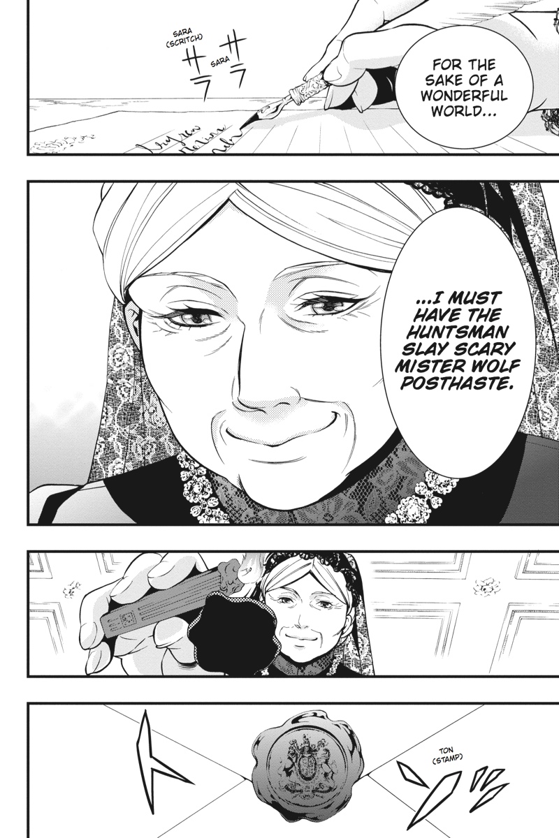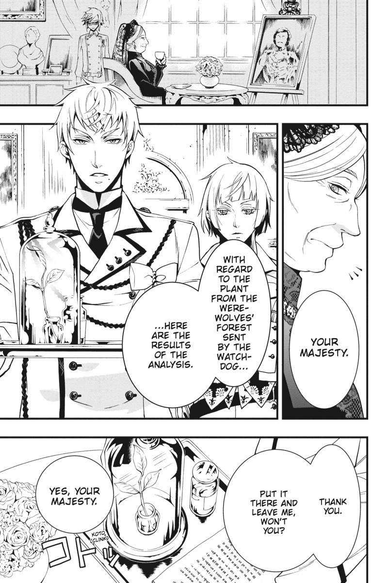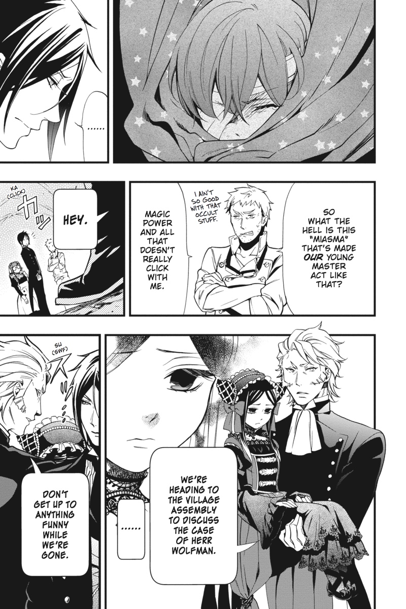 In the hinterlands of Germany, the servants of the Phantomhive house are at a loss when their master, Earl Ciel Phantomhive, is both physically and mentally debilitated by the curse of the Wolfman that roams the Werewolves' Forest. In the face of his master's pitiful new demeanour, consummate butler Sebastian, disillusioned, viciously takes Ciel to task, citing a breach of contract. As the Phantomhive household's crisis unfolds, the sulphurous miasma of the Werewolves' Forest encroaches ever more upon the village ruled by the Emerald Witch...