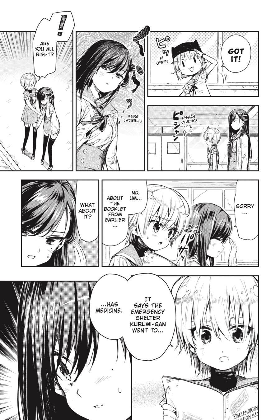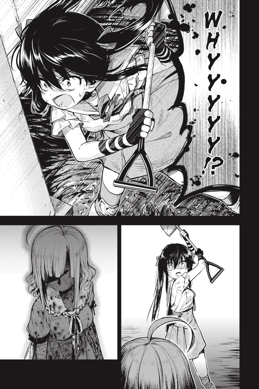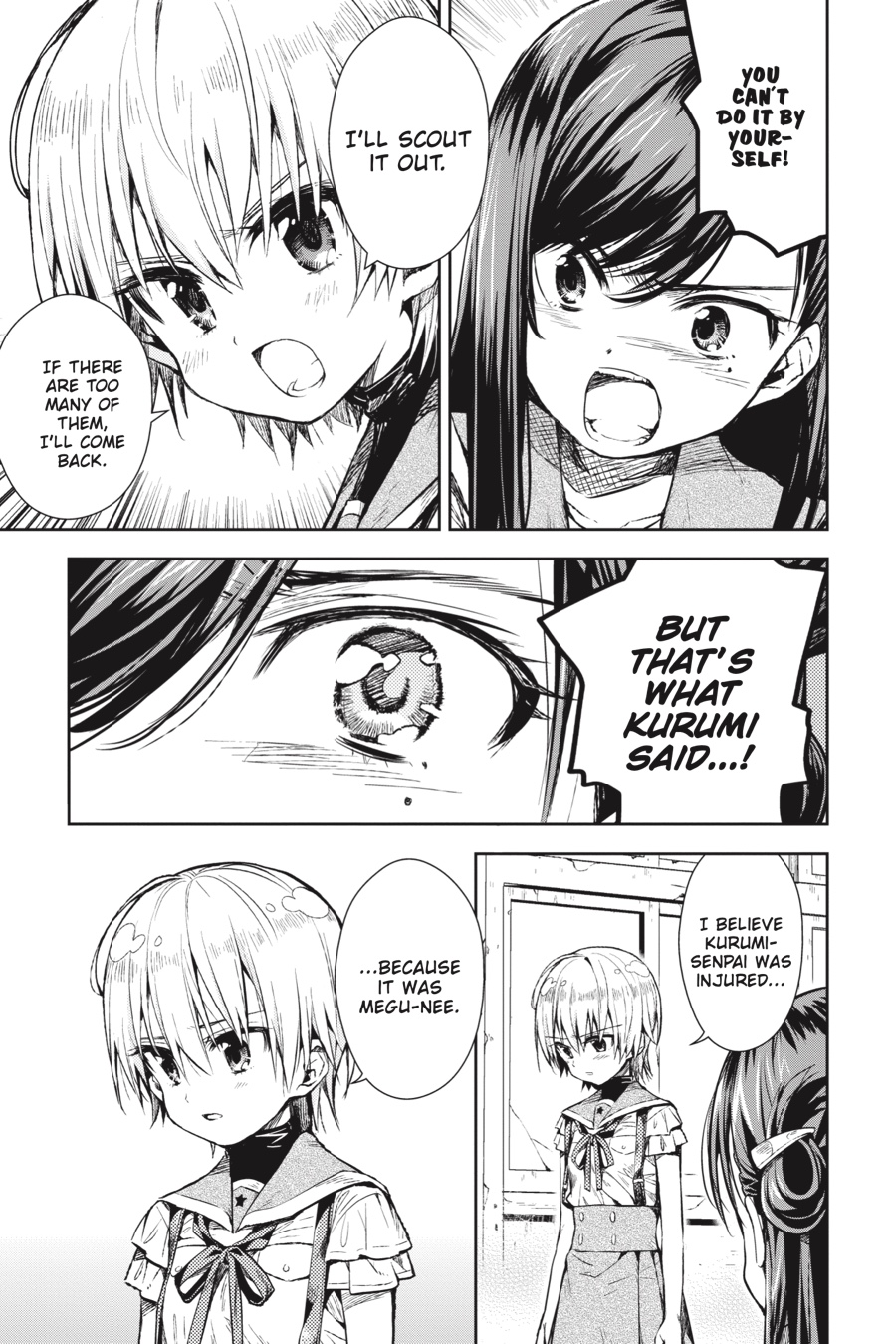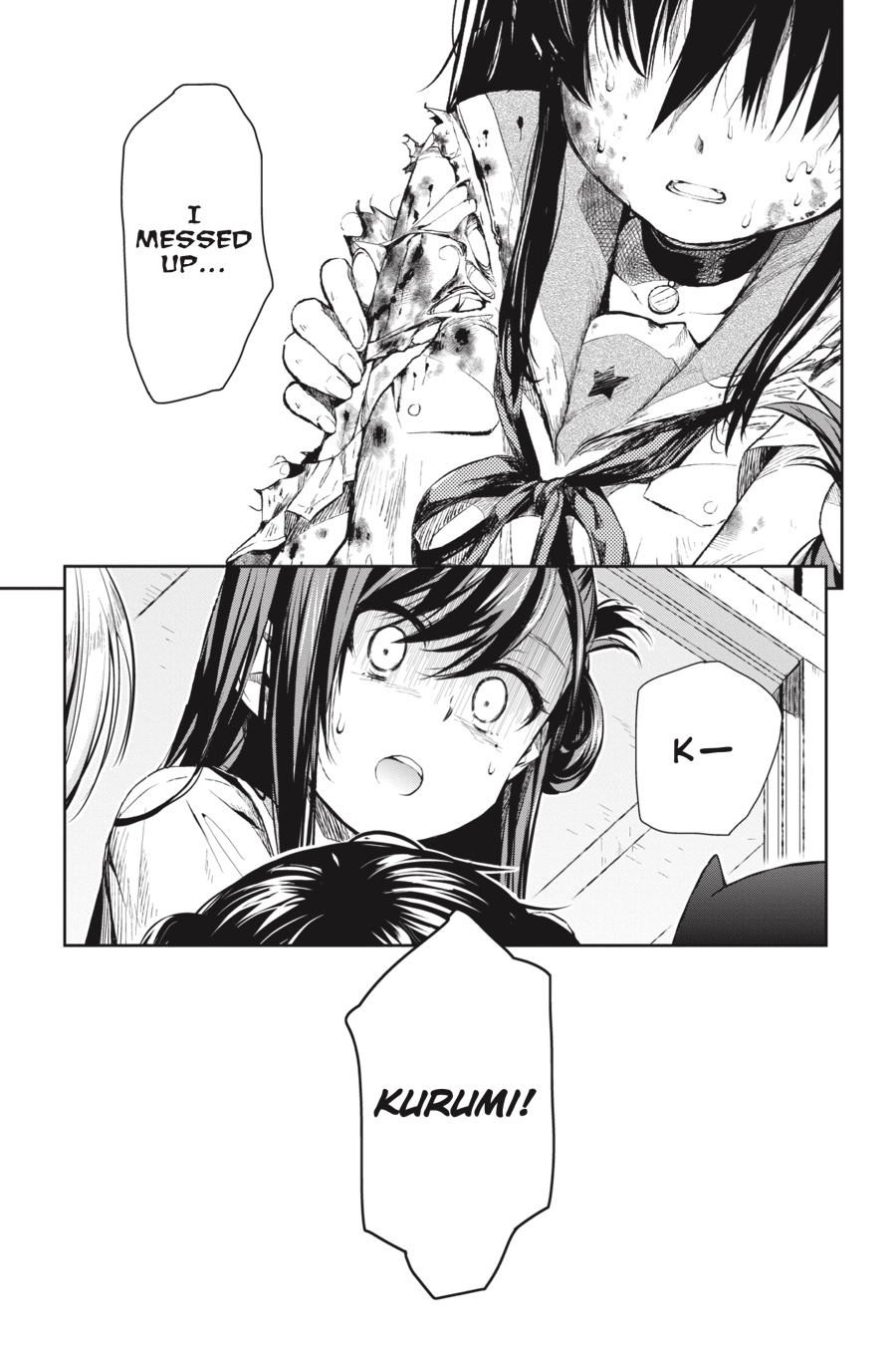 Down in the emergency shelter of the school, what could have been a dream reunion becomes a gruesome nightmare...With Kurumi injured and her condition worsening, the newest member of the School Living Club makes a choice...?!