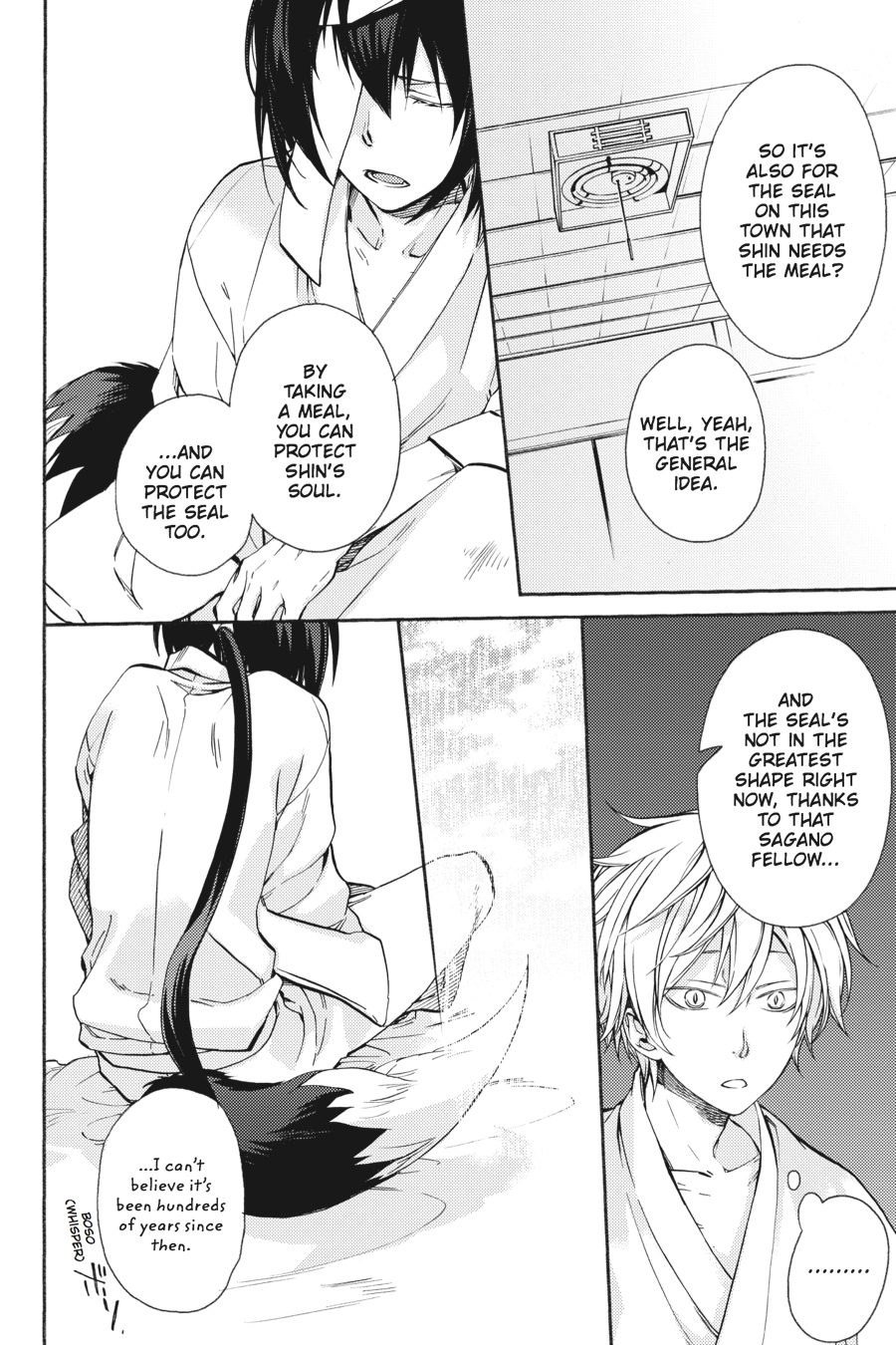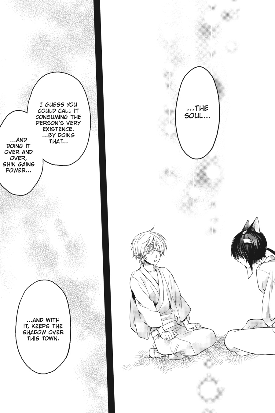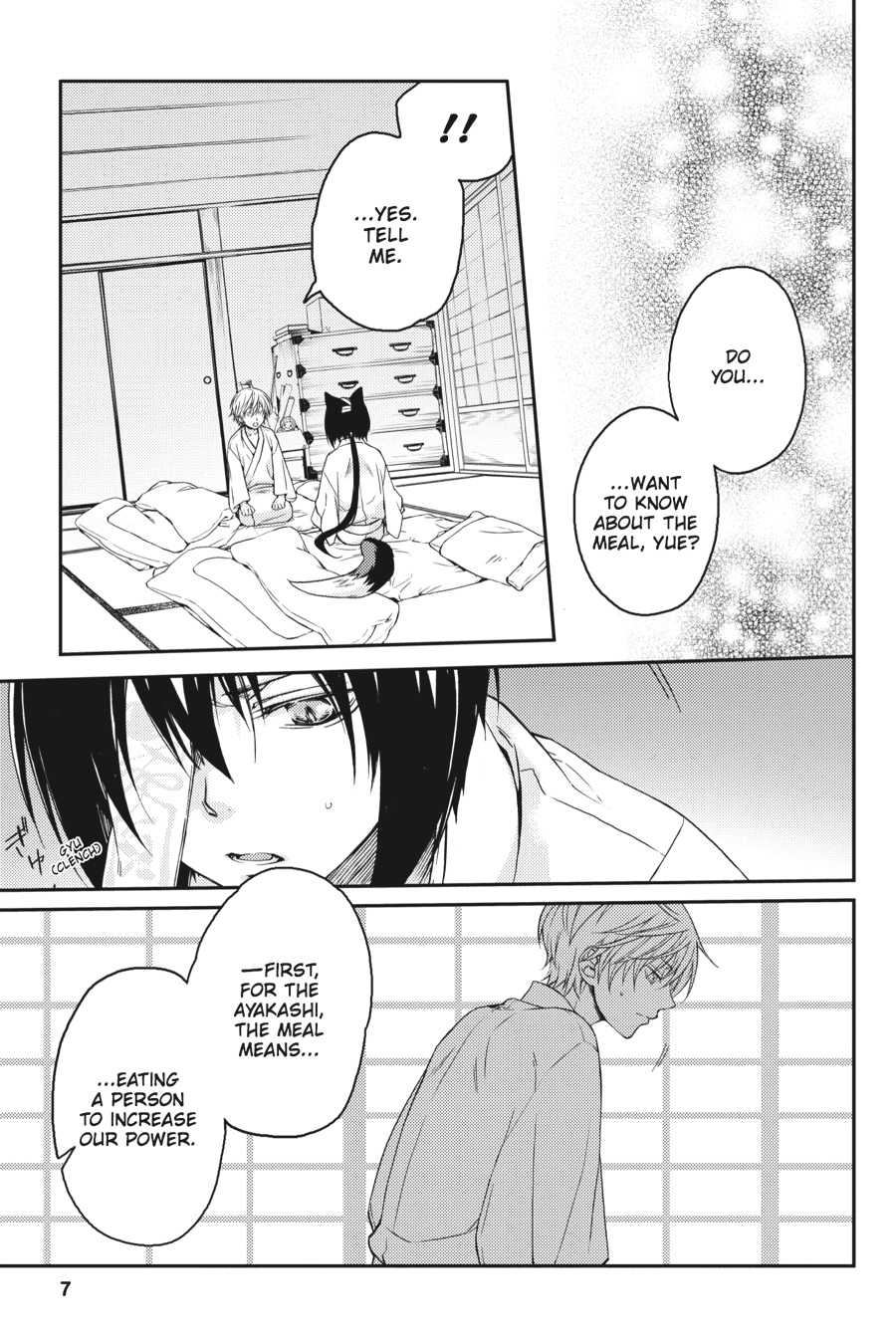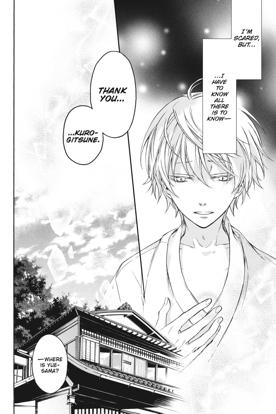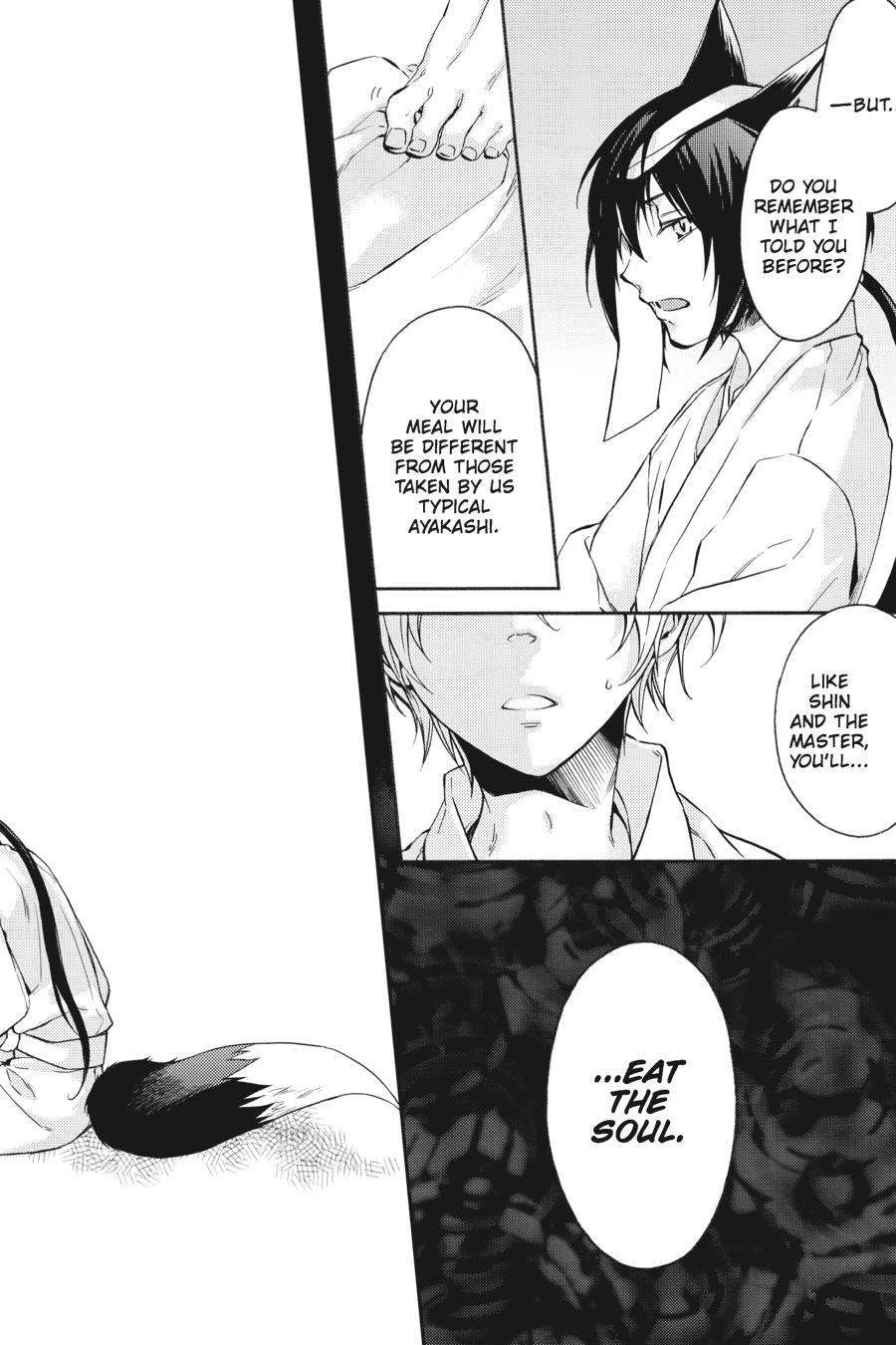After learning that Yoshiki, the person who saved Tsubaki's life, is inside him, Yue is shocked by the fact that he "ate" Yoshiki. While the shrine takes steps to keep Yue confined in preparation for the Meal, Kurogitsune plays his cards close to his chest, resolving to take action... Meanwhile, Sagano incites Akiyoshi to put out the light at the entrance to the shrine. Once there, Akiyoshi, with Tsubaki at his side, makes a decision--! The motives of ayakashi and the humans intersect, but where will that leave Yue and his friends...?