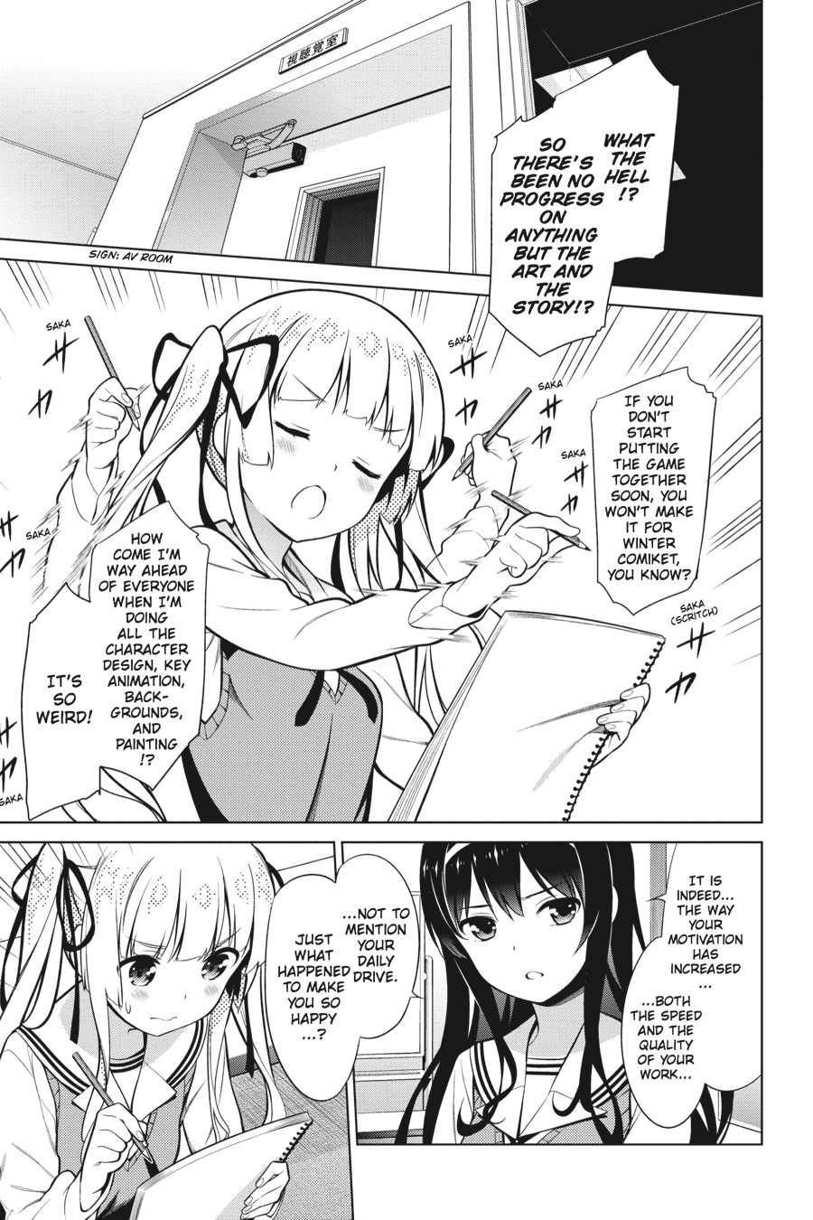 Game script aside, Aki's dating sim is getting nowhere. And in a fix like this, who has time to think about stuff like background music?!!! With the finished product but a dream, the usual chaos continues. But when Aki's beautiful runaway cousin, the guitarist Michiru Hyoudou, suddenly joins the fray, the surprise appearance of a new rival forcing her way into Aki's life throws the other girls for a loop! Is she the solution to the game's soundtrack troubles? Or will Aki's otaku tendencies send her running for the hills?