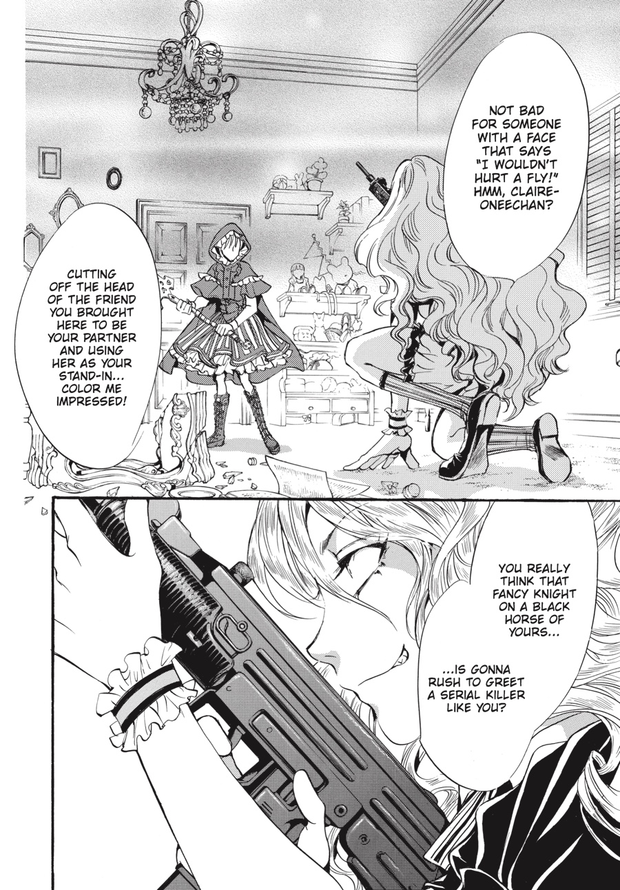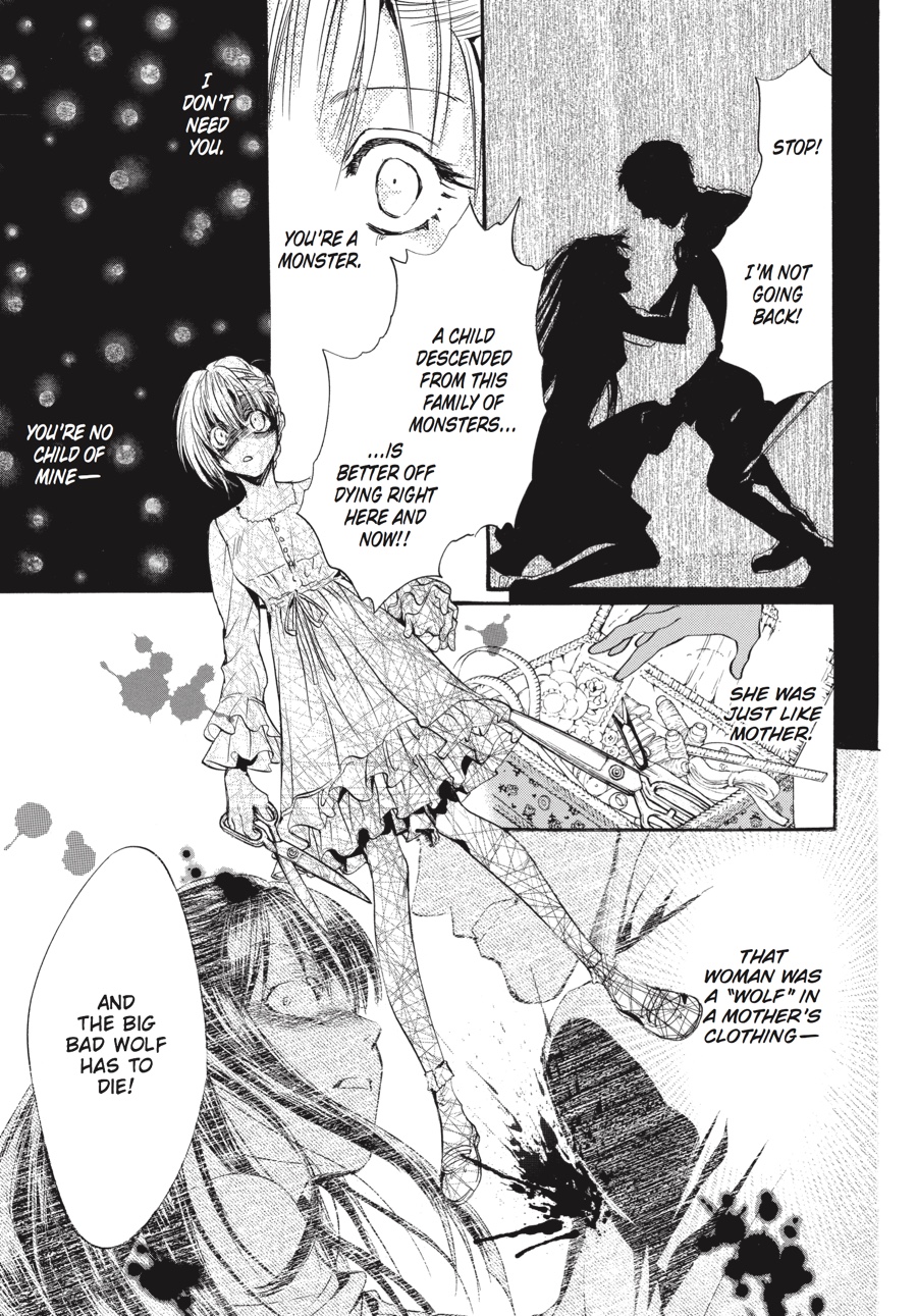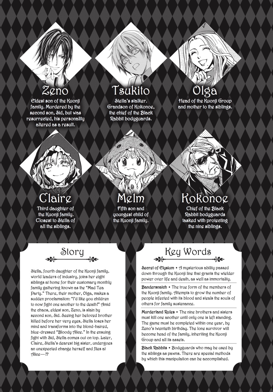 Red Riding Hood, stained crimson with blood... To its heir, the illustrious Kuonji estate promises eternal life. The price the heir must pay for this sublime honor, however, is a pound of flesh--that of his or her brothers and sisters and extracted by his or her own hands......The prospect of having to fight her beloved elder sister "Red Riding Hood" Claire to the death sends Stella into a dizzying spiral of despair. And then, out comes her other self, "Bloody Alice," whispering in her ear-- "This is our fate!" As the White Rabbit and Zeno, her first love, watch over the battle-worn Stella, what is it that creeps ever nearer to her and her destiny--? ...is never going home to Grandmother's house.