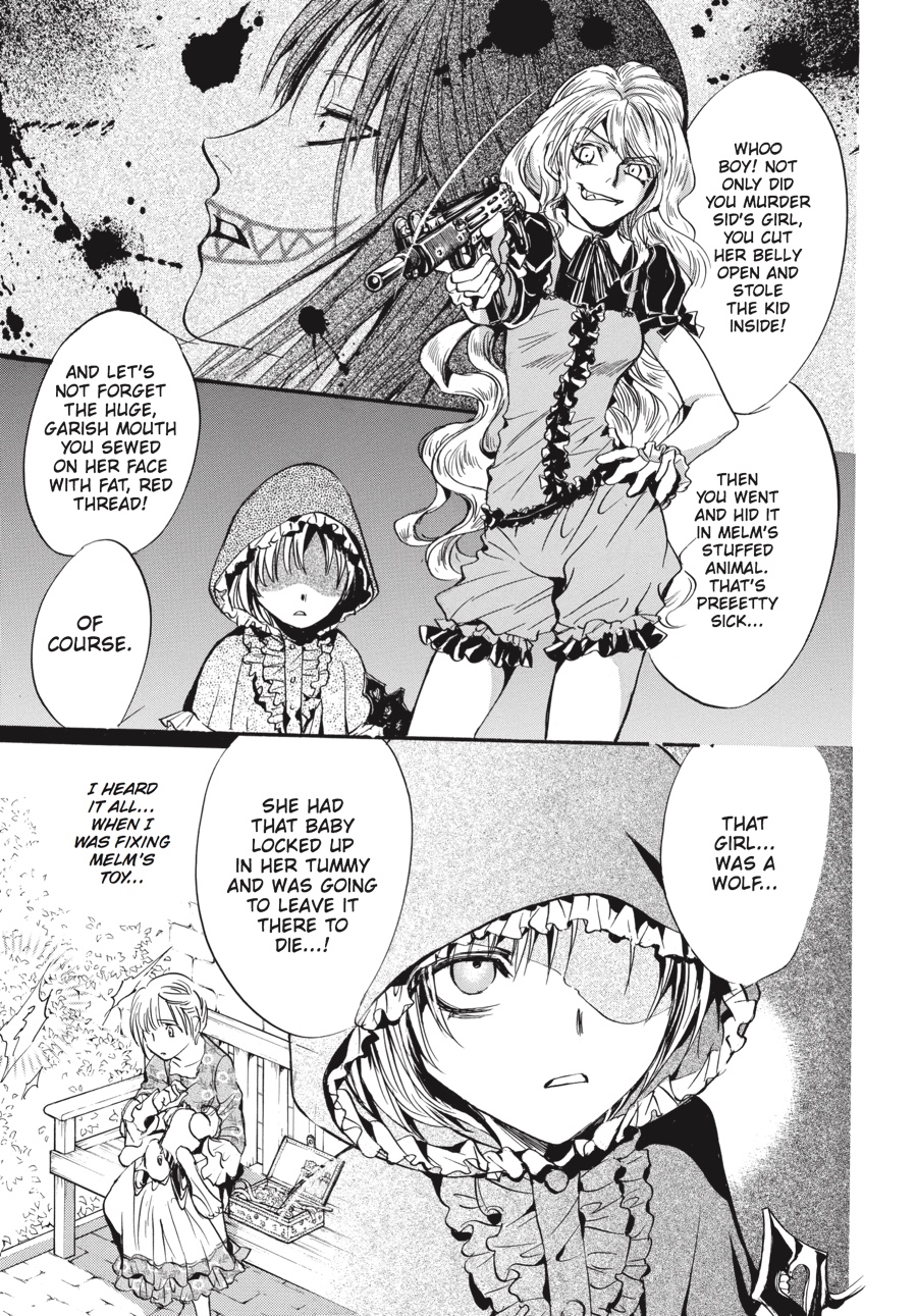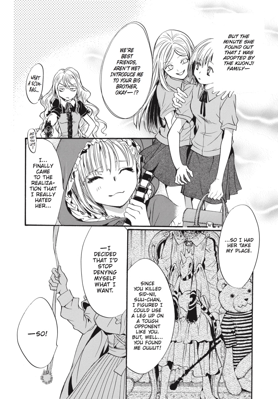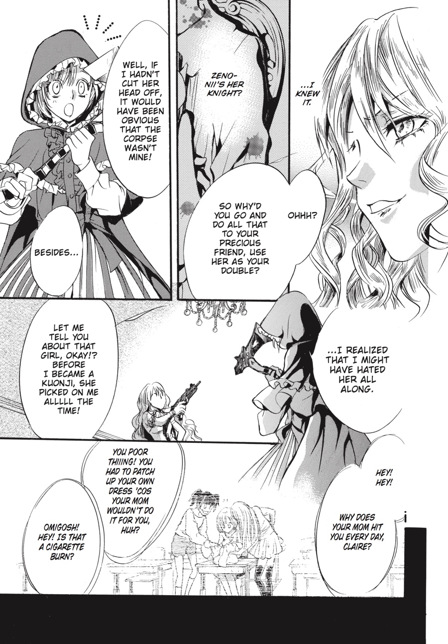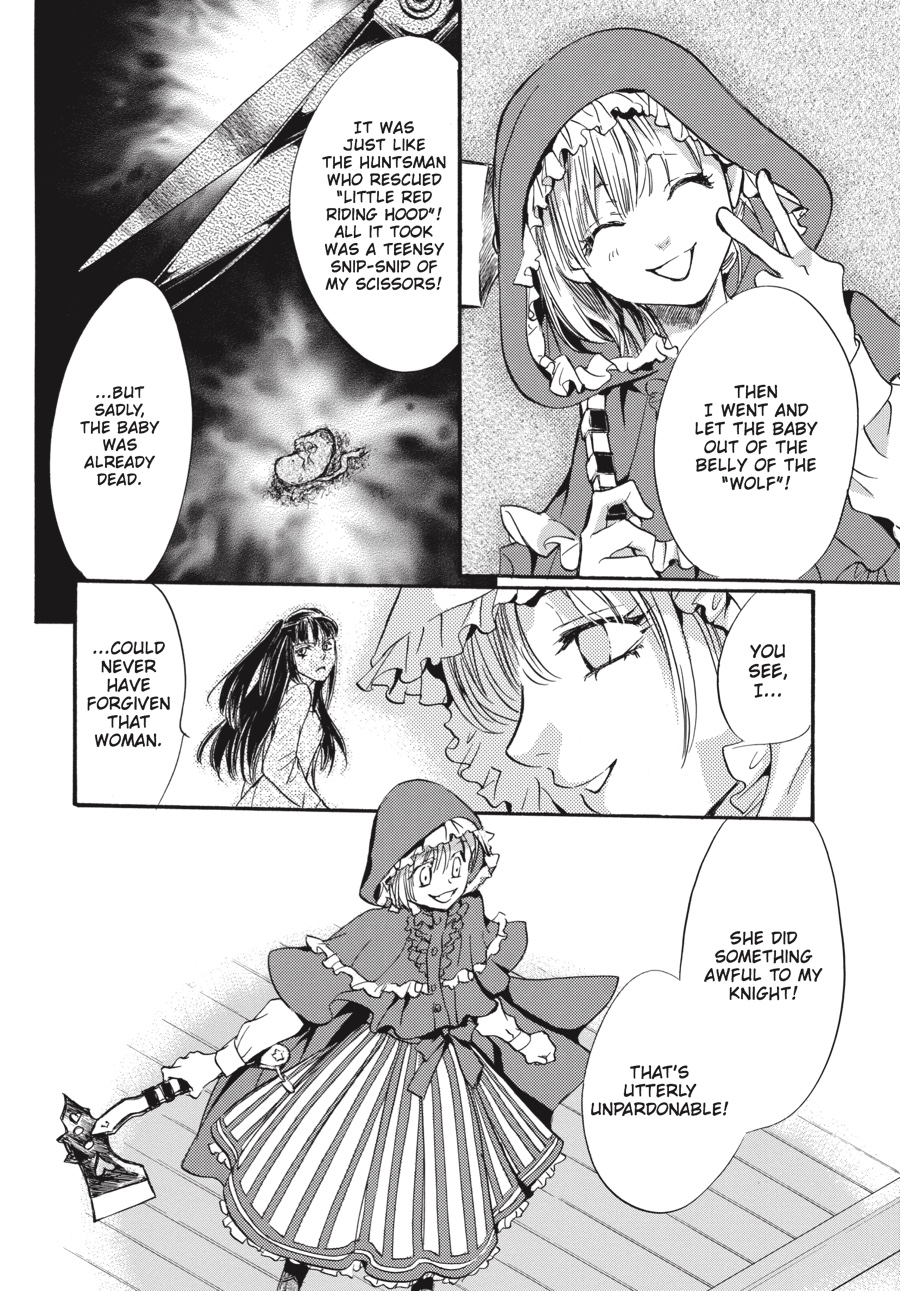 Red Riding Hood, stained crimson with blood... To its heir, the illustrious Kuonji estate promises eternal life. The price the heir must pay for this sublime honor, however, is a pound of flesh--that of his or her brothers and sisters and extracted by his or her own hands......The prospect of having to fight her beloved elder sister "Red Riding Hood" Claire to the death sends Stella into a dizzying spiral of despair. And then, out comes her other self, "Bloody Alice," whispering in her ear-- "This is our fate!" As the White Rabbit and Zeno, her first love, watch over the battle-worn Stella, what is it that creeps ever nearer to her and her destiny--? ...is never going home to Grandmother's house.