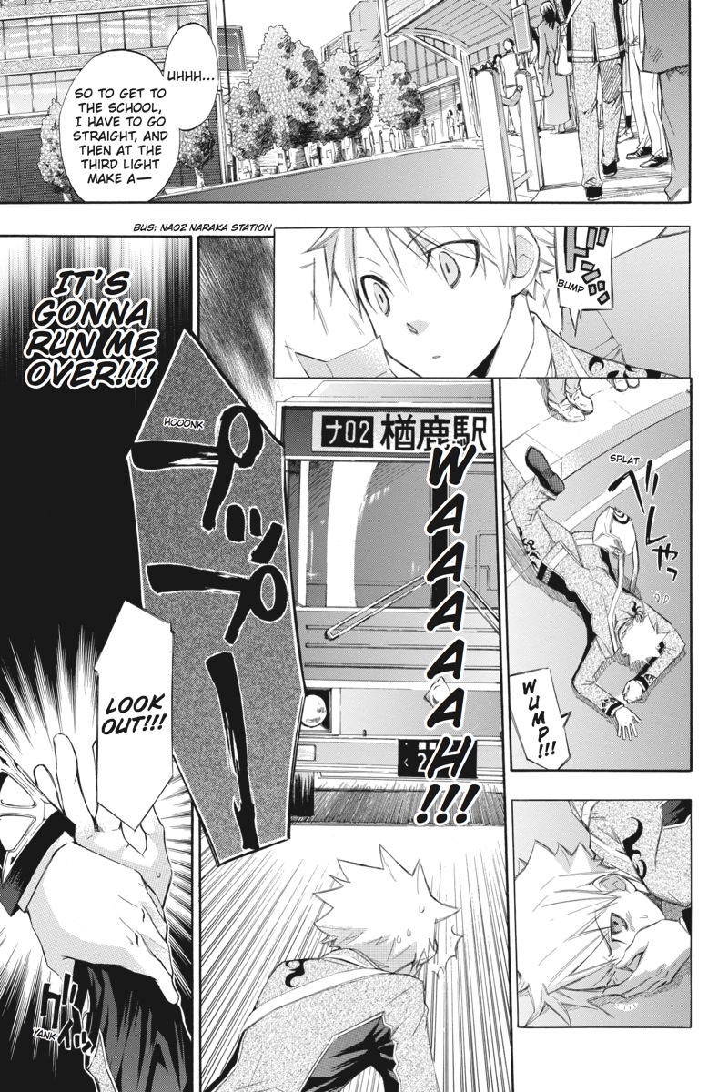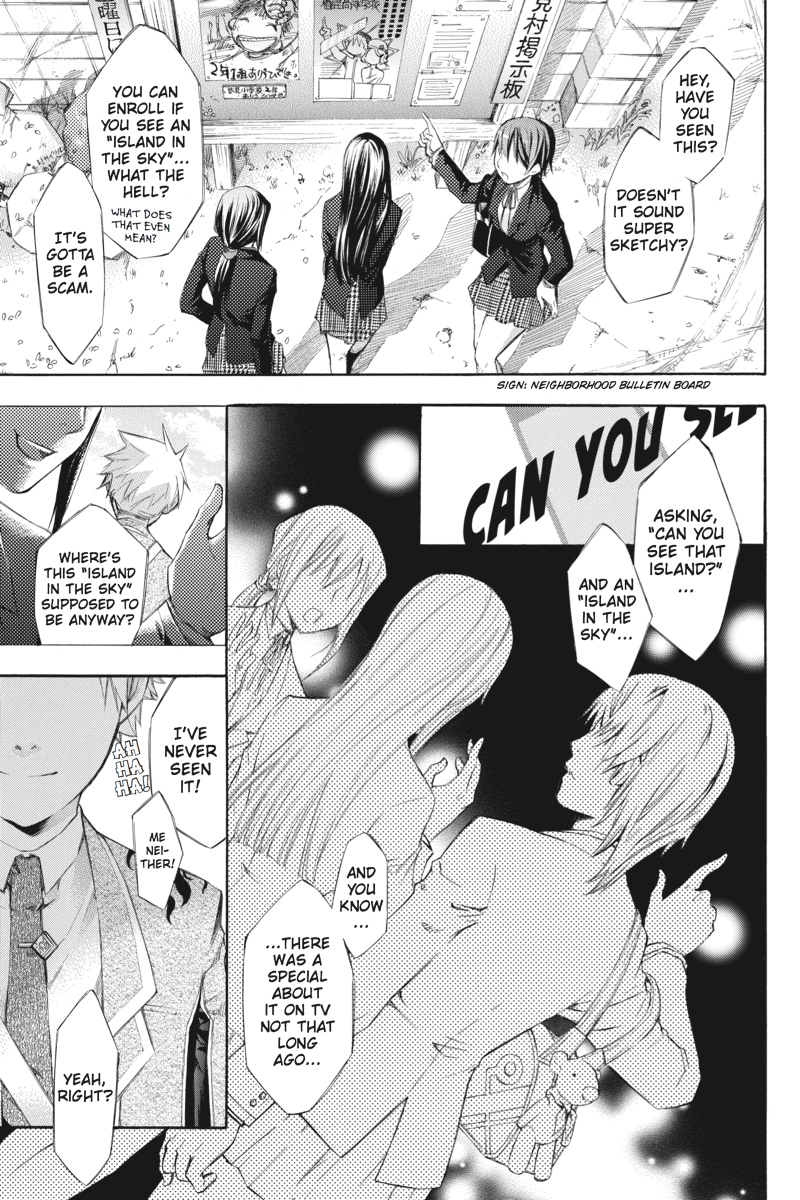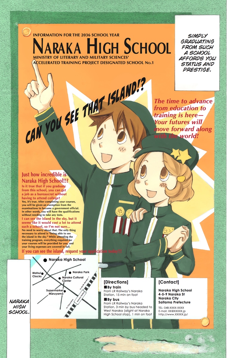 Can you see the island in the sky...?Most people think it's just a metaphor or some weird hoax, but for those rare students actually capable of spotting the island floating in the sky, they are afforded the opportunity to enroll in Naraka High School. Graduation promises a cushy government job and a life of wealth and prosperity. It almost sounds too good to be true...Momiji Rokudou is a first-year who spotted the island and enrolled with dreams of the dazzling life that awaited him, but those dream quickly turn to nightmares when he learns the truth of the old adage, "if it sounds too good to be true, it probably is."Naraka High School offers a unique education, to be sure. The campus is a killing field floating above the earth, and the only requirement for graduation is survival! Best of luck in your studies, Momiji...