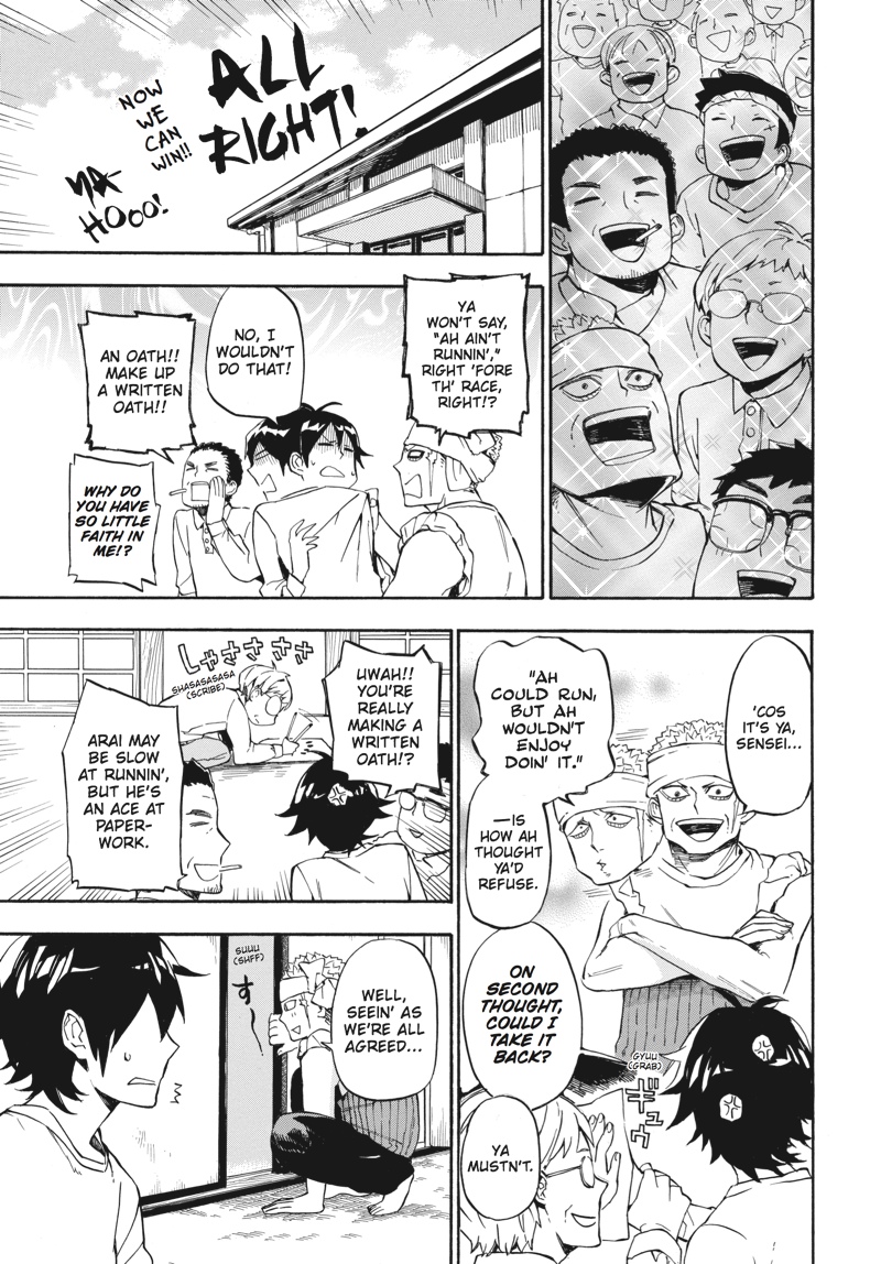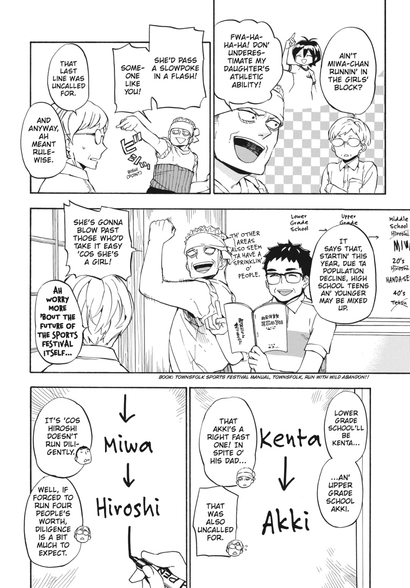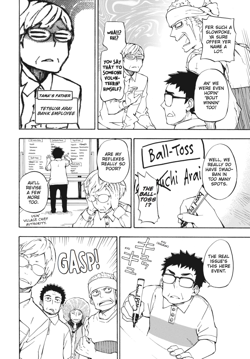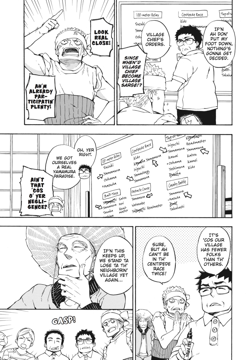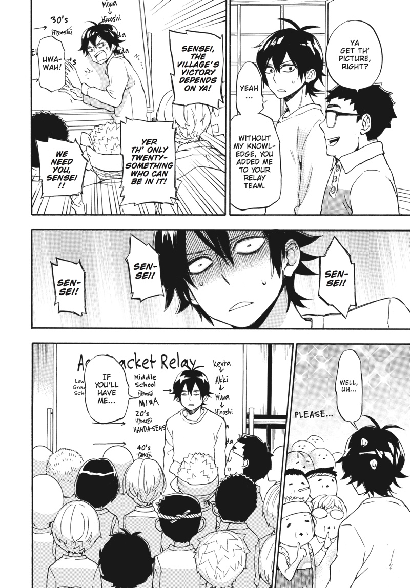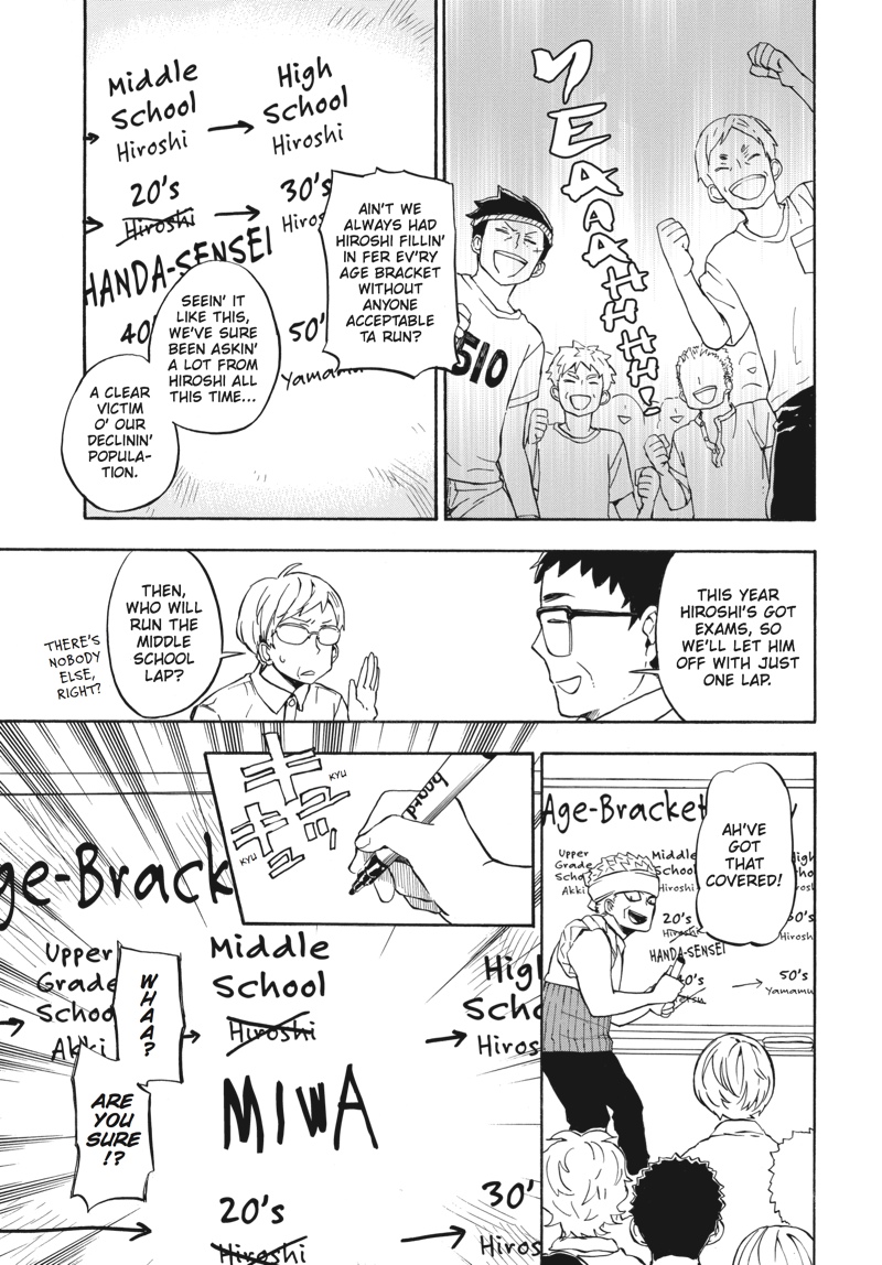 Huff...huff.........huh?! This is not running practice!! The villagers have nominated handsome young calligrapher Seishuu Handa to compete in the relay race--the main event of their annual sports festival! But while Handa undertakes some super-secret running practice, Hiroshi goes on a job interview, Tama awaits the results of her manga submission, the adults concentrate on defeating Rokunosaki (the neighboring village) and the kids do their best to keep up with the adults! Everyone's hard at work in Volume 9 of this super-popular, hot 'n' hearty island comedy!!