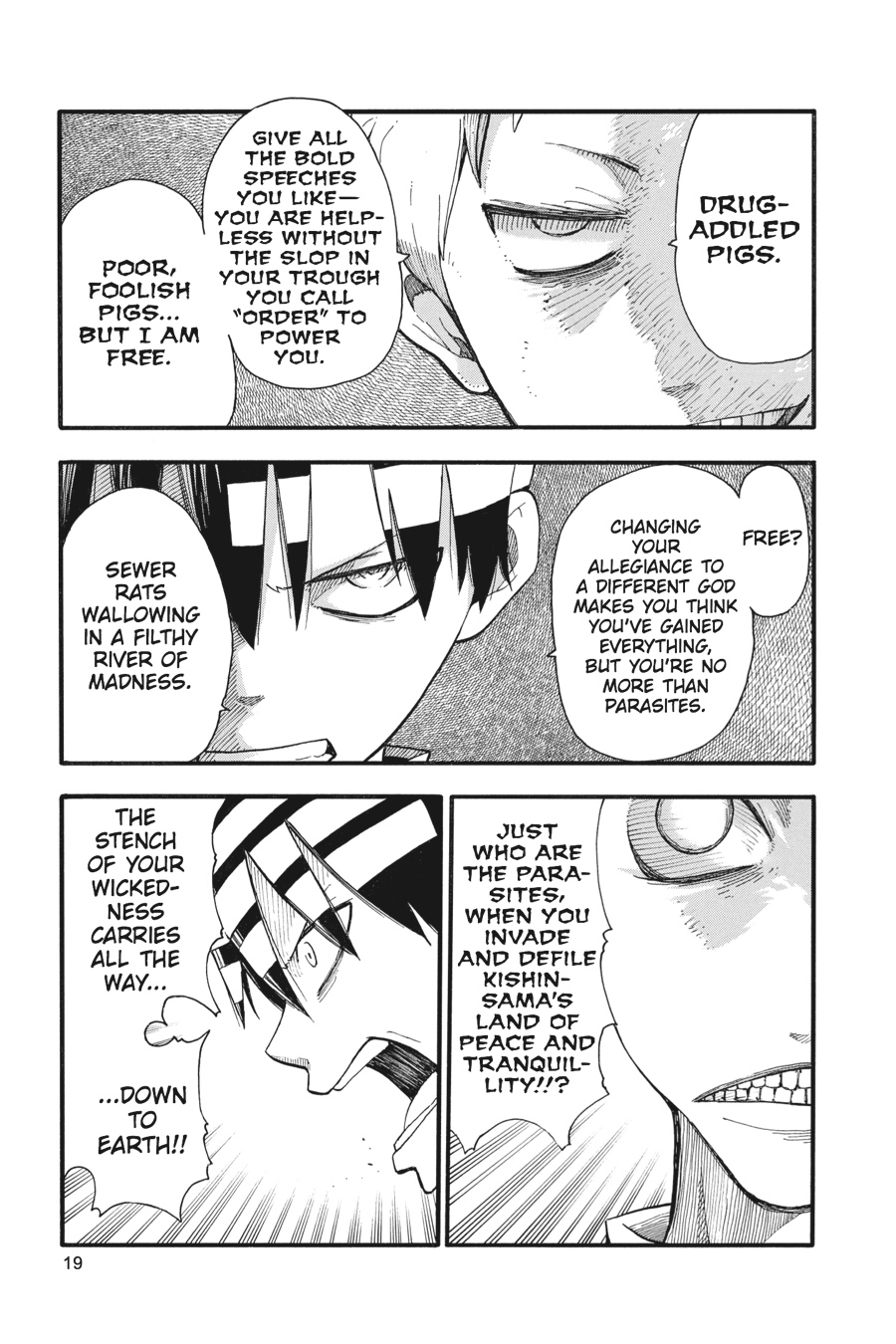 The remaining Death Weapons, along with Kid, gather to stage their assault on the moon. As they approach the Kishin's hideout, Stein and Justin clash in a violent, madness-fueled battle. Stein struggles to maintain his grip on sanity while Justin draws power from the Kishin's inexhaustible aura of madness. Everyone knows there will be casualties on the road to restoring "order"-but will Stein become the first?