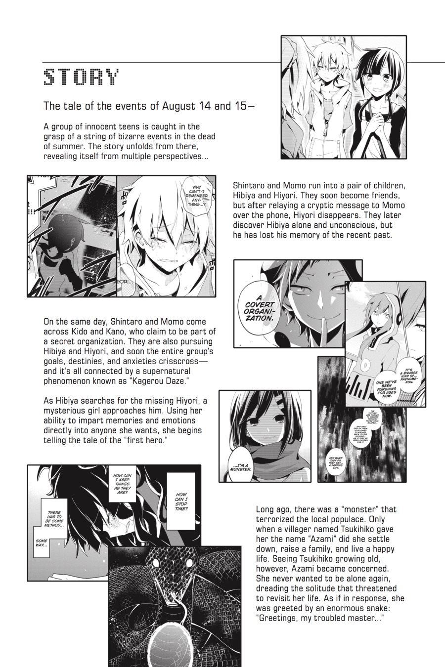 THEIR FATES TWIST AND INTERTWINE LIKE SO MANY SNAKES... The source of the phenomenon known as "Kagerou Daze" is revealed to Hibiya at last, heightening his sense of urgency to find Hiyori. Little does he realize that real danger may find her first...Hibiya, the Mekakushi-dan, and even Shintaro are drawn together by a common destiny and a common will...but where does that path lead...?