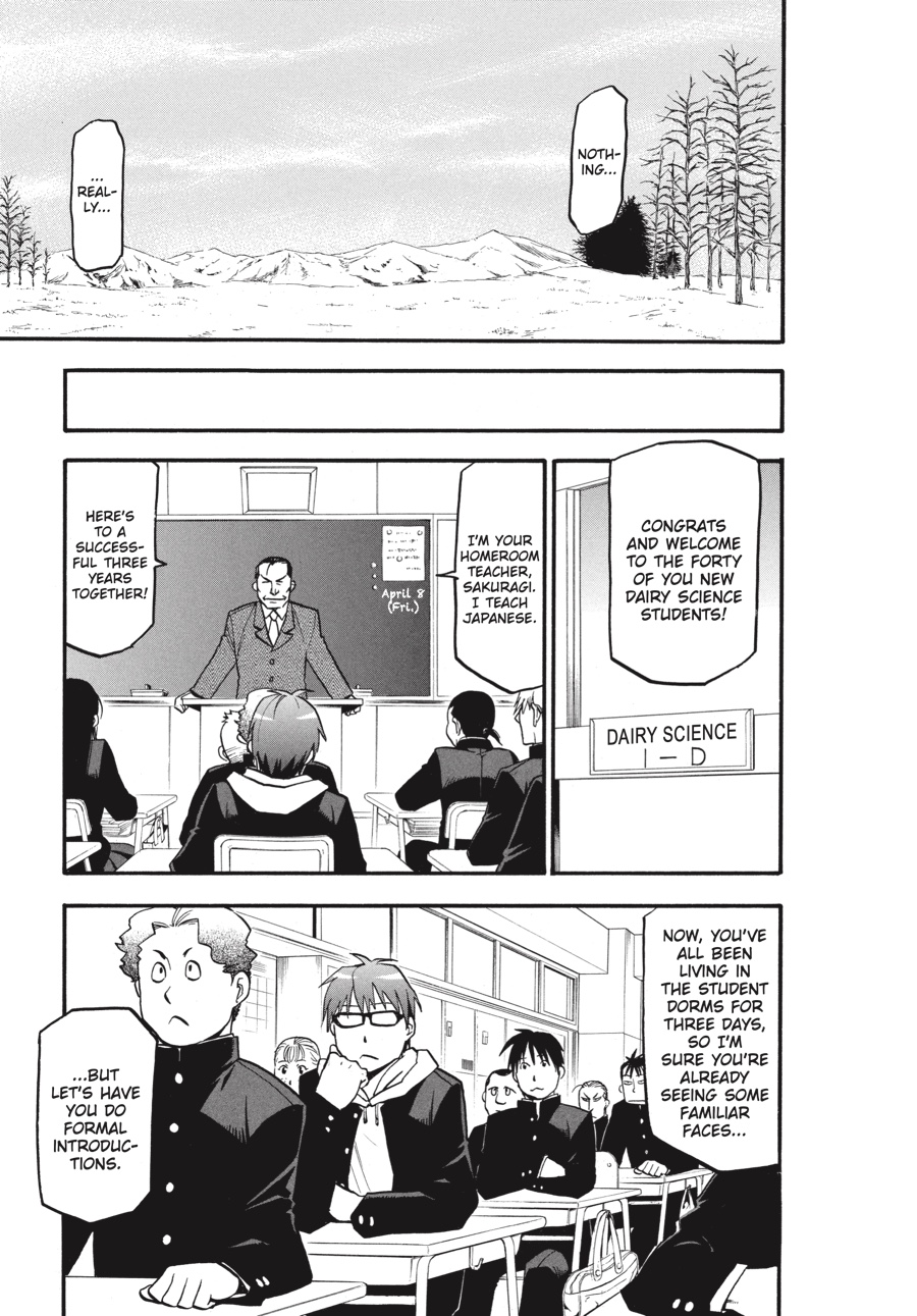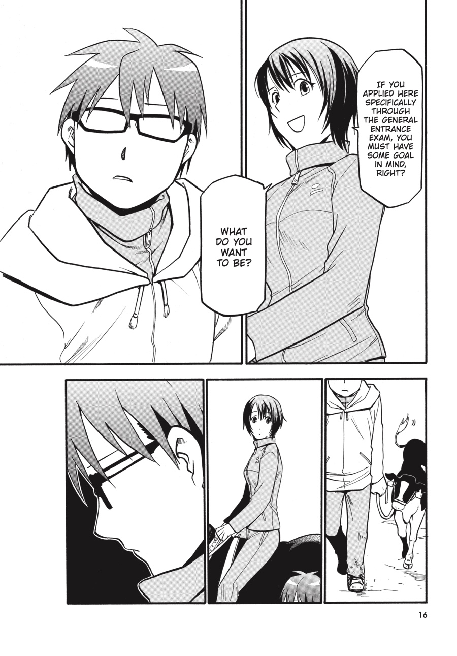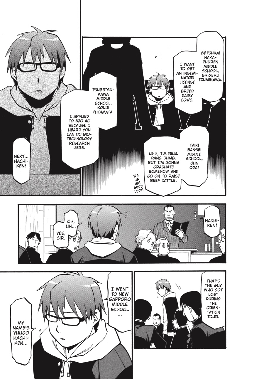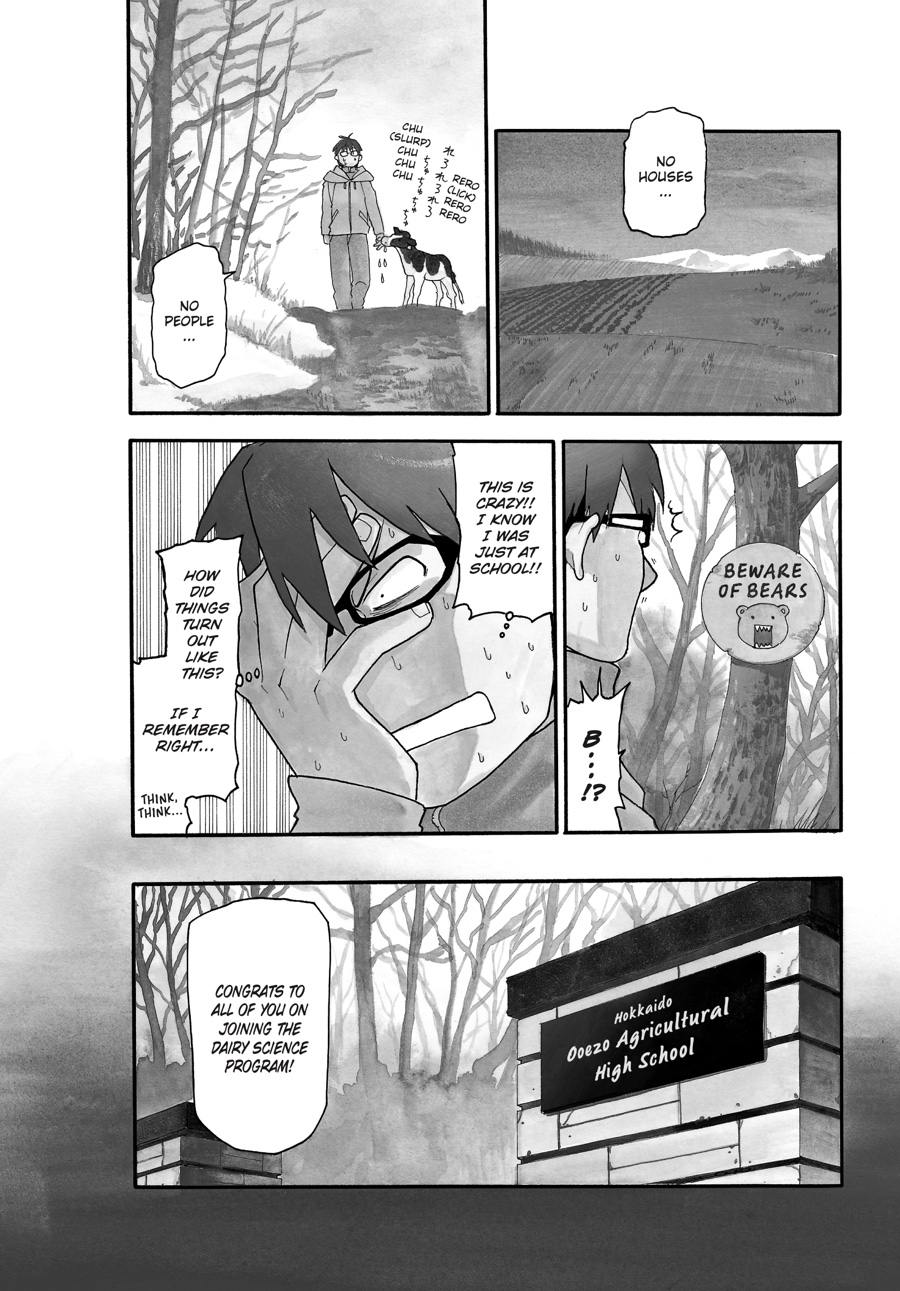 Defying the expectations of family and teachers, Yuugo Hachiken chooses to leave the city and enroll at Ooezo Agricultural High School. Having always been at the top of his class, Yuugo assumes a rural school will be a breeze, but mucking out stables, gathering eggs, and chasing errant calves takes a lot out of him-and fills him with something he's never experienced before. Surrounded by endless fields and fresh air, Yuugo discovers a new connection to the land and to life...Springtime begins at Ezo AG!!