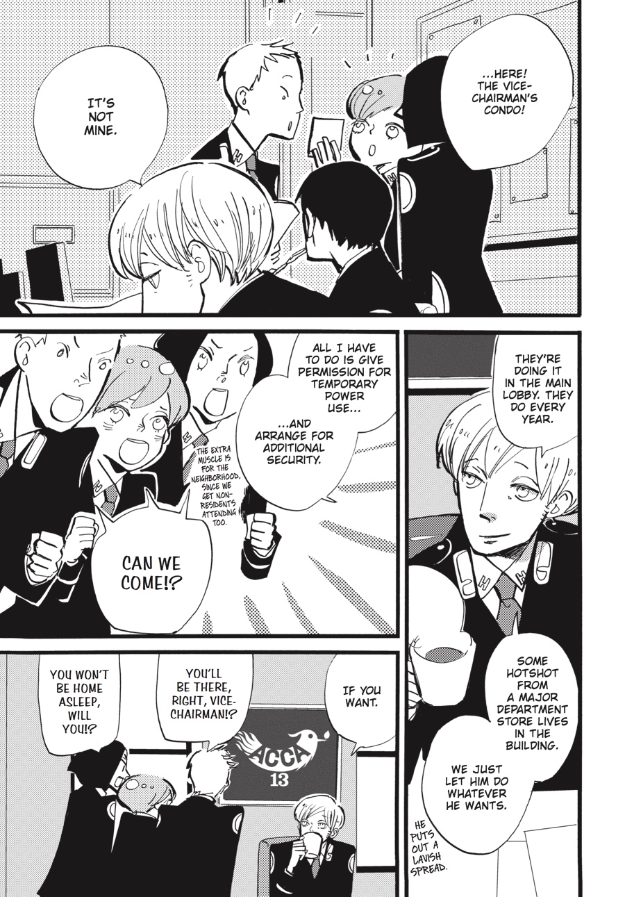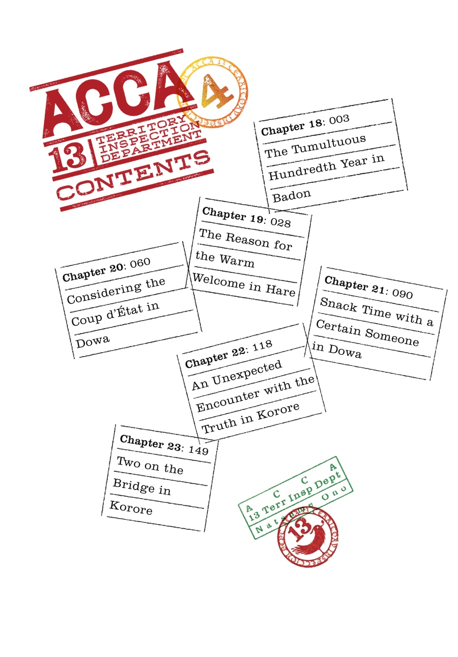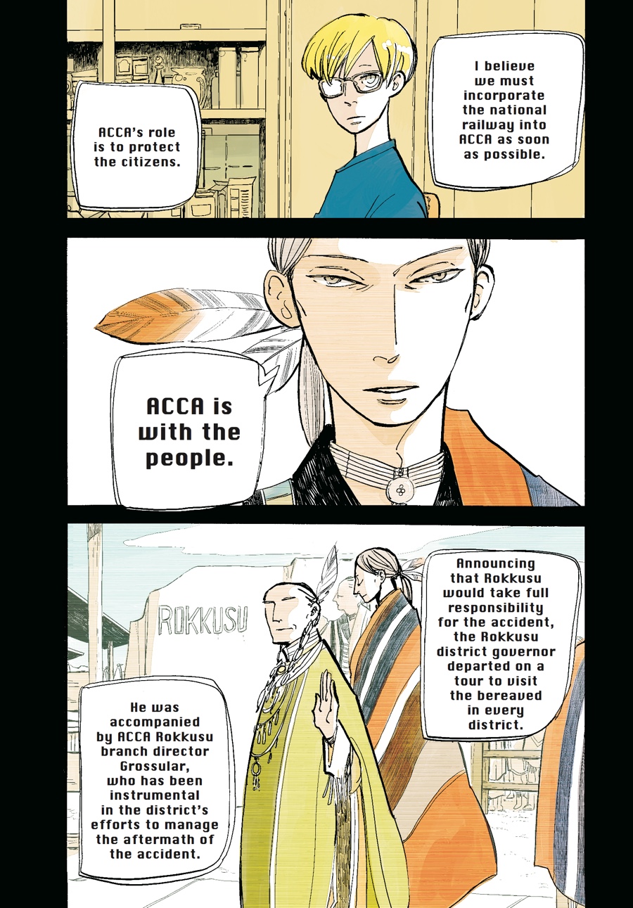 Under a cloud of suspicion, ACCA agent Jean Otus continues auditing the districts of Dowa, collecting both intel and lavish meals along the way. But with Jean and Director General Mauve passing each other like ships in the night, will anything come of his efforts? Meanwhile, the reason behind the royal palace's curious obsession with Jean's little sister, Lotta, finally becomes clear...