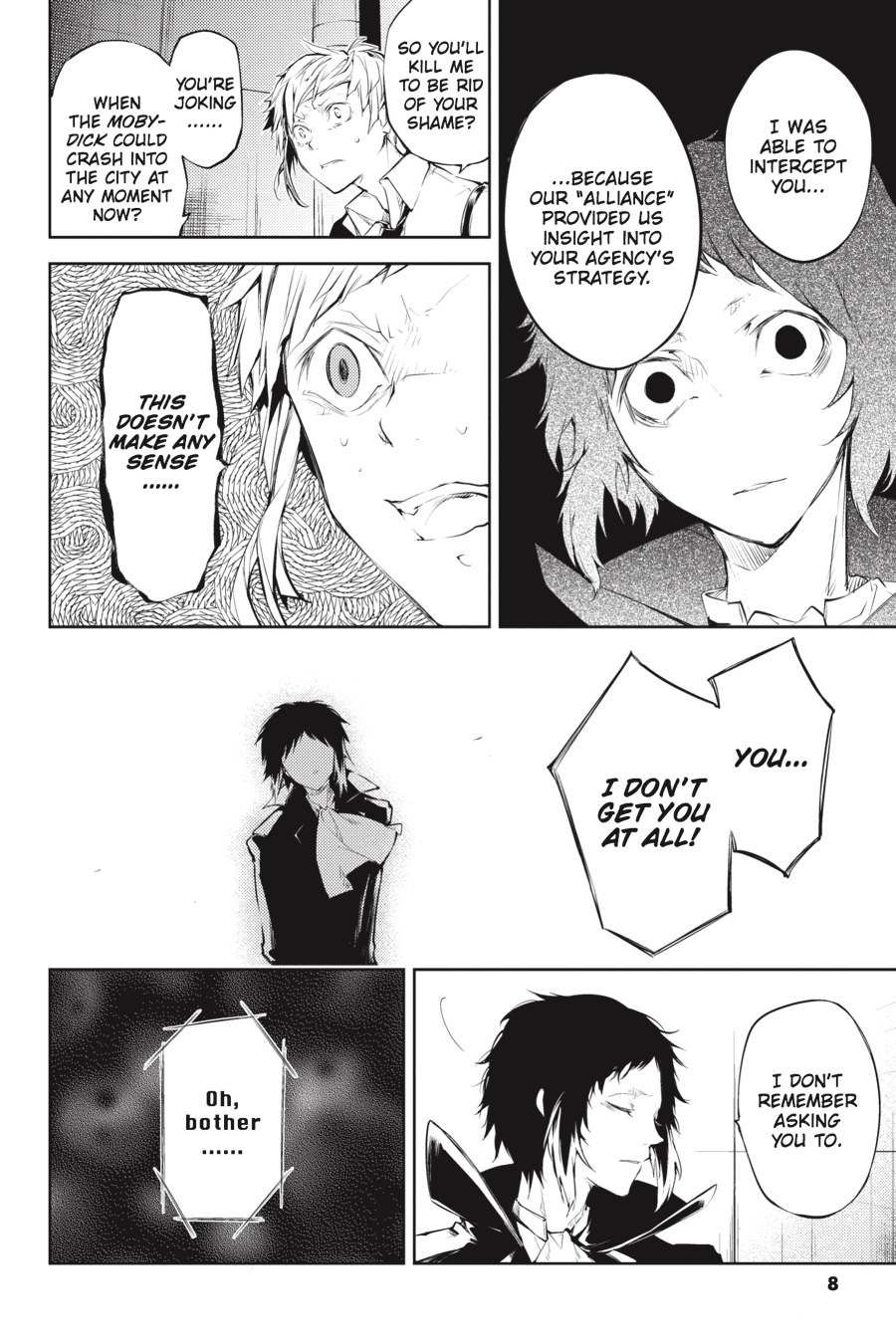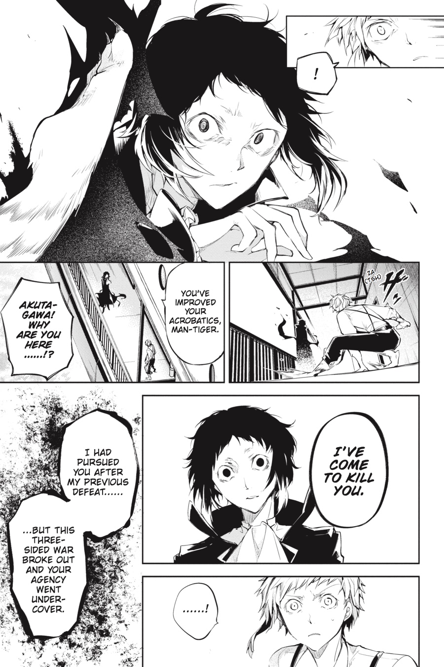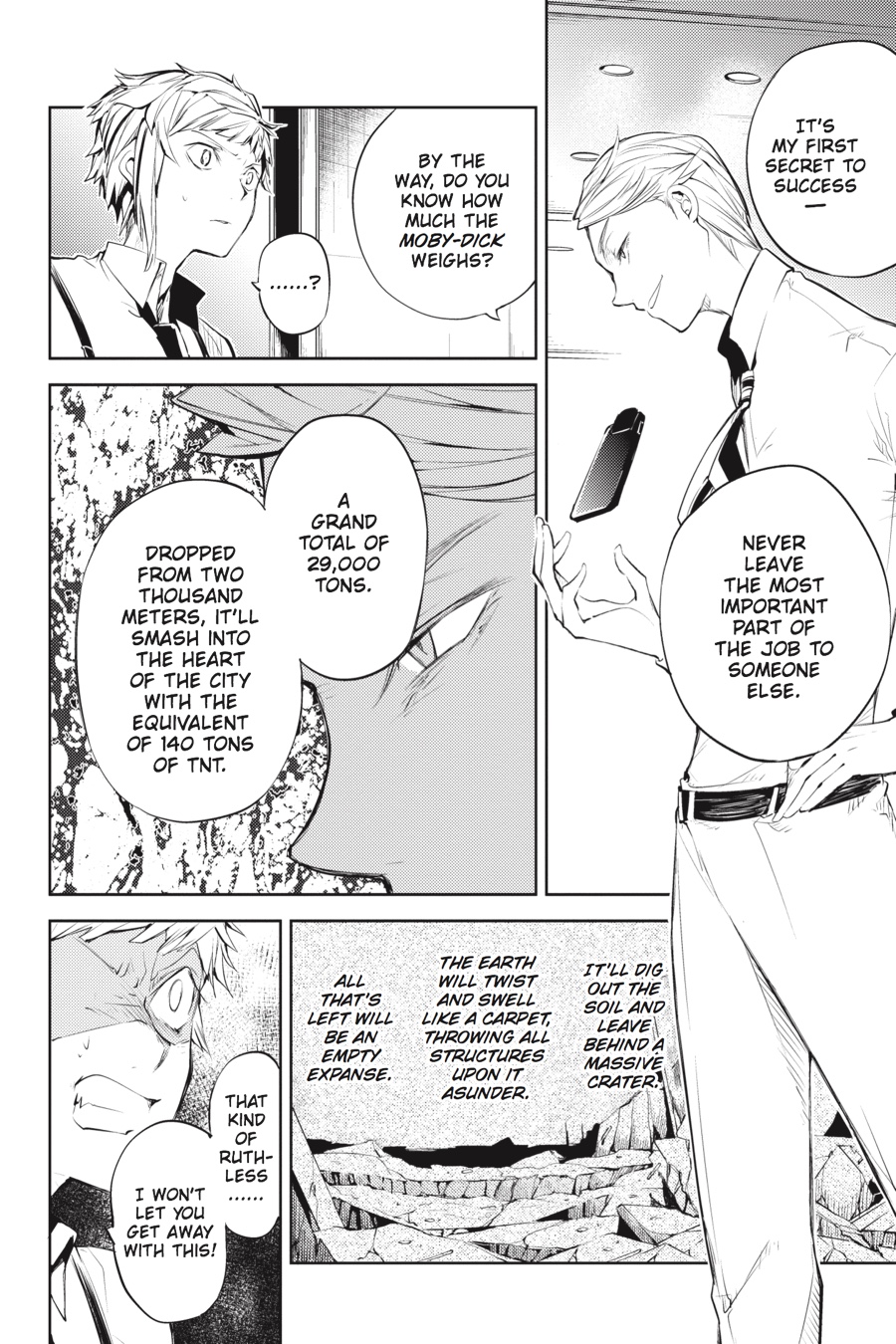 With only minutes to stop the Moby-Dick from crashing down on Yokohama, Atsushi encounters his nemesis, Akutagawa! However, the face-off turns into a three-man battle when Fitzgerald enters the fray. Can Atsushi and Akutagawa counter the Guild leader's extravagant ability in time to stop the white whale's descent...?!