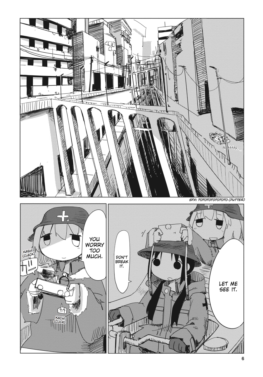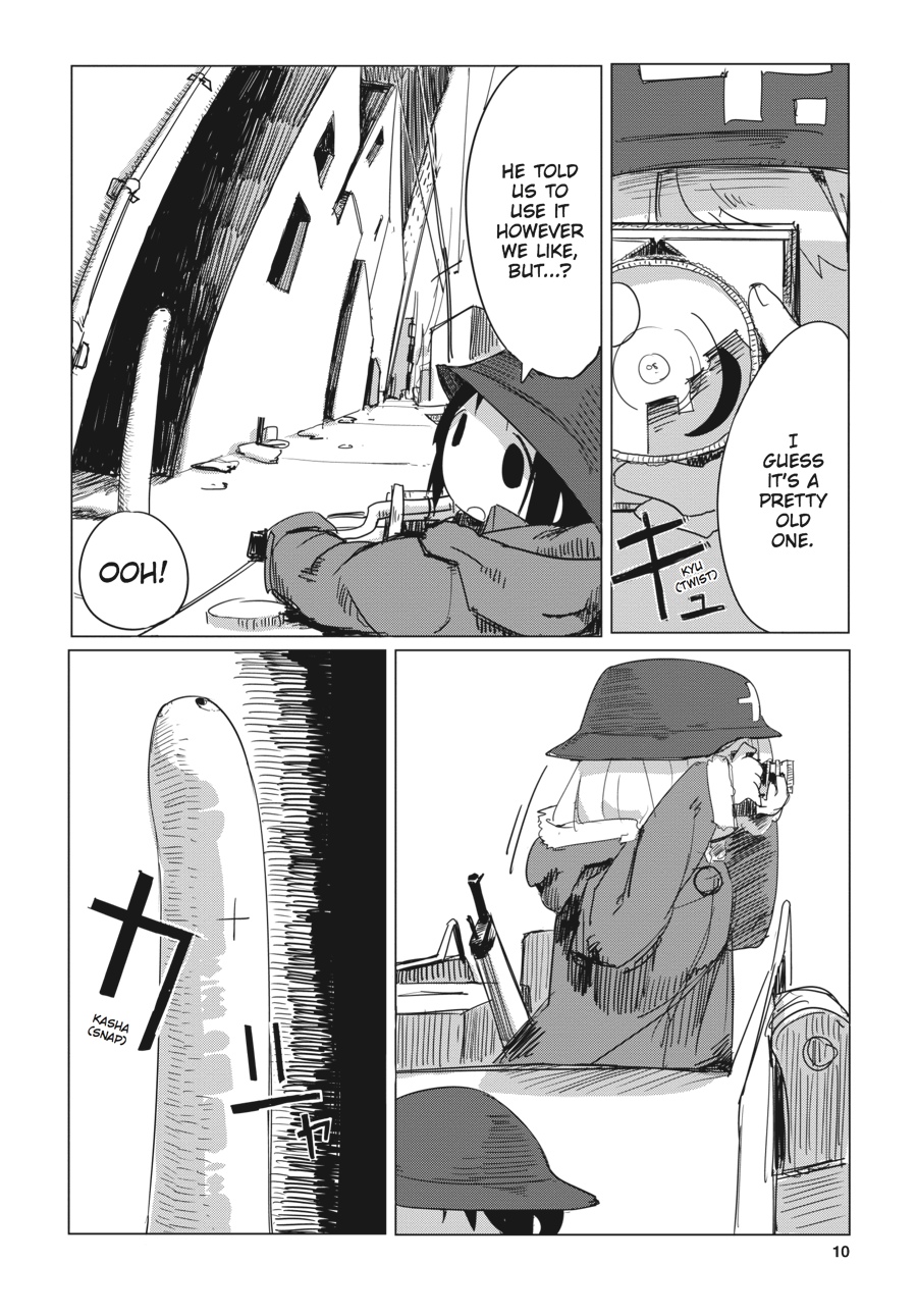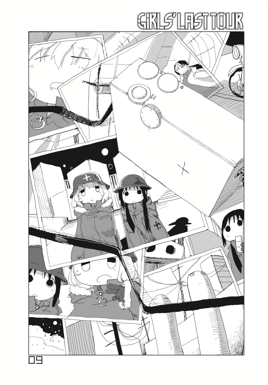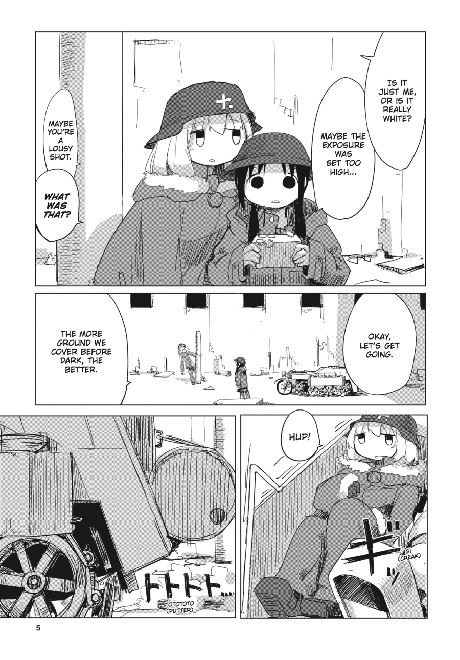 Distant lights illuminating the darkness pique Chito's and Yuuri's curiosity, so the two hop aboard their beloved Kettenkrad and head for the horizon. What they find may not be what they were looking for, but the surviving fragments of civilization are enough to keep them going. There's no telling what other strange surprises lie in store as their journey continues...