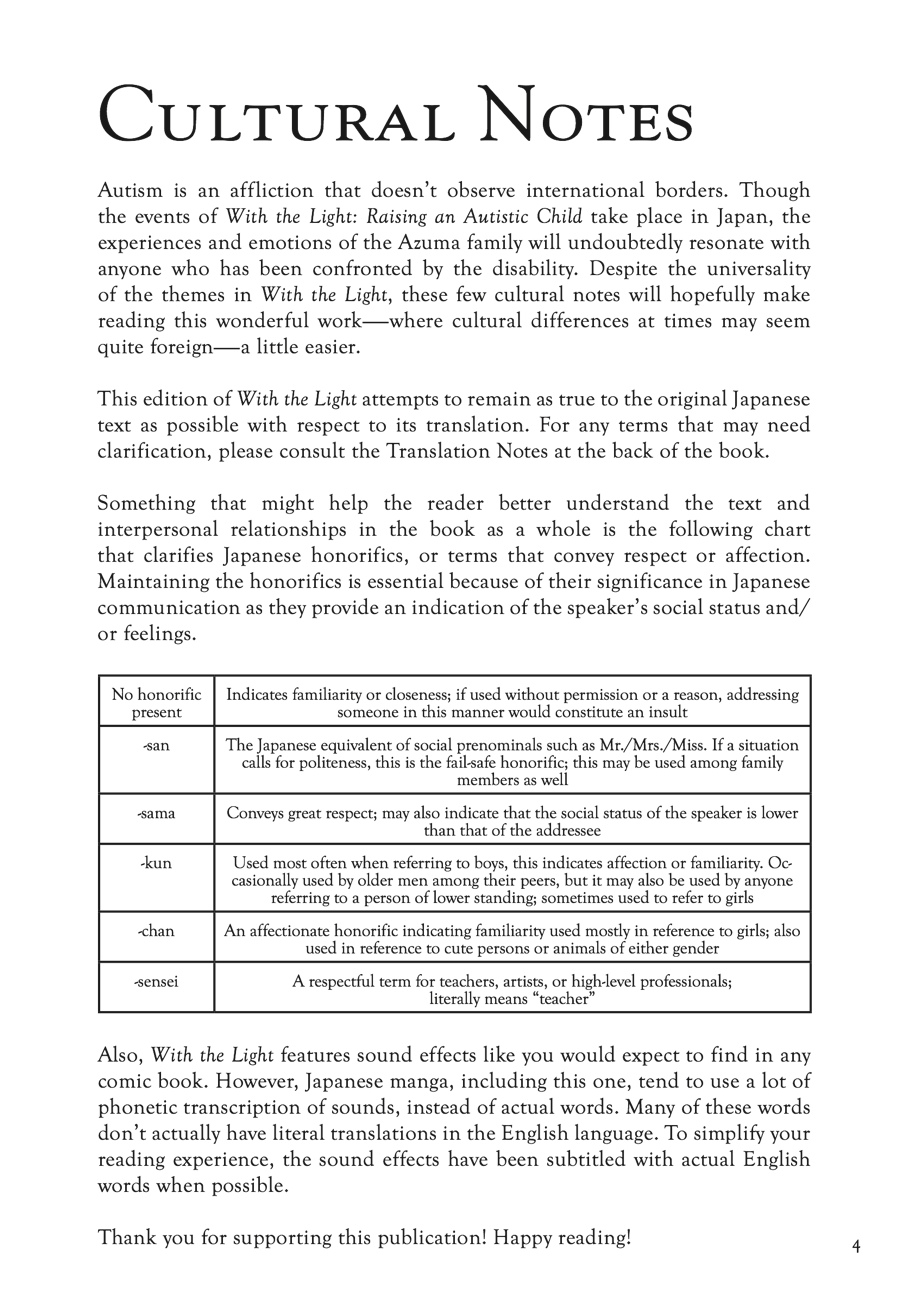 While trying to create a place in society for her autistic son, Hikaru, has been an uphill battle, Sachiko Azuma has long known that perhaps the toughest place to find acceptance for him is within her own family. Despite some progress made, Sachiko's mother-in-law still treats her grandson as a nuisance and sees him in many ways as inferior to his little sister, Kanon. Now that the Azuma family has moved into Masato's childhood home, Sachiko must not only adapt to life with her mother-in-law - she also must help Hikaru, whose developmental disabilities make it notoriously difficult for him to accept changes to his routine, adapt to this new living situation and a new school. As Sachiko tries to balance caring for Kanon and Hikaru in the face of her mother-in-law's constant disapproval, will the Azuma family emerge from what seems like the darkest of tunnels into the light? Told in completed chapters as well as unfinished pages that the creator drew while battling a long illness, this final volume of With the Light serves as a legacy to the late Keiko Tobe's inspiring dedication to bring to light the hardships and joys of raising an autistic child for readers around the world.