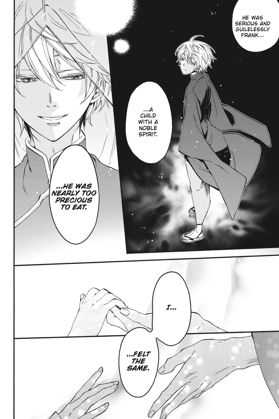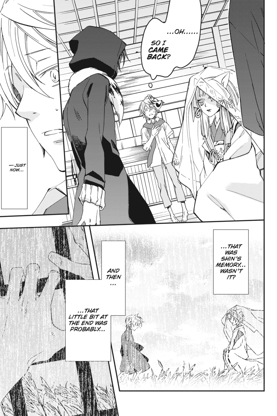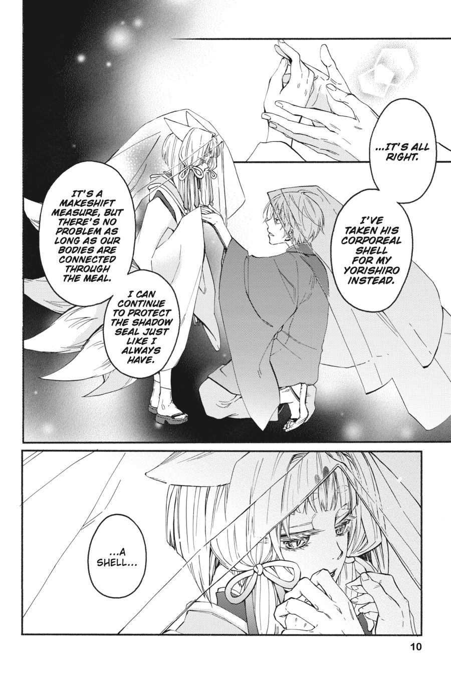 Yue makes for the shrine to rescue the captive Tsubaki. But there, he is met with the past of the man calling himself Sagano. Once upon a time, shrine master Mikoto herself saved Sagano's life when he went by the name "Akashi." But as a result, Sagano lost everything dear and had to stand by as his body became the vessel for Shin, the leader of the ayakashi. Now intent upon vengeance, Sagano raids the shrine and challenges Mikoto to a duel! Meanwhile, Yue decides on the path he must take! As the humans and ayakashi clash, the vagaries of fate accelerate...