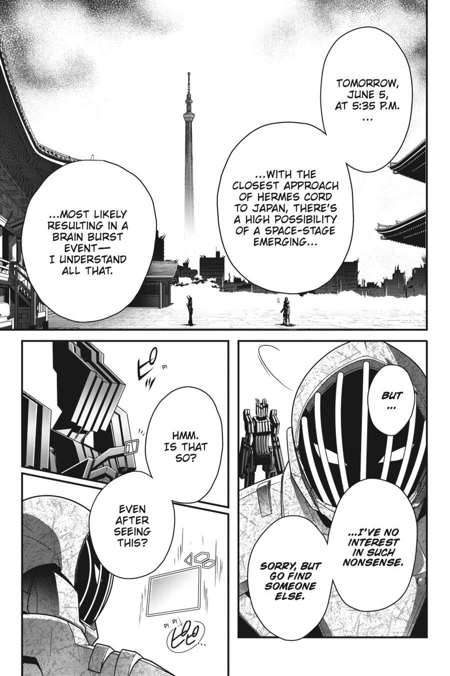 After meeting Sky Raker and learning about the Incarnate System, Haruyuki manages to defeat the merciless Dusk Taker, Seiji Noumi in real life. After ending Seiji's time in Brain Burst, Haru and friends look toward their next challenge: the Hermes Cord Race!
