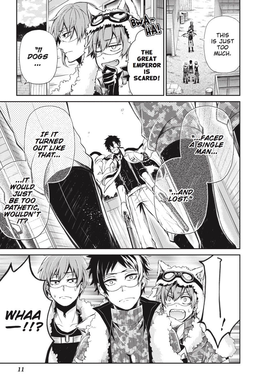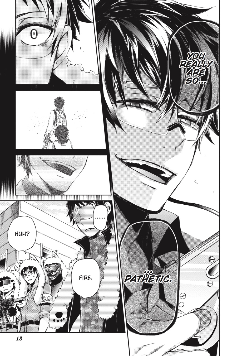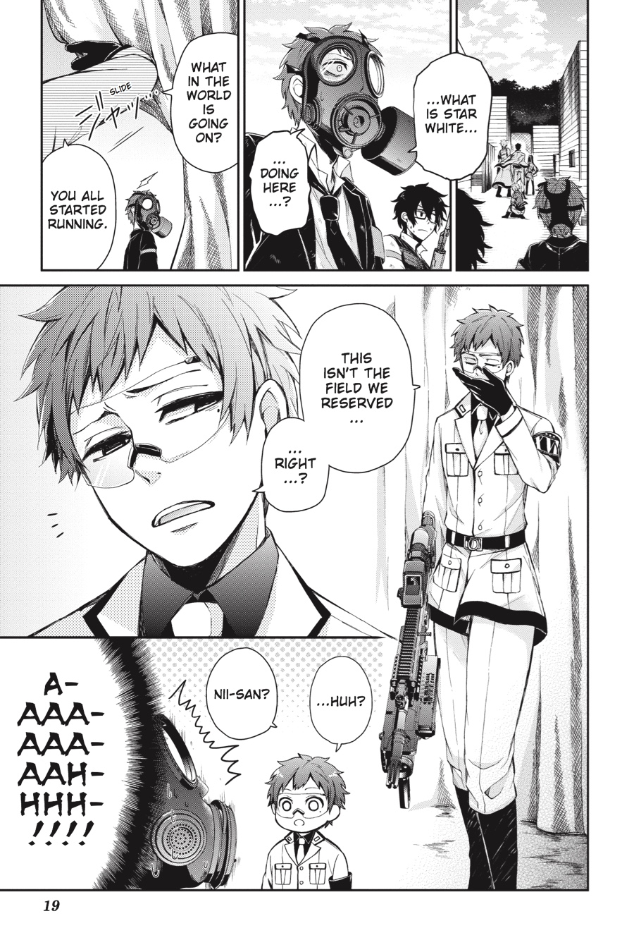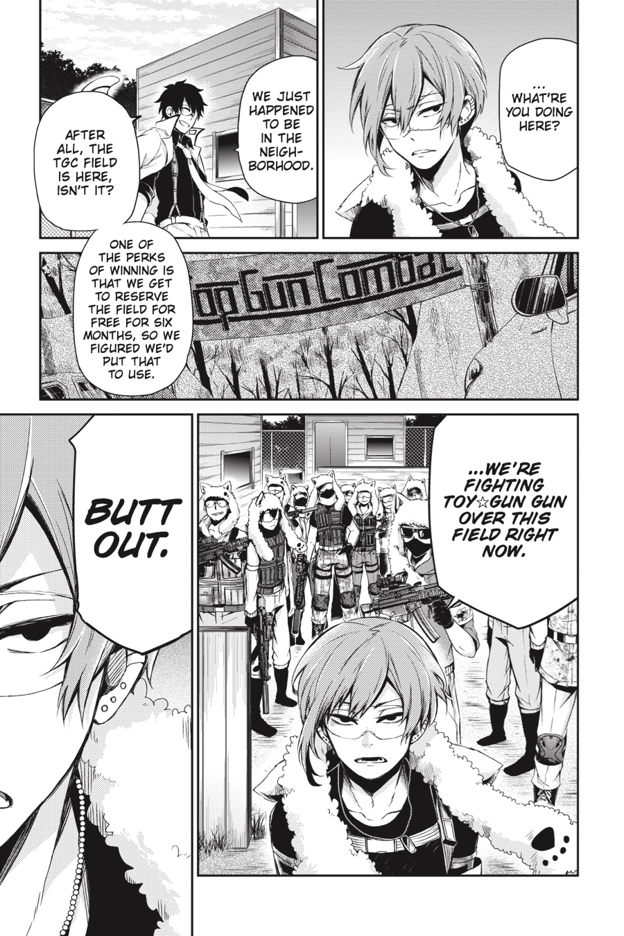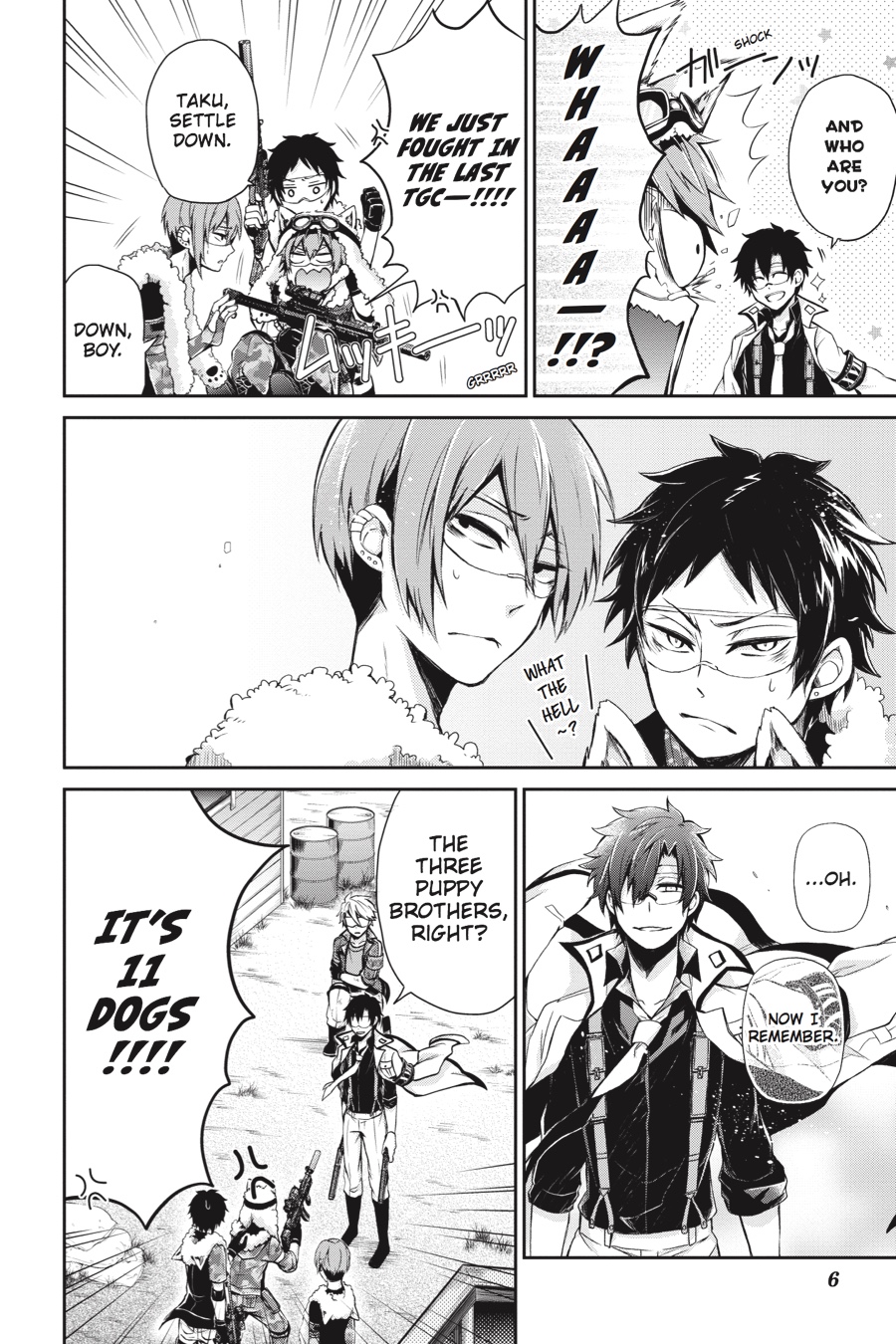 "We, Star White, will stand with Toy Gun Gun." Star White suddenly shows up to join in on the fight against 11 DOGs. When Midori suggests that they temporarily team up, Matsuoka agrees to the plan. What will come of the counter battle that faces the two-man cells of Tachibana and Ichi, Yukimura and Fujimoto, and Matsuoka and Midori!? And what kind of difficult past does Matsuoka share with Midori and Yukimura...?