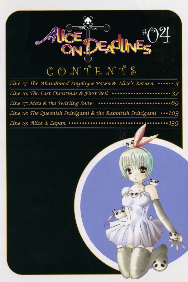 Siblings! Brainwashing! True love?! It's Christmas Eve, but Lapan has nothing saintly in mind for Alice and company! When back-to-back battles cut his pervy party short and members of Tsurukame descend upon the scene, will Lapan finally repent his skirt-chasing ways? And as Alice tries to come to grips with a revelation about Lapan's past, will she be able to break out of her shell (with the help of Lapan's groping hands)? Find out in the exciting conclusion of Alice on Deadlines 4!