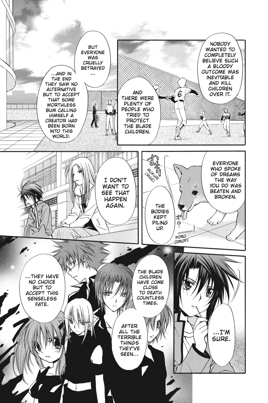 Hizumi's "happy high schooler" facade begins to crumble as Ayumu confronts Kirie about Hizumi's cheerful acceptance of the fate that awaits him. Big brother Kiyotaka has always cast a shadow over Ayumu's life, but what kind of despair has Hizumi known that would make him so ready to die? Hizumi still hasn't laid all of his cards on the table, and his next play could take out one of the Blade Children for good.