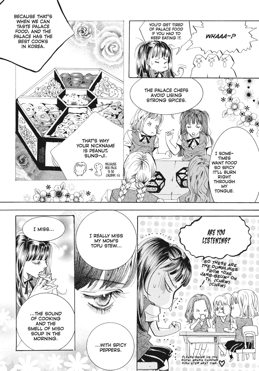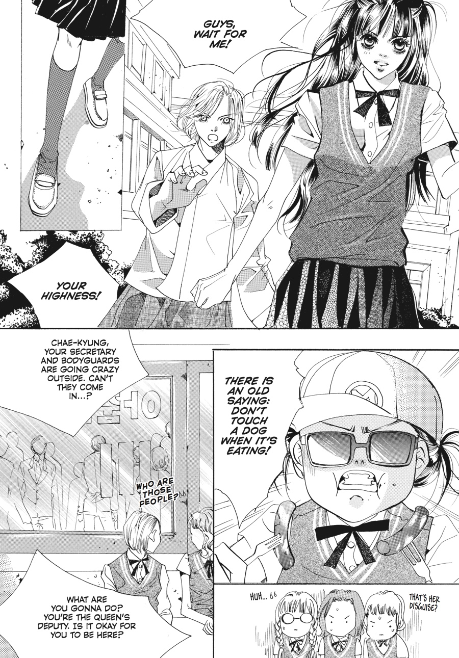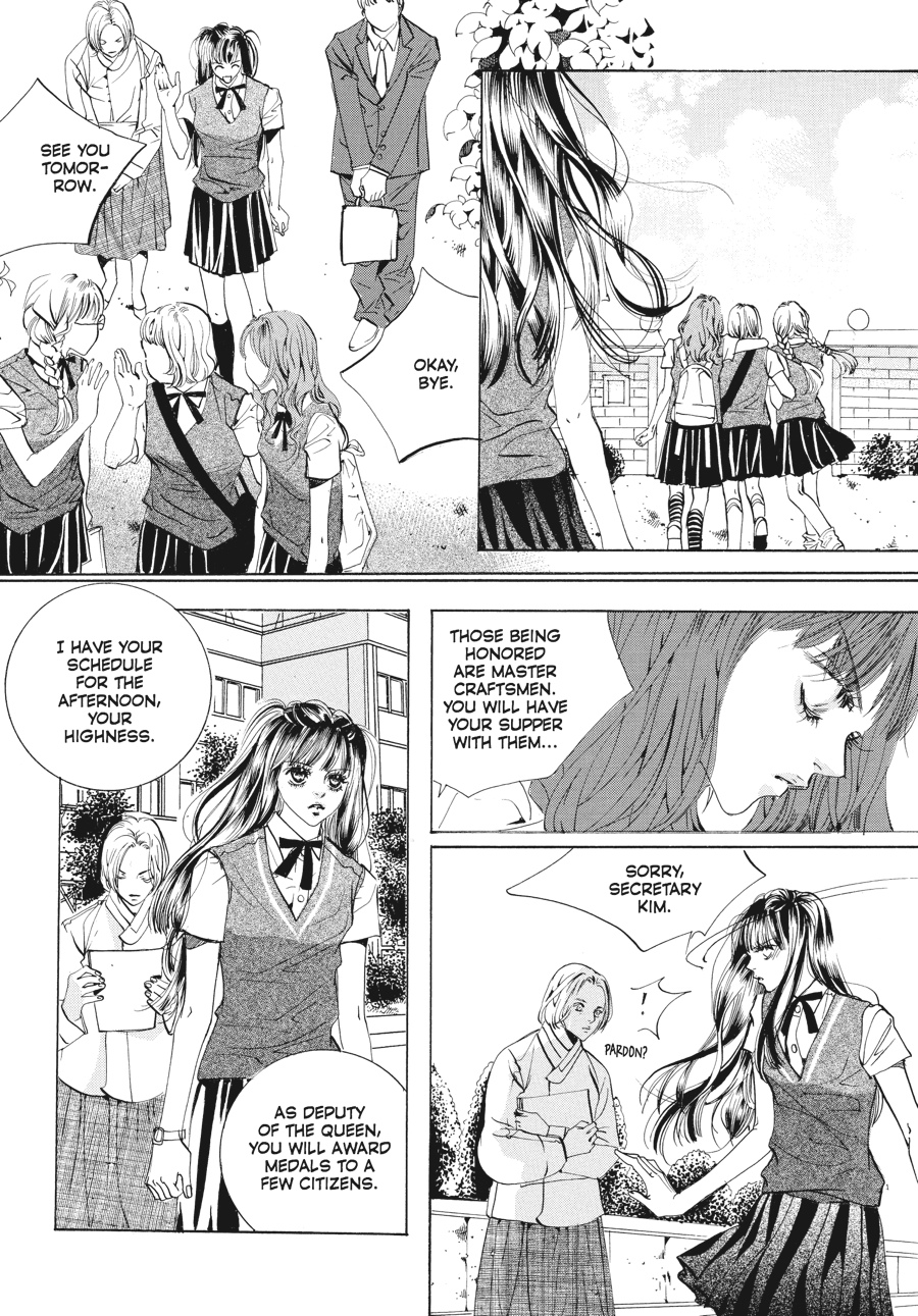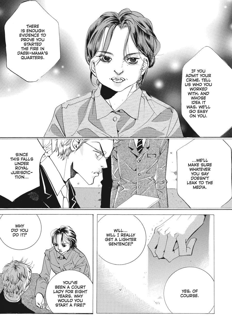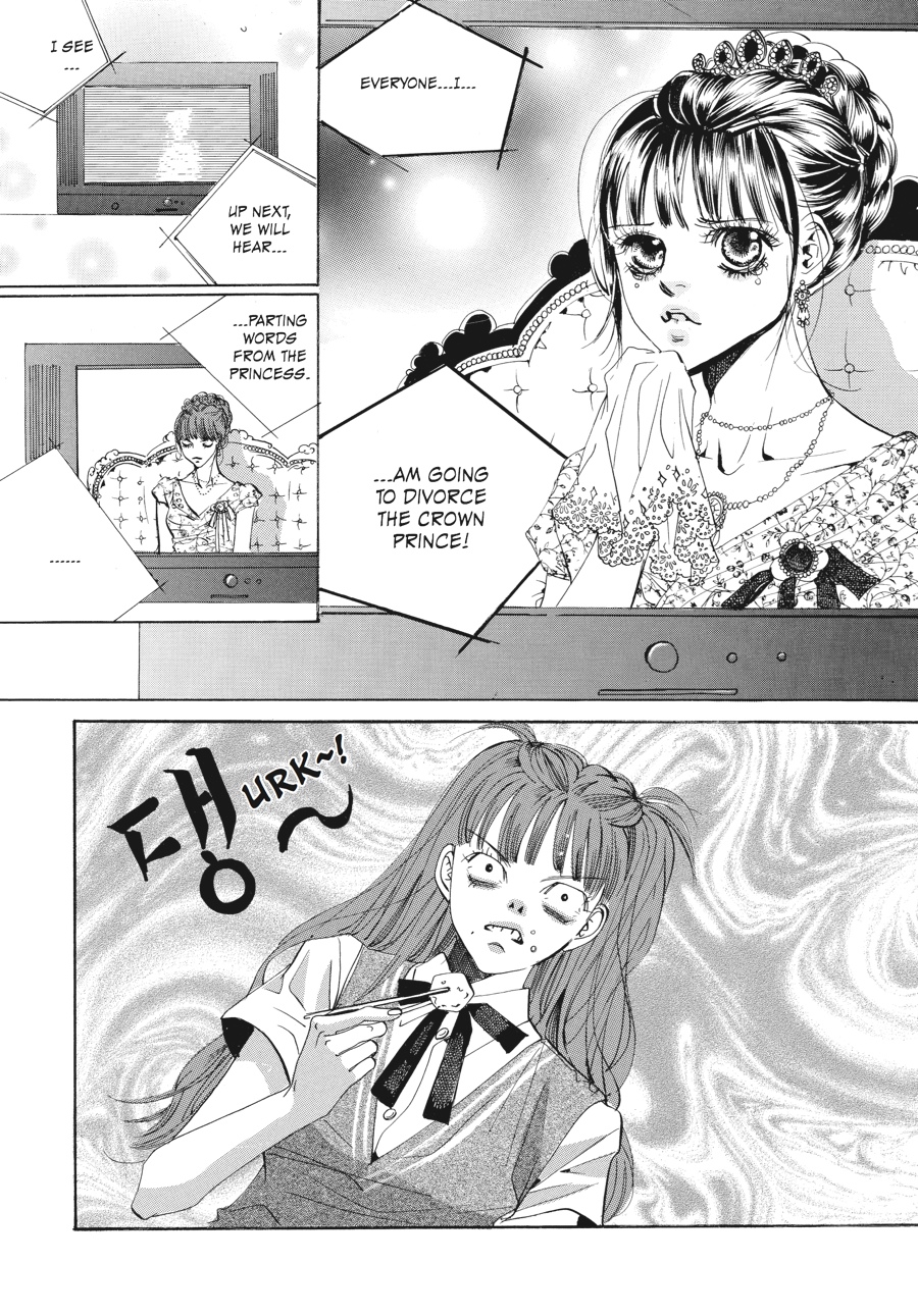 Waging war from the shadows, Yul and his mother, the Daebi, continue to turn the screws on Korea's royals - and the first casualties in their sights are Crown Prince Shin and Chae-Kyung! Convinced by Yul that an upcoming television interview will be her last chance to talk divorce, Chae-Kyung is distracted from the larger picture by her feelings for her husband and the thought of freedom from oppressive palace life. Meanwhile, as the Daebi fans the flames of suspicion that surround Shin in the royal arson case, the future king finds himself on the verge of losing his once-guaranteed position. But is a royal pregnancy the answer to saving the crown prince's sullied reputation?! The Queen Mother seems to think so, as she packs off Chae-Kyung and Shin to an isolated palace to consummate their marriage. However, with their relationship running equally cold and hot these days, divorce and romance seem to be a toss-up for the crown princess! Which will Chae-Kyung choose?!