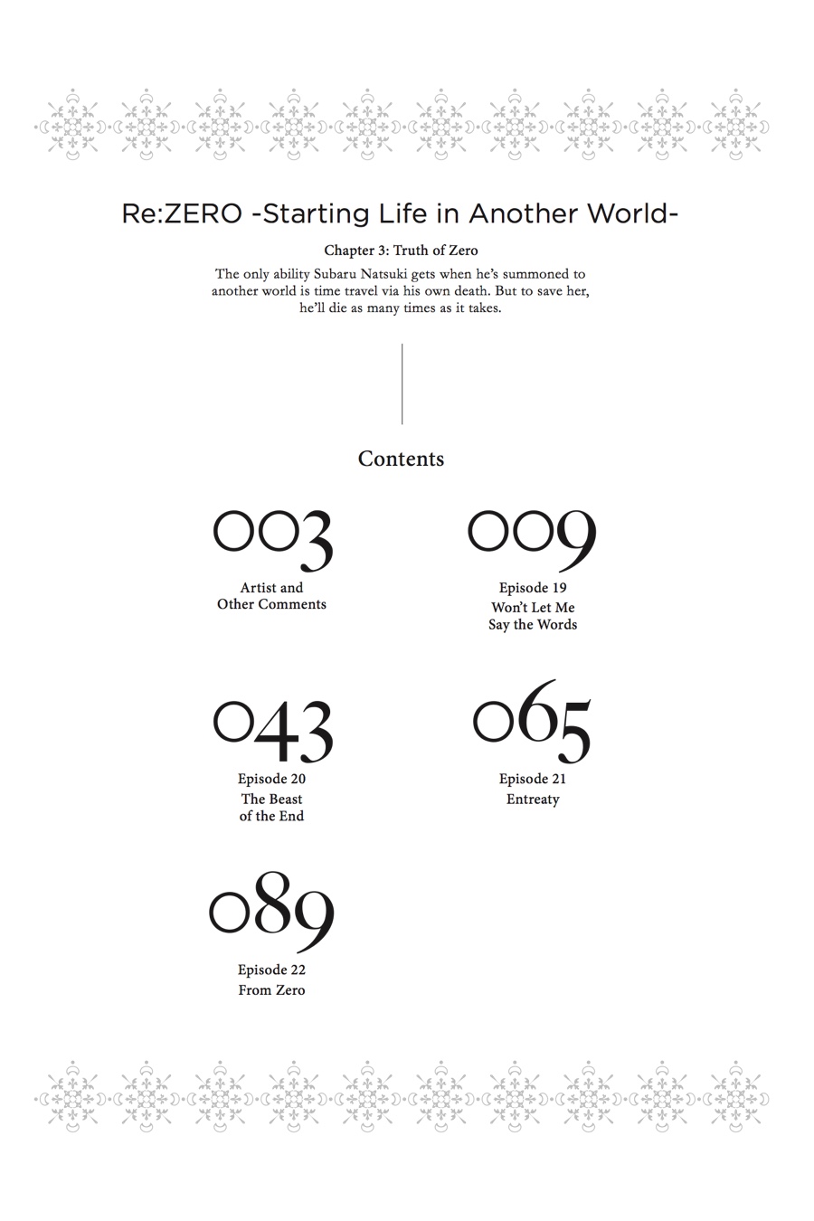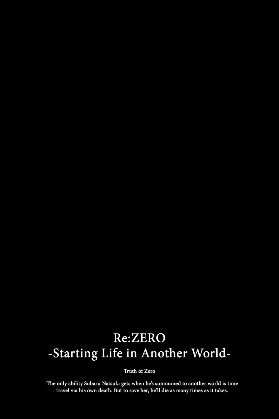 Let us start over from here. From one...No. From zero! After a near-fatal encounter with the White Whale, Subaru awakens in Roswaal Manor distraught. As the very memory of Rem fades from the world, Subaru attempts to fight through the witch's curse to reveal his "Return by Death" ability in the hopes of conveying the gravity of the danger before Emilia. Subaru believes he is ready to suffer the consequences, but the price for telling the truth is crueler than he could have imagined...